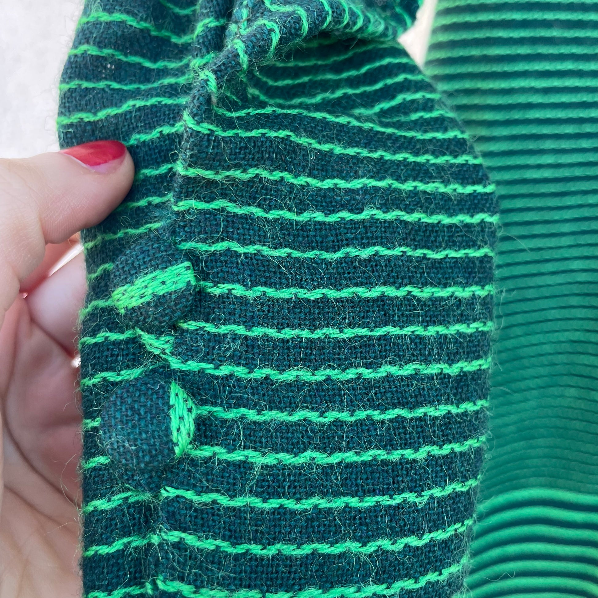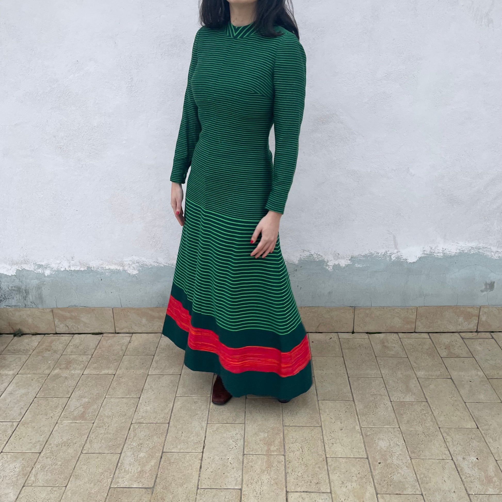 Abito sartoriale anni 70 base verde con righe orizzontali. Manca il merceologico ma direi che è lana.