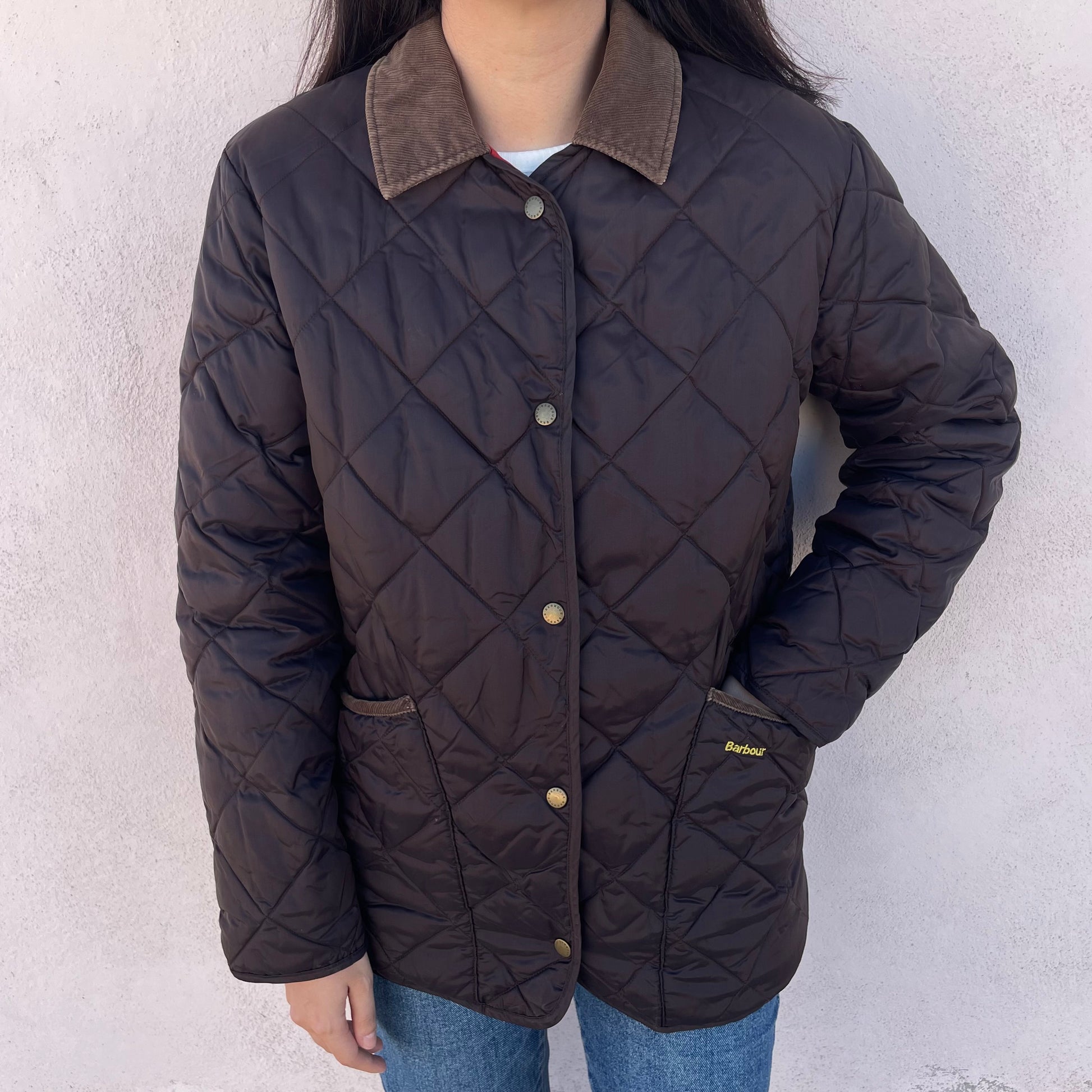 Barbour trapuntato color cioccolato. Colletto in velluto a coste. 100% poliammide.