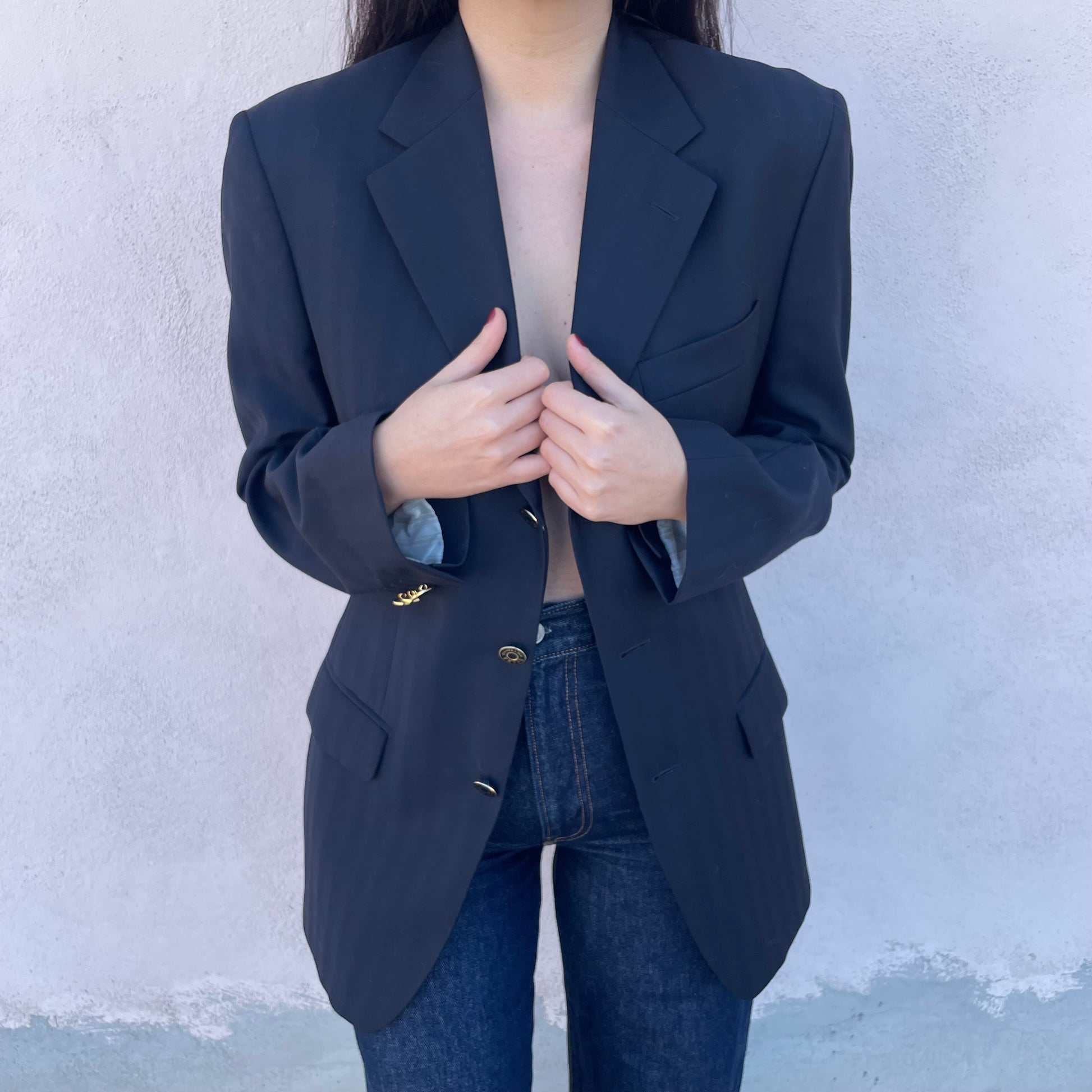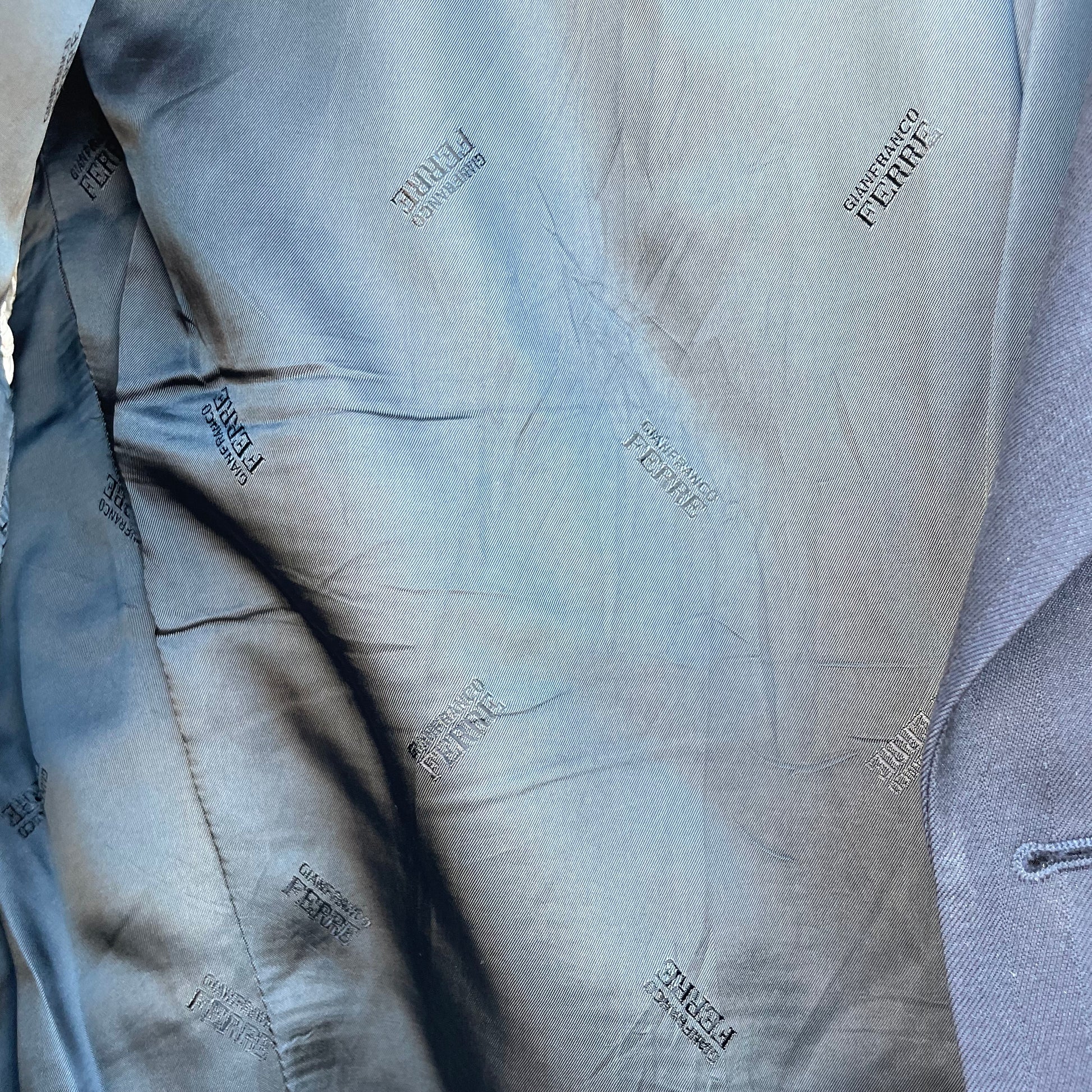 Blazer monopetto blu con trama verticale Gianfranco Ferré. Bottoni firmati. Manca il merceologico ma è in lana.