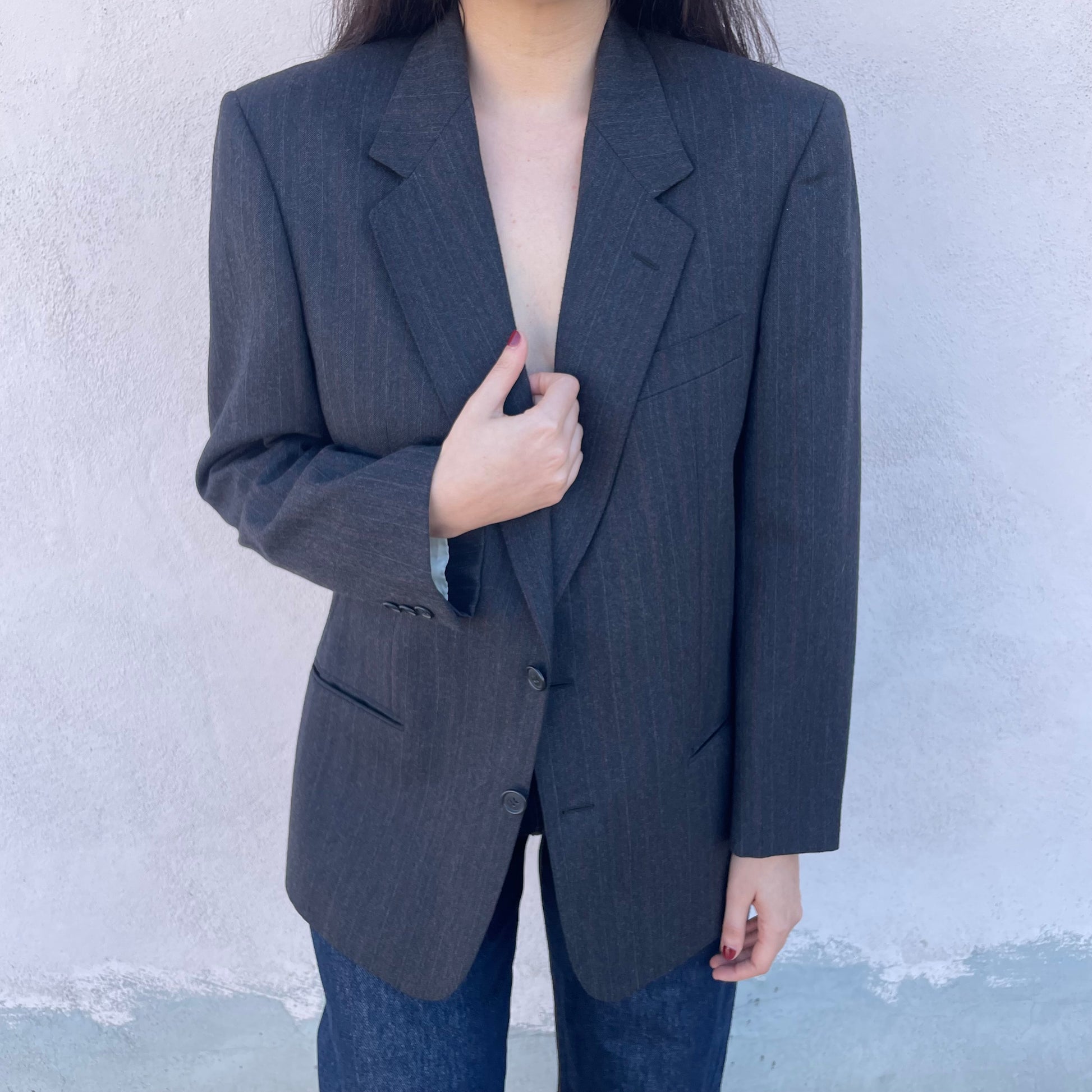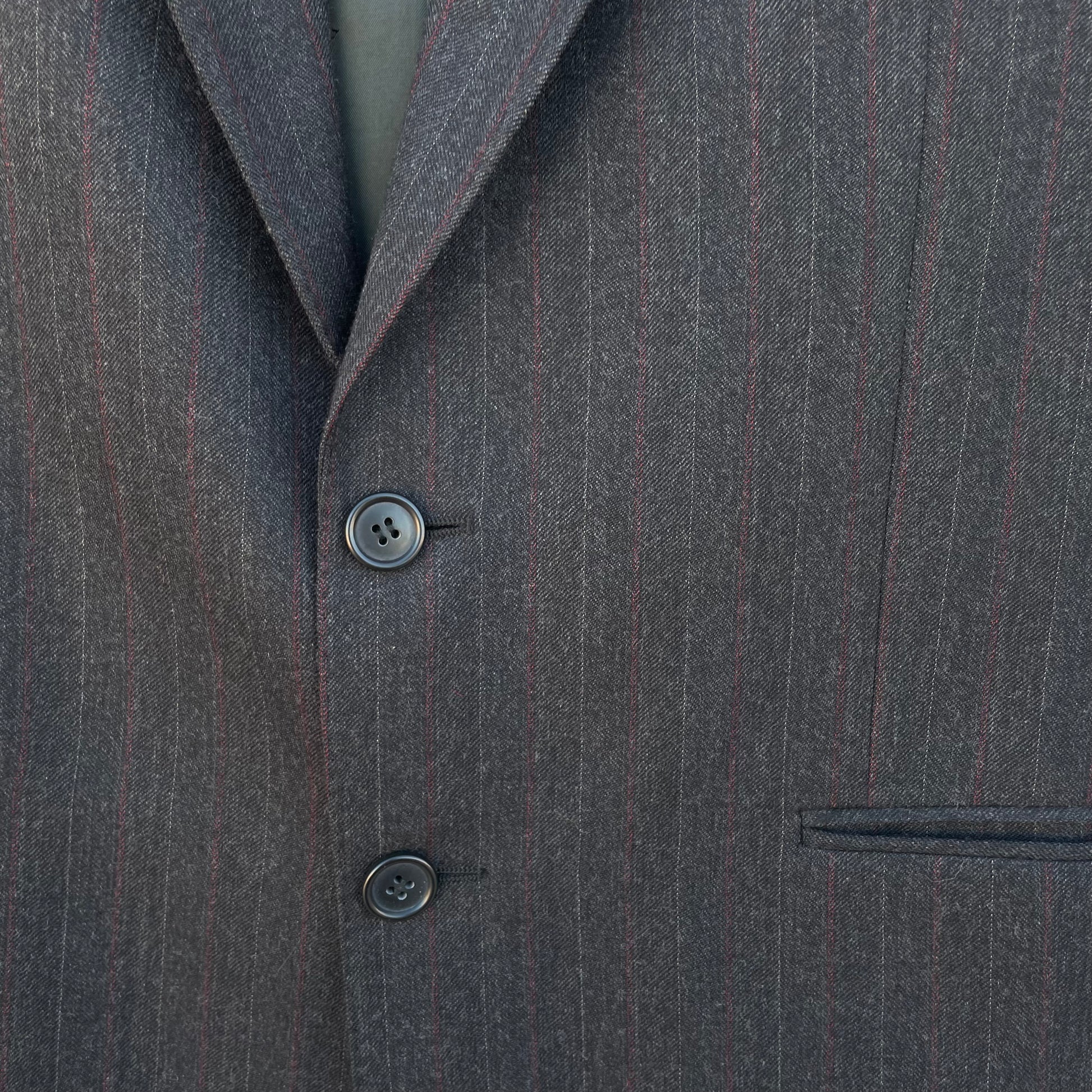 Blazer monopetto grigio con trama gessata bordeaux Valentino. Manca il merceologico ma è lana.