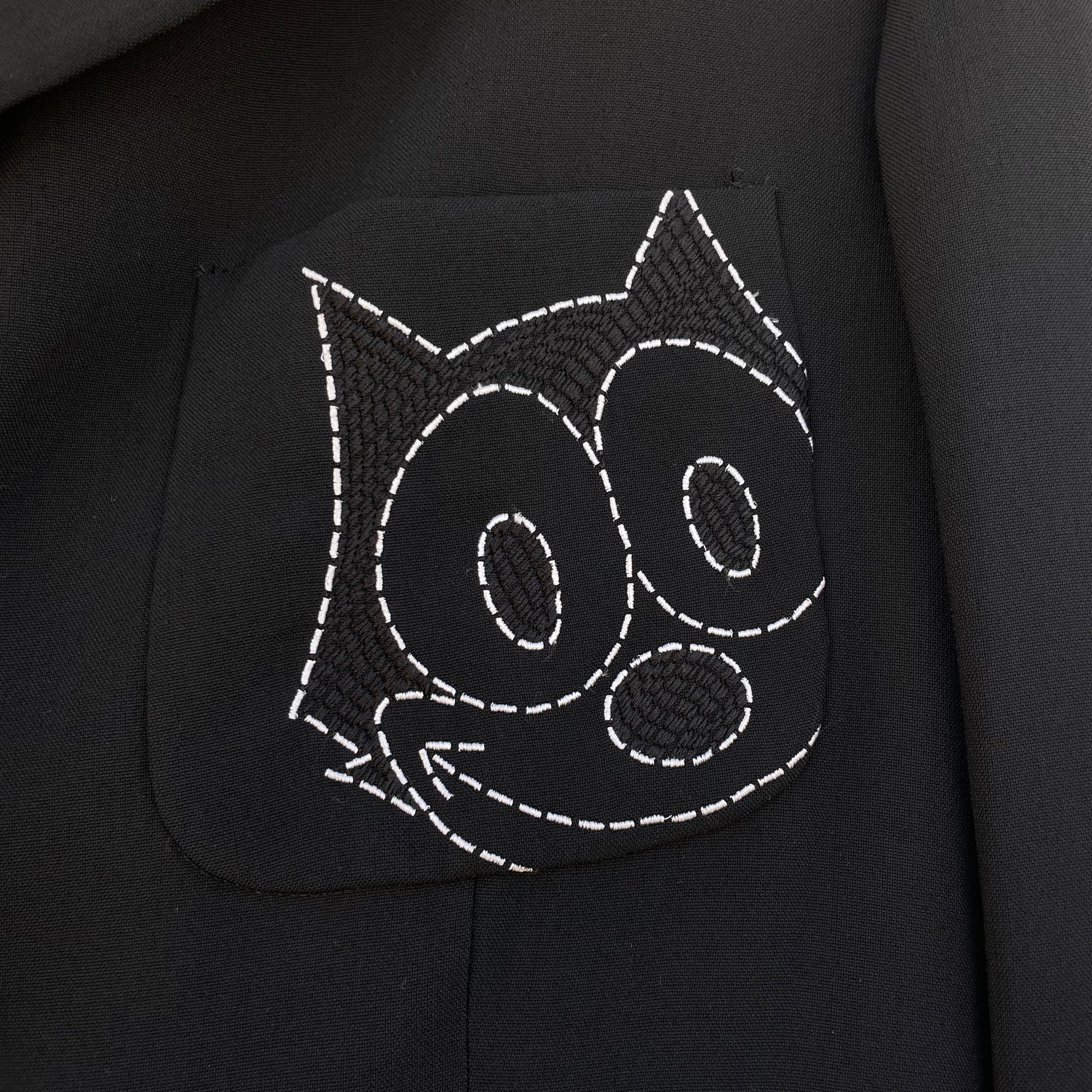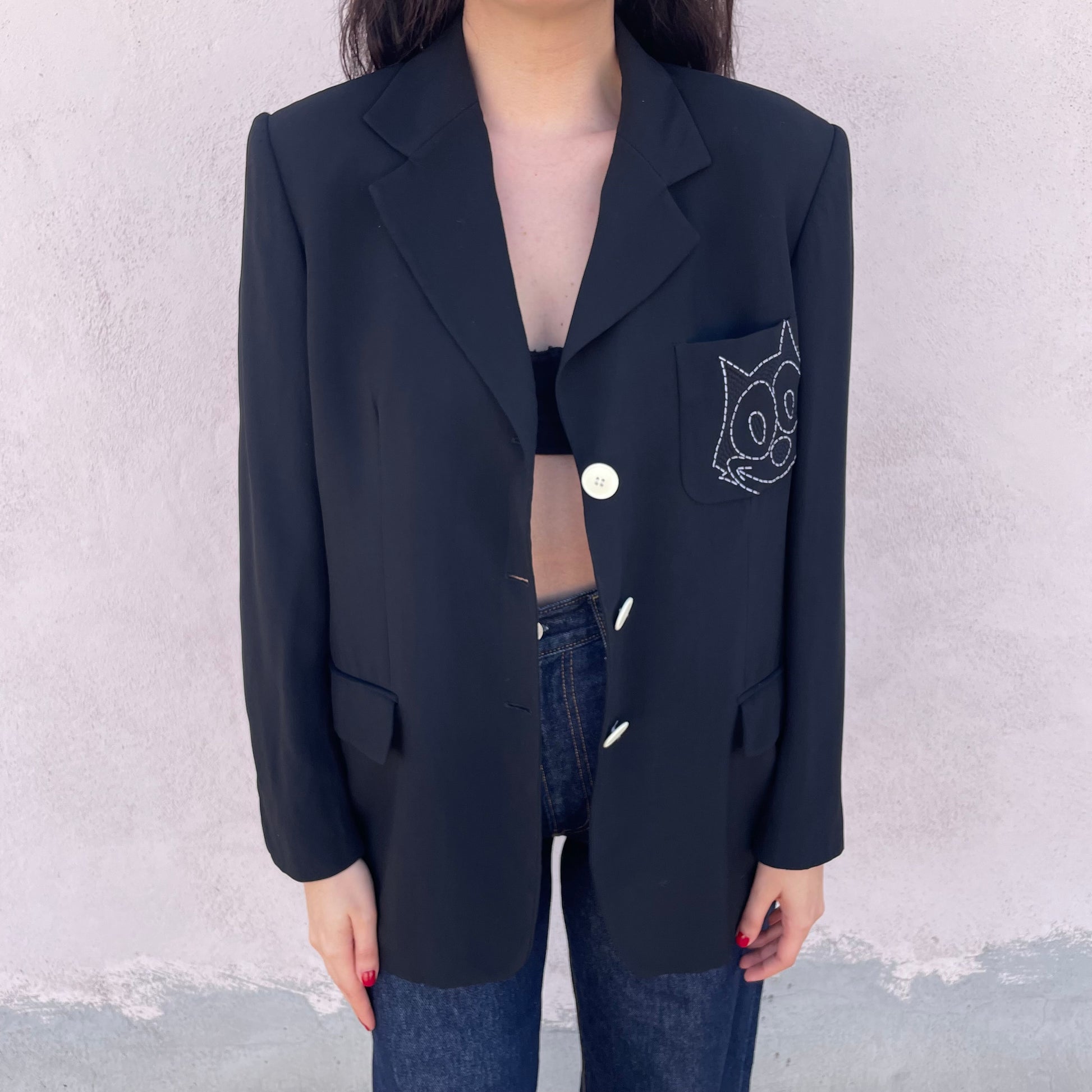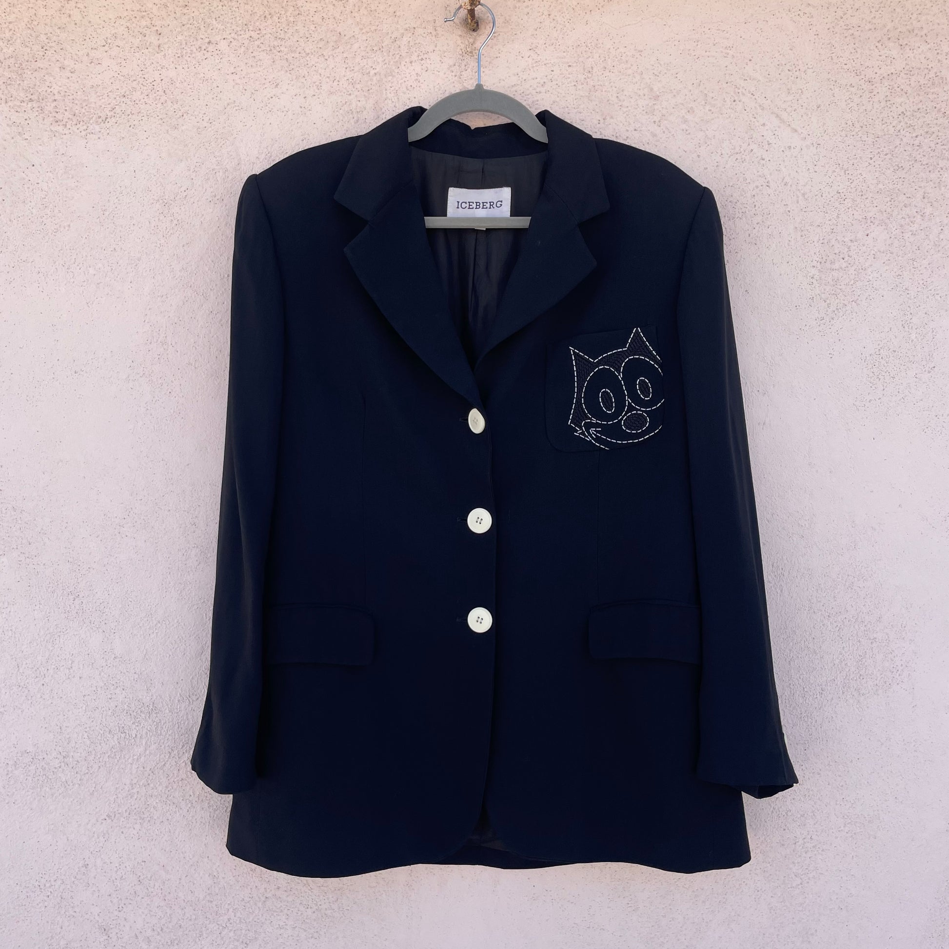 Blazer nero monopetto con Felix sul taschino Iceberg. 60% viscosa 32% lana vergine (fresco lana) 6% poli 2% cotone (primaverile).