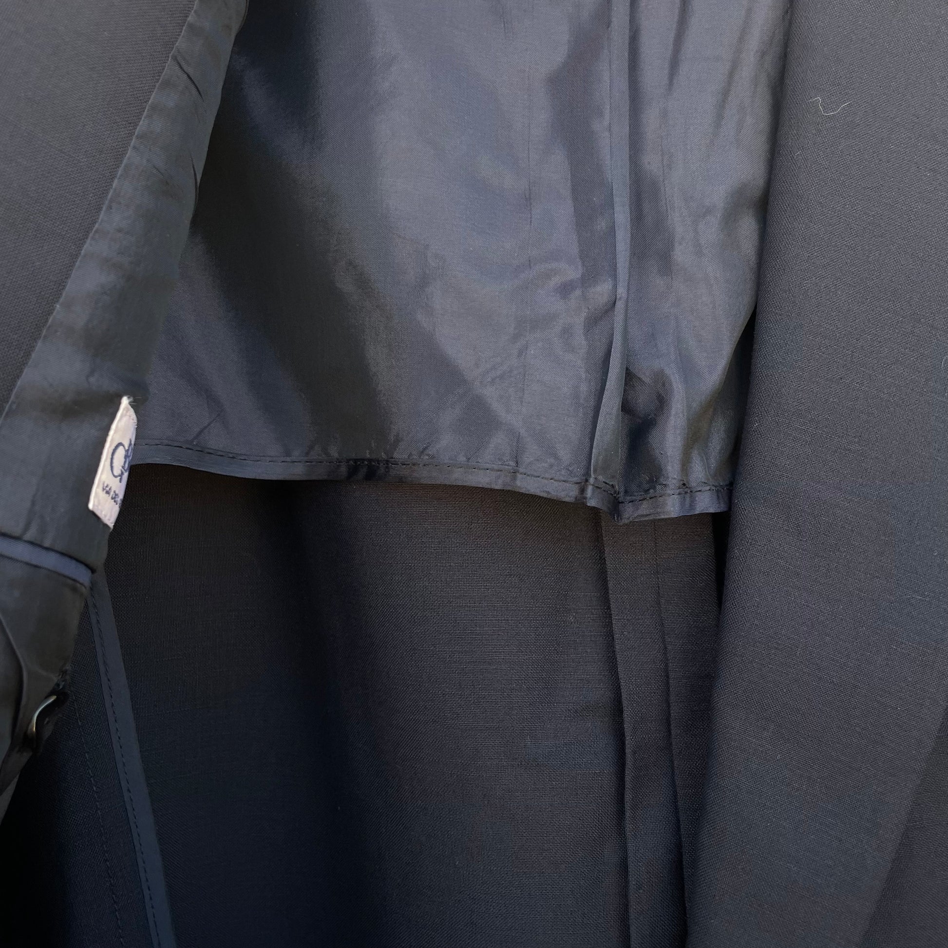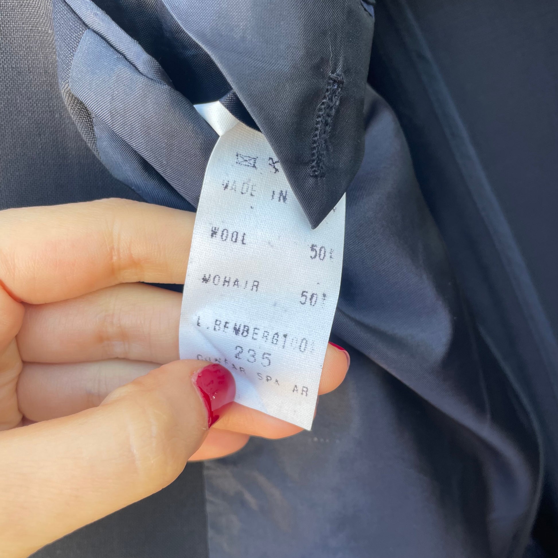 Blazer blu notte monopetto 50% lana 50% mohair (fresco lana, primaverile). Bottoni ovali con riflessi amaranto.
