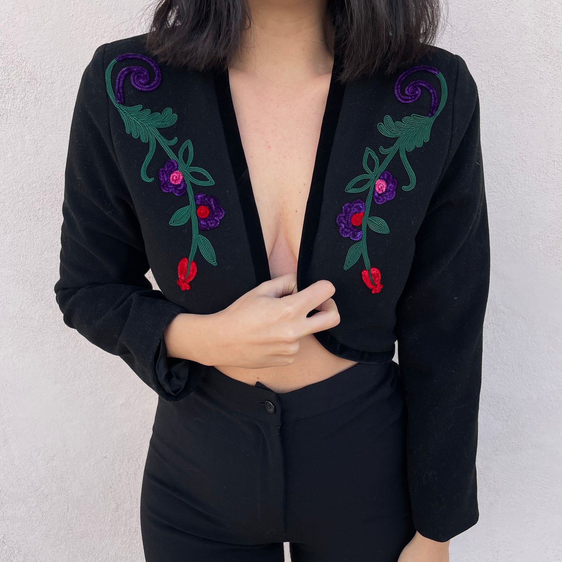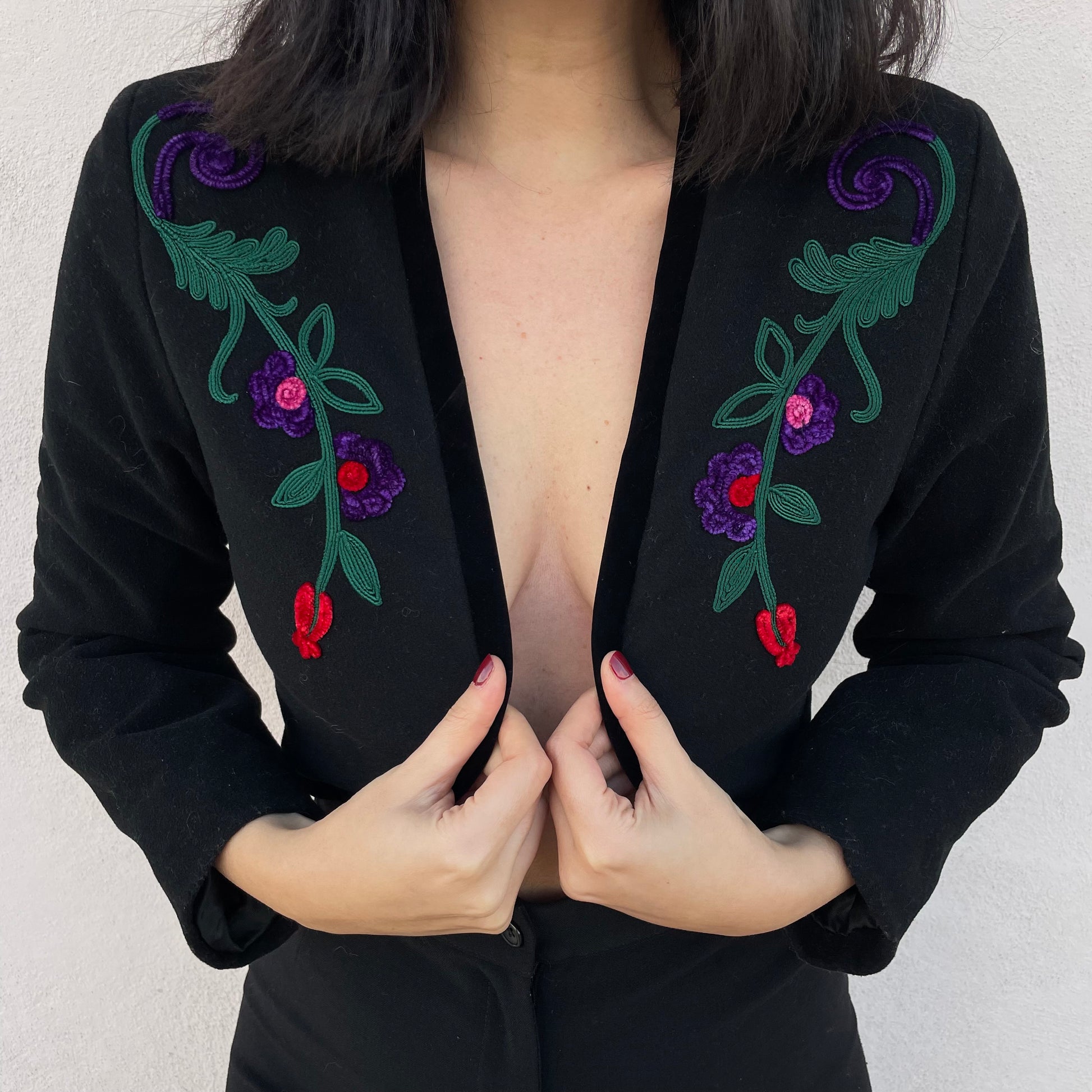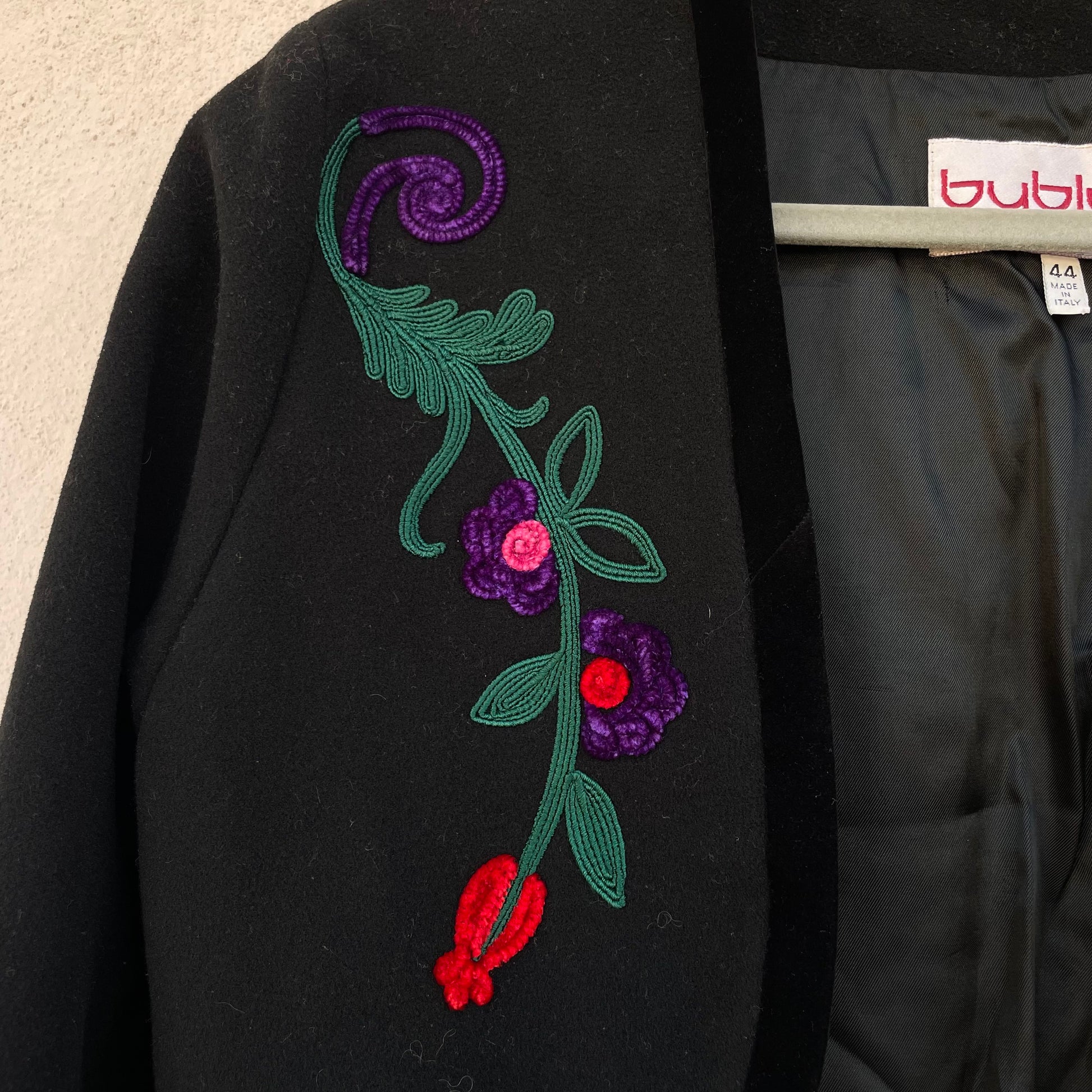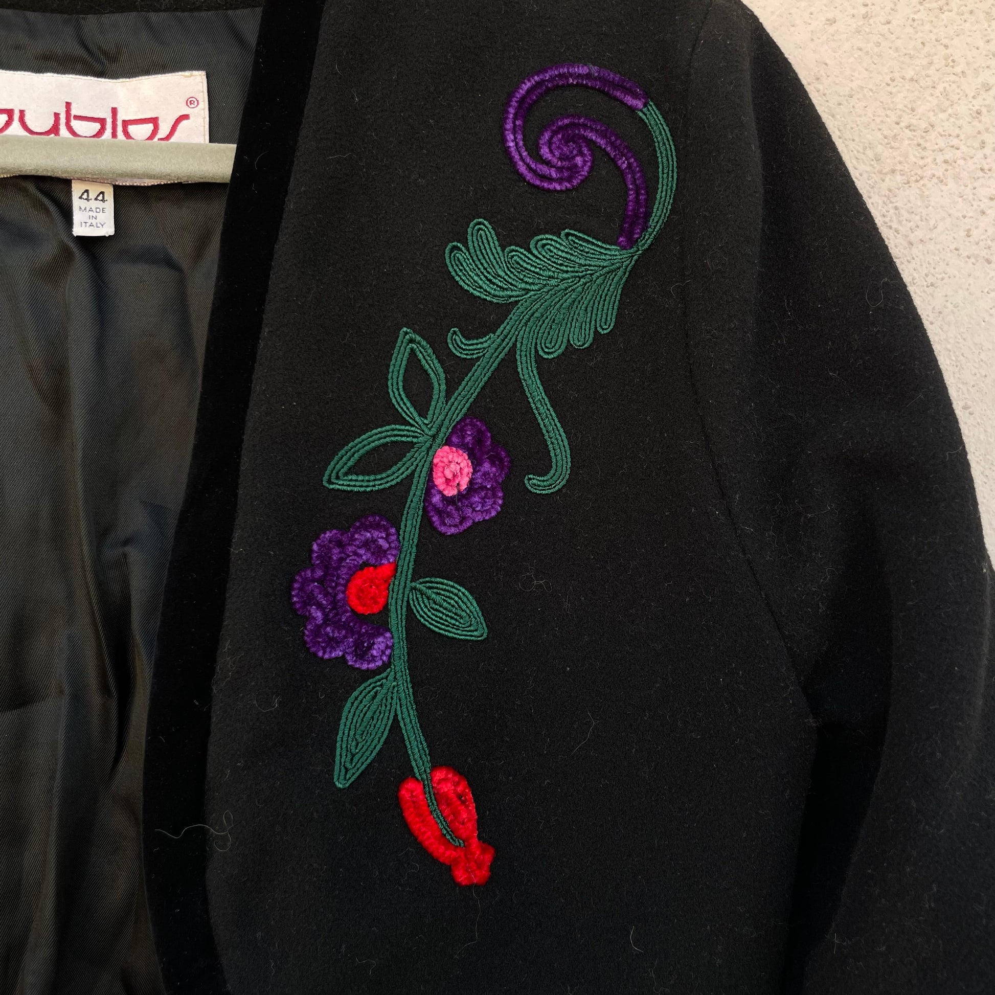 Bolero nero Byblos con ricami floreali. Profilo in velluto liscio nero. Merceologico assente ma è lana.