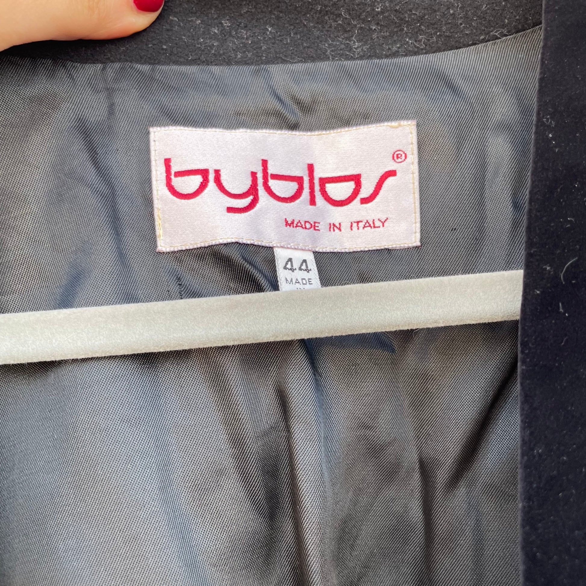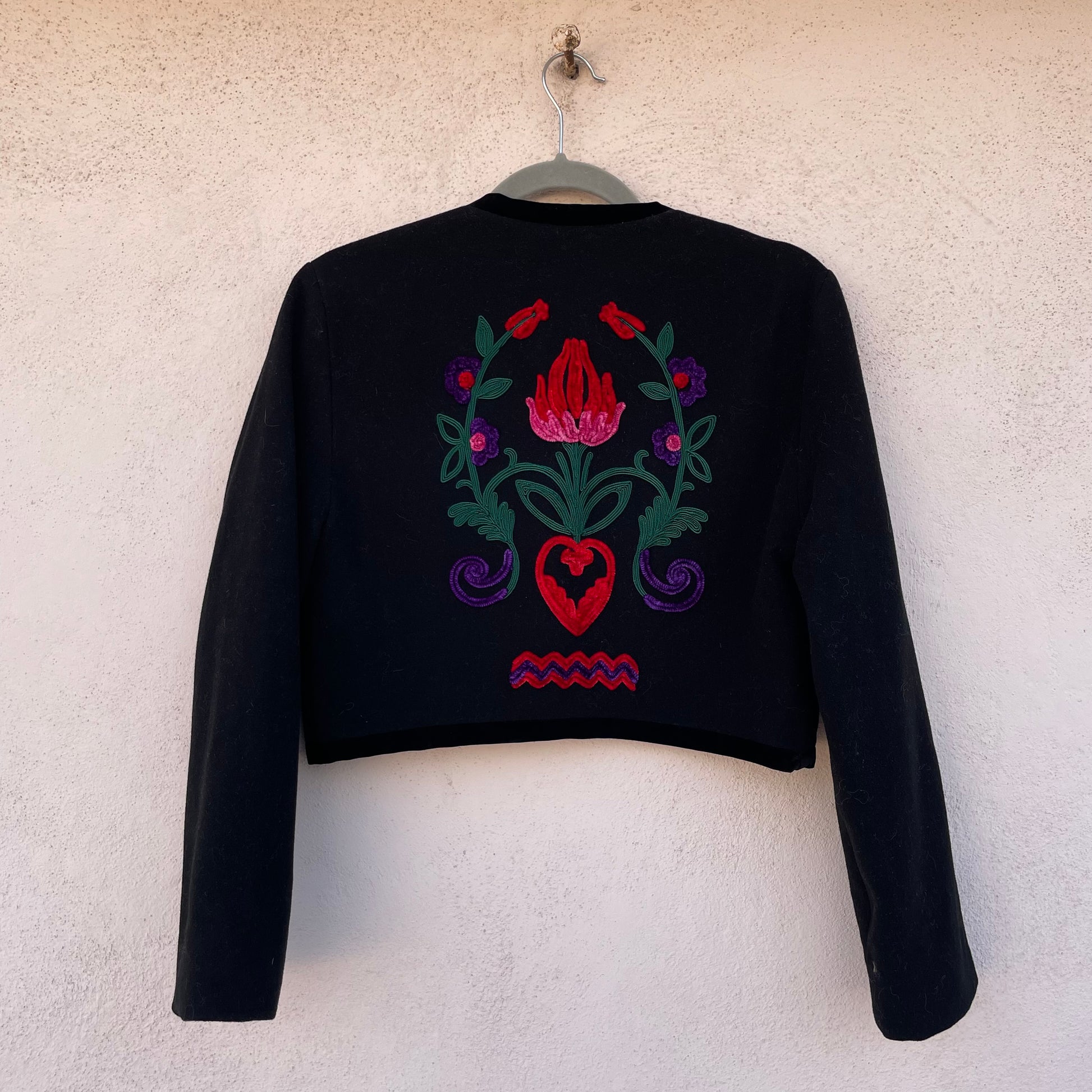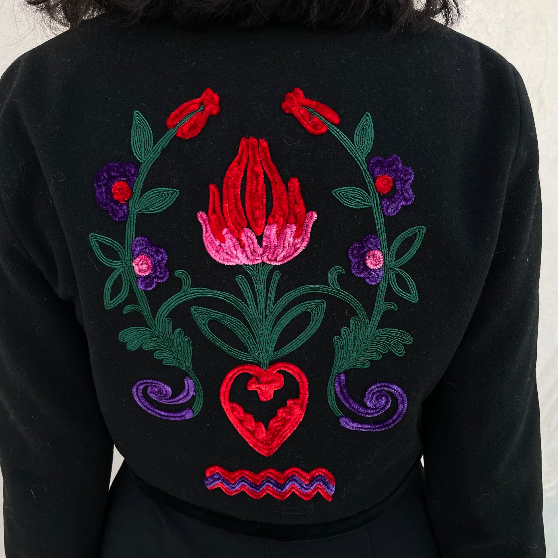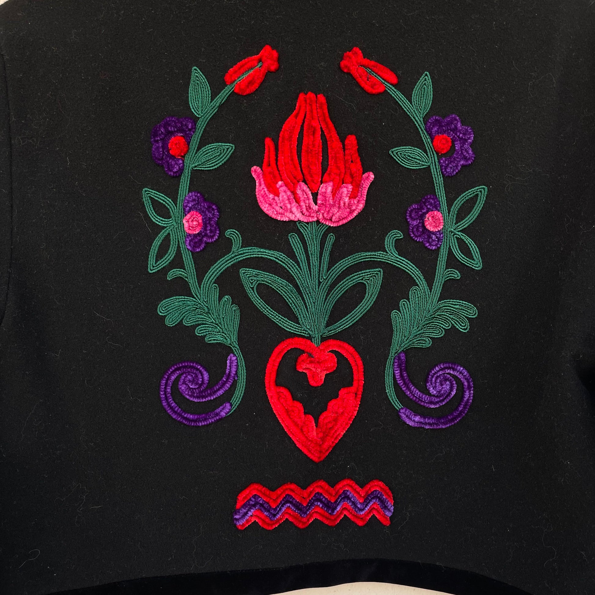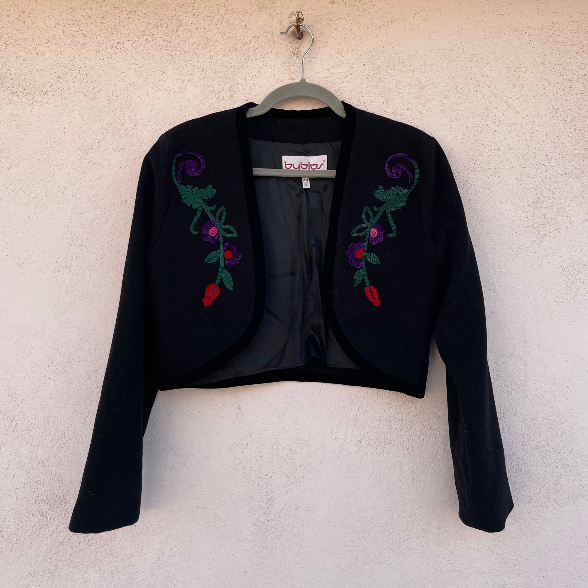 Bolero nero Byblos con ricami floreali. Profilo in velluto liscio nero. Merceologico assente ma è lana.