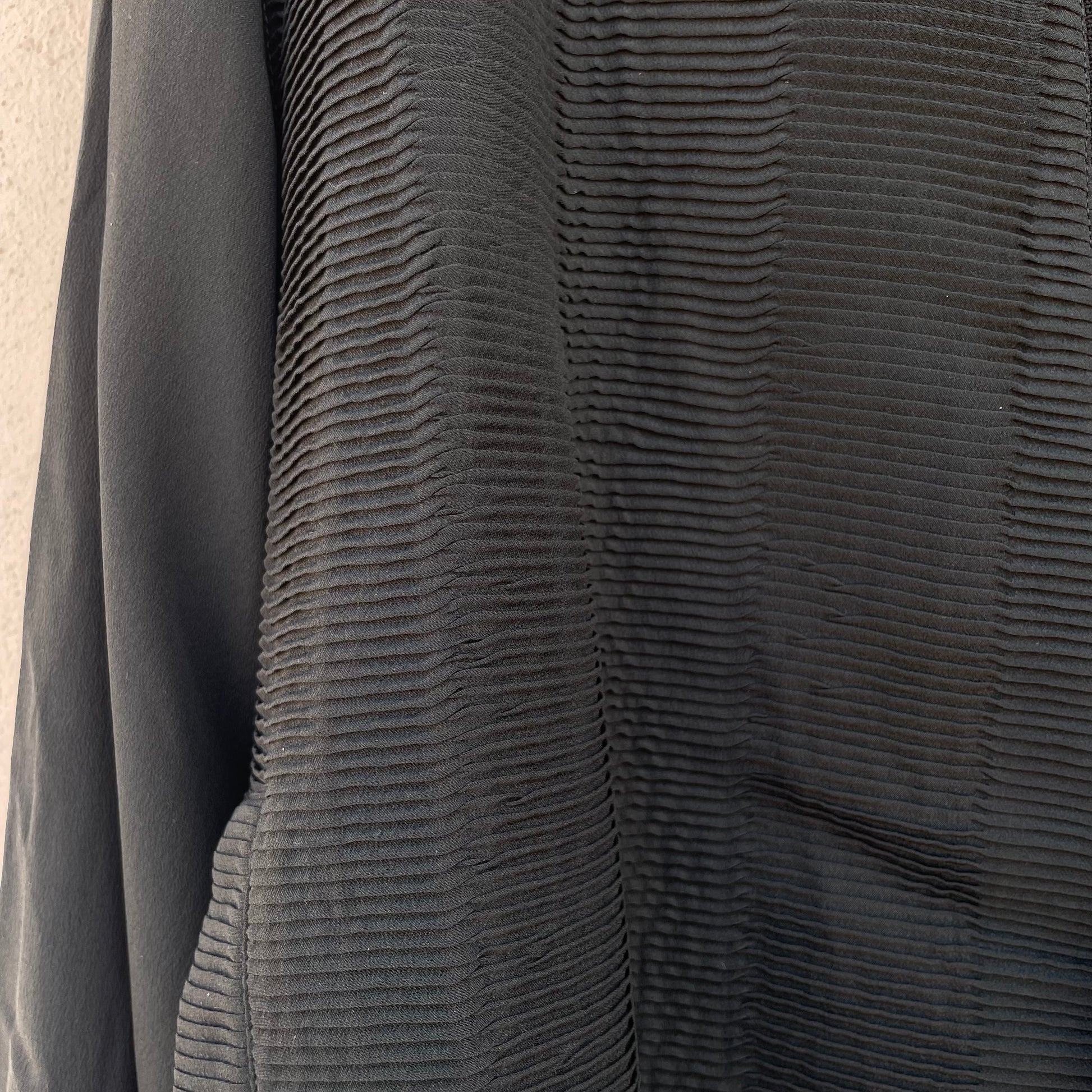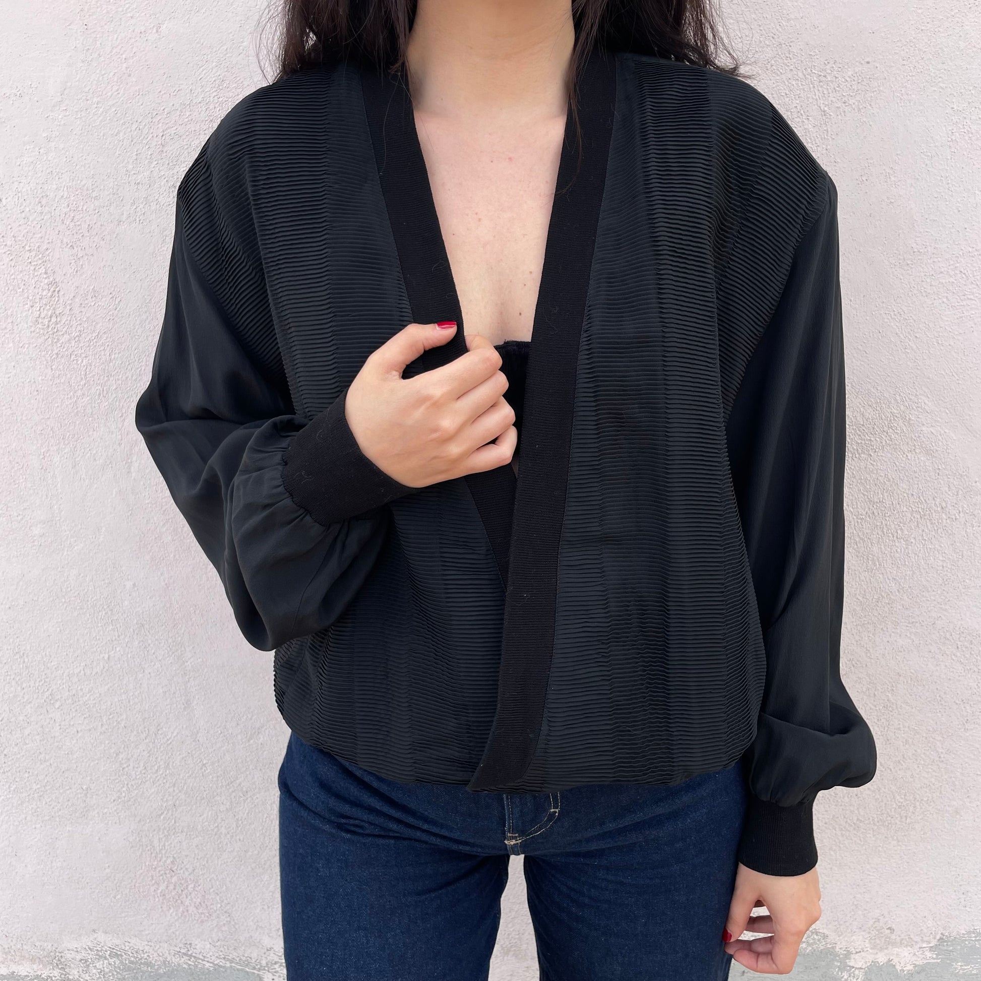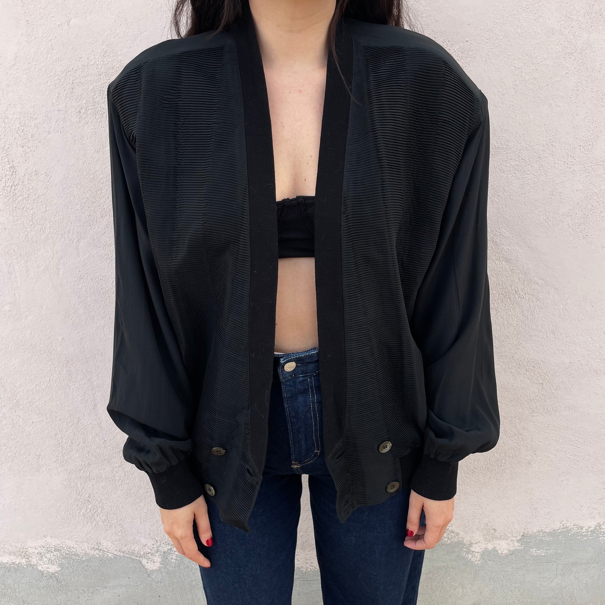Bomber Pancaldi 100% seta. Chiusura su fondo a doppiopetto. Trama plissettata. Bottoni in madreperla.