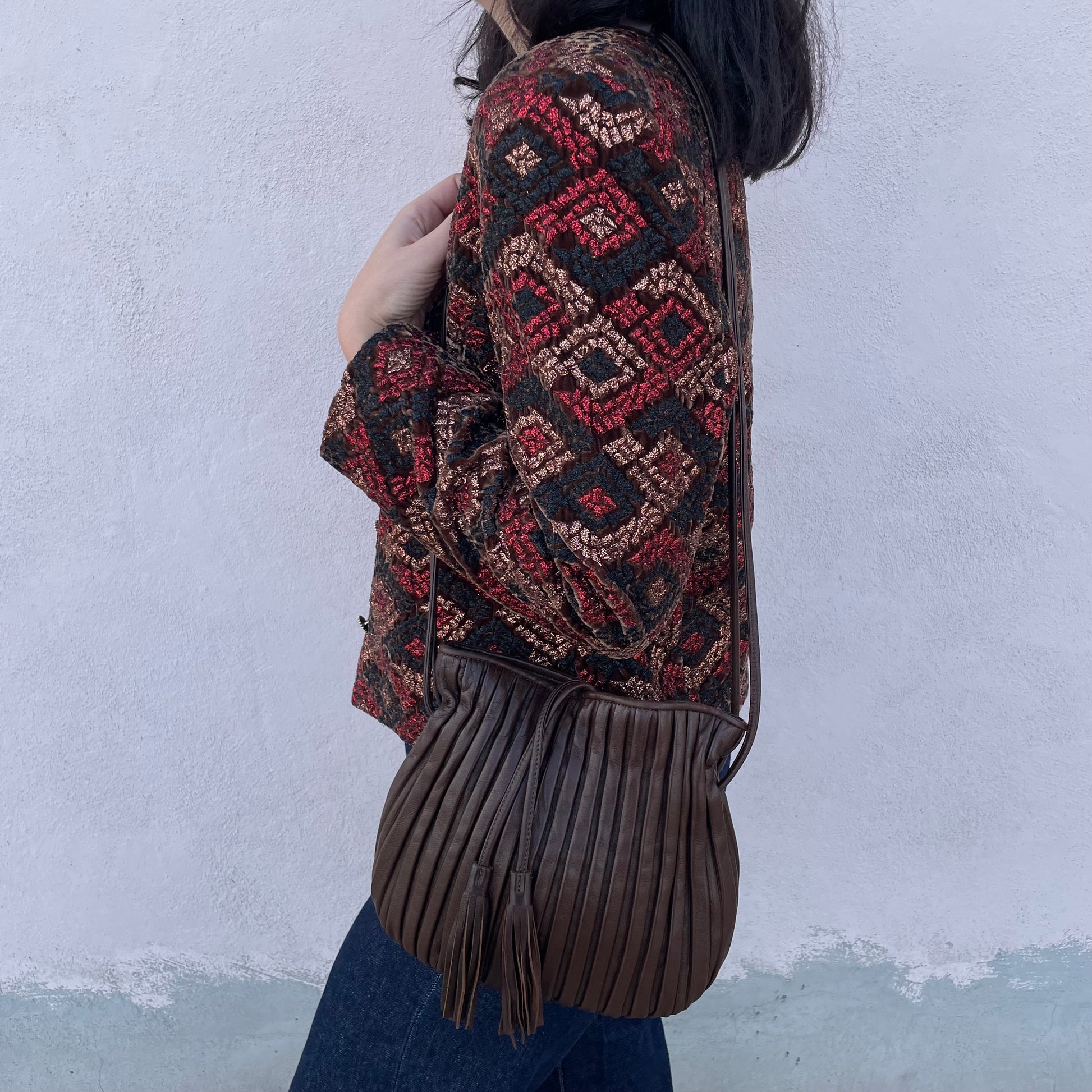 Borsa in pelle marrone modello sacchetto.