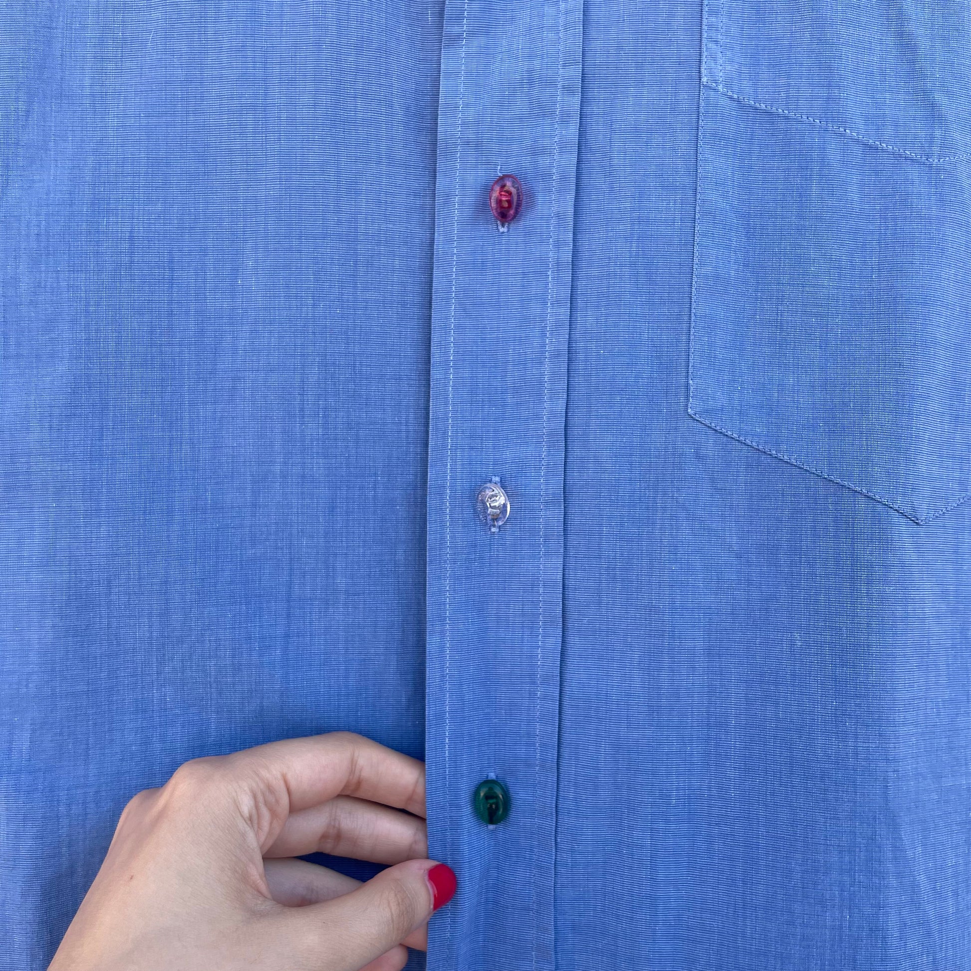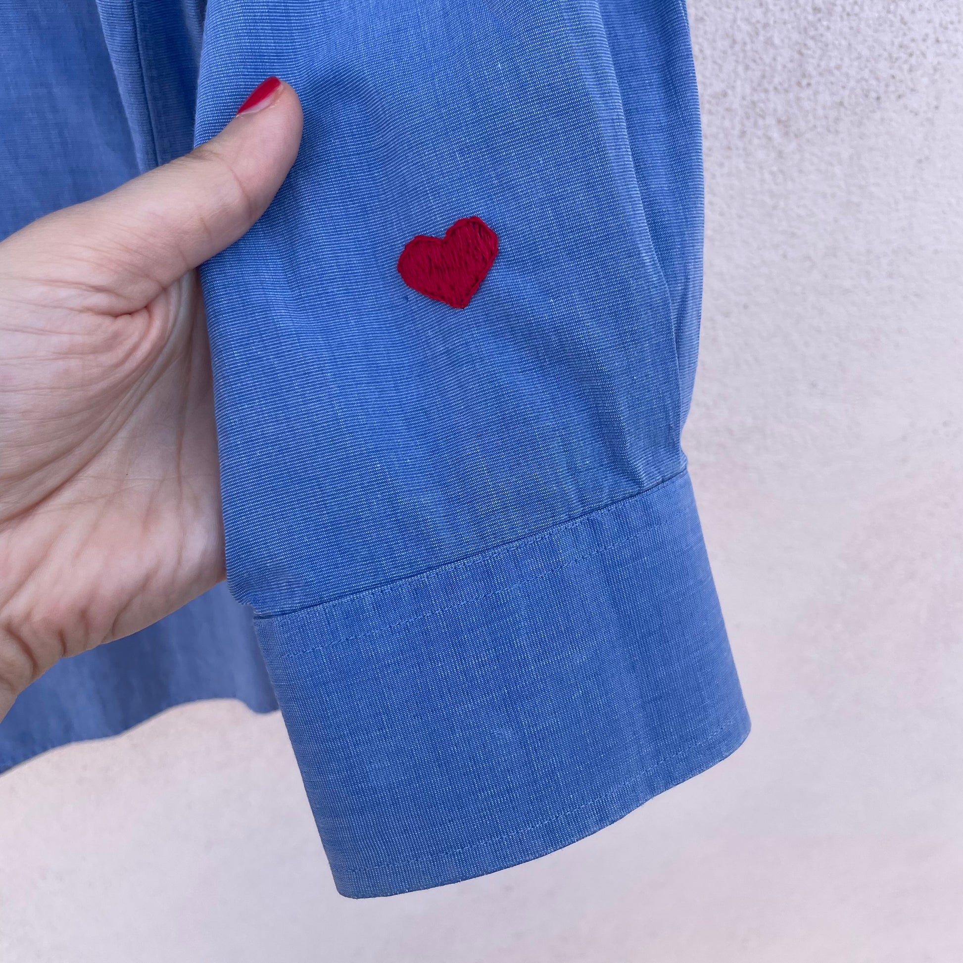 Camicia in cotone reworked con bottoncini colorati e cuori rossi ricamati.