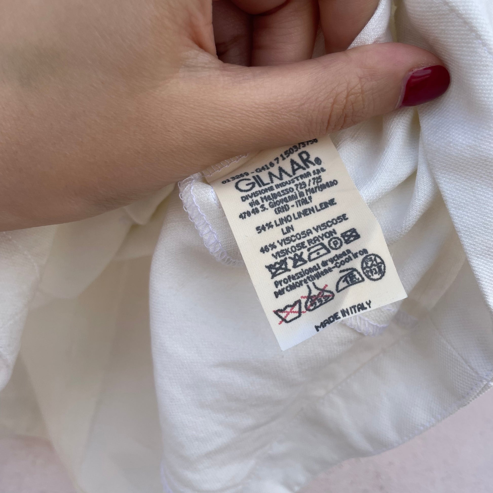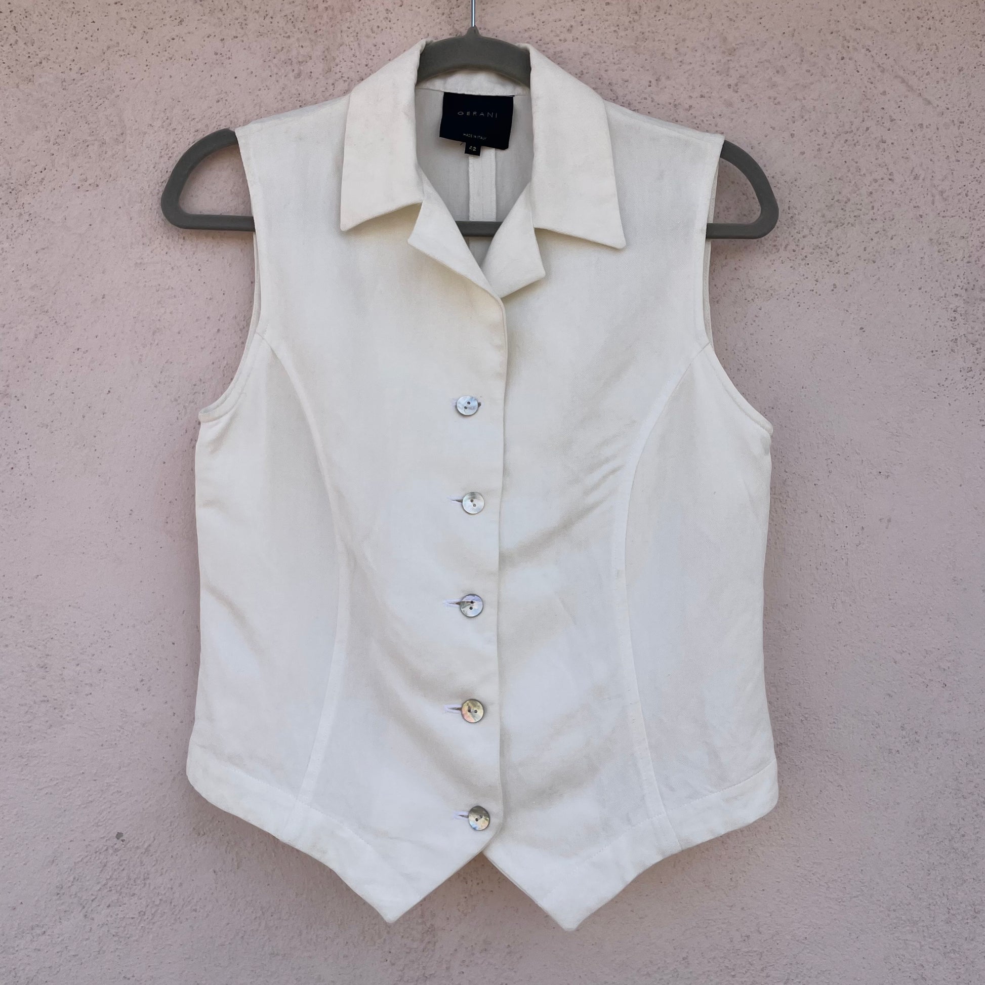 Camicia modello gilet con punte 54% lino 46% viscosa. Bottoni in madreperla. Brand Gerani gruppo Gilmar (lo stesso di Iceberg).