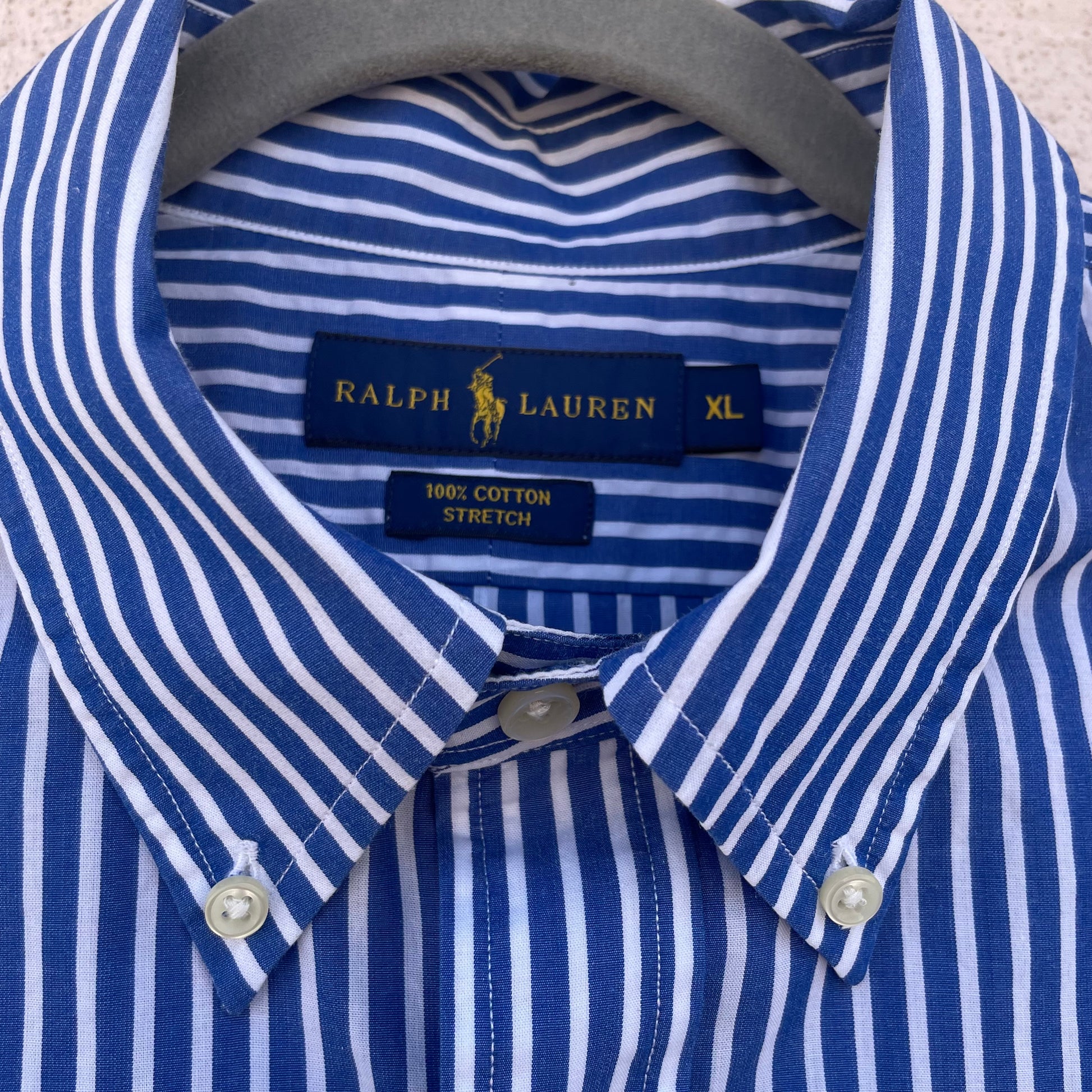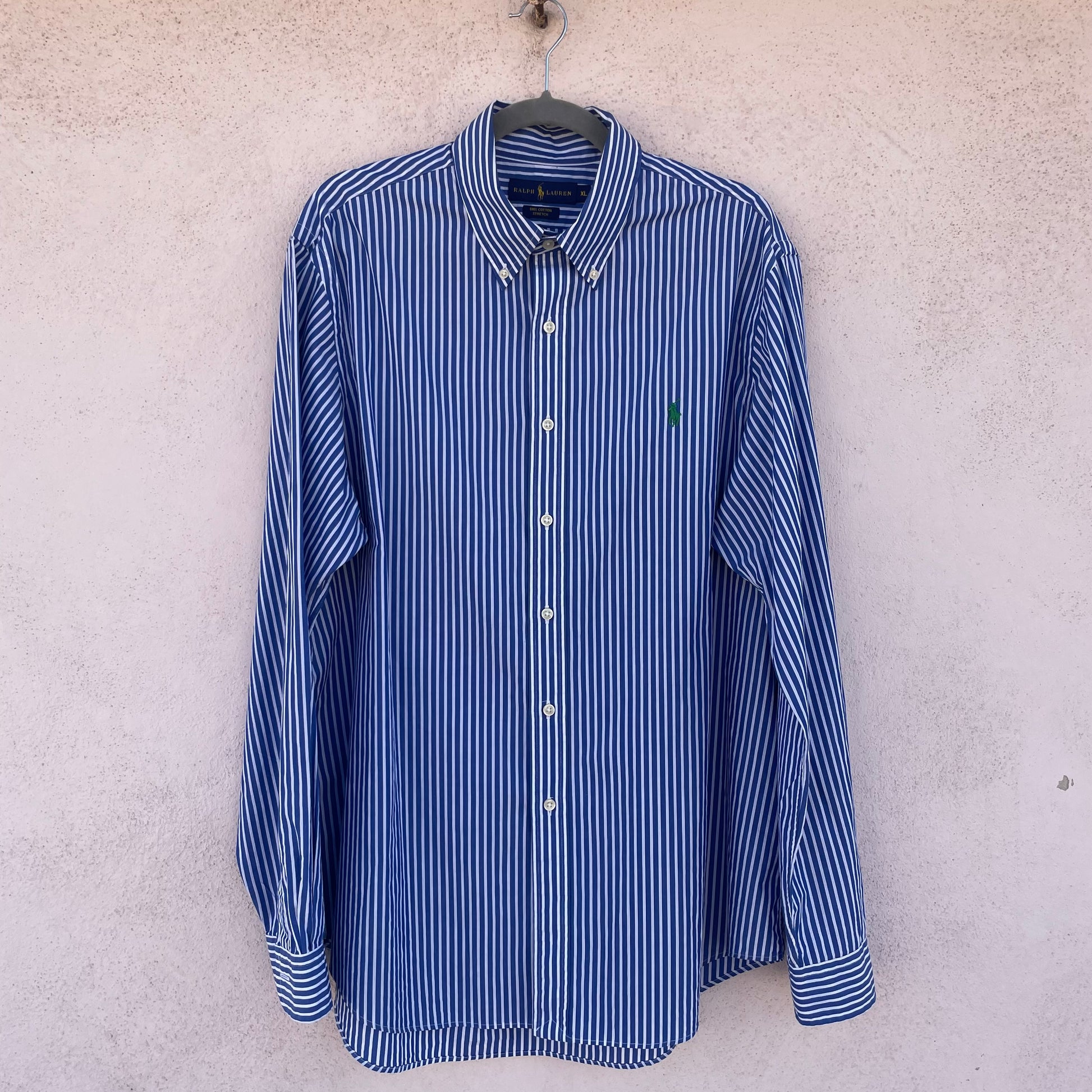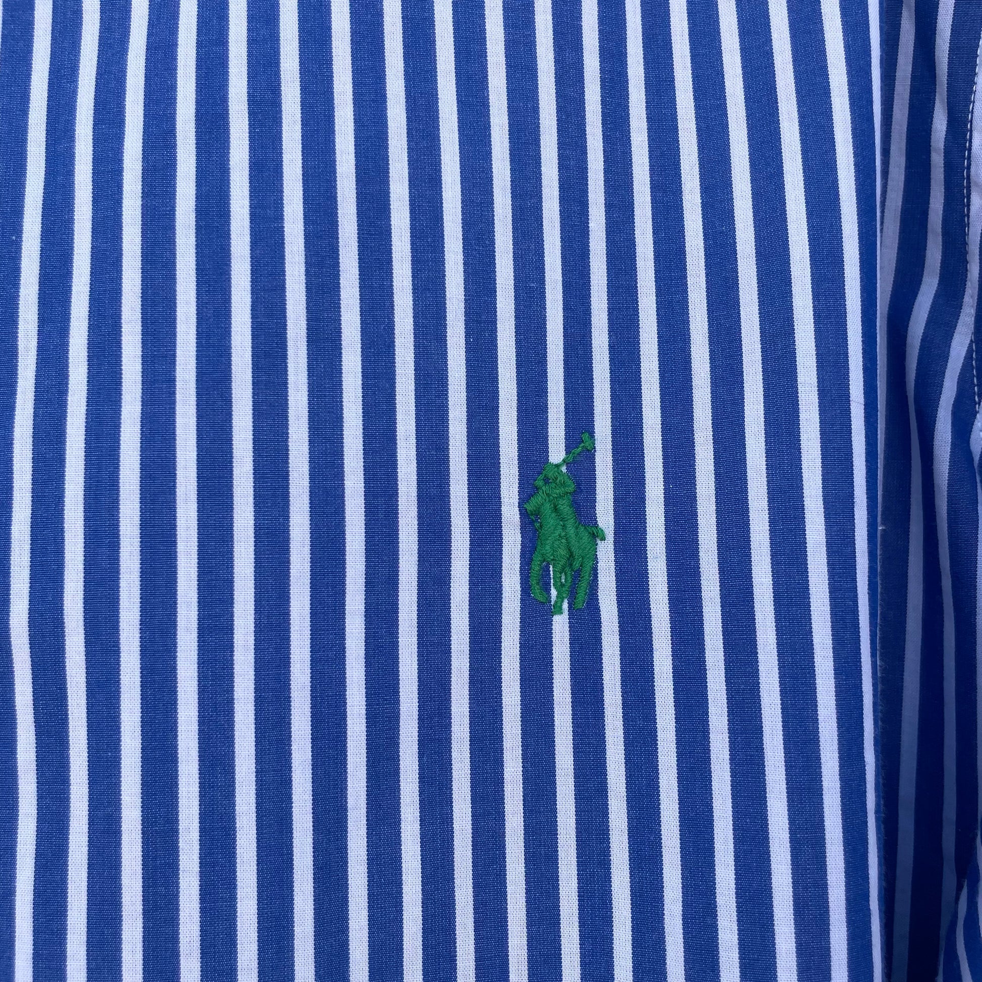 Camicia Ralph Lauren azzurra a righe con logo verde. 100% cotone.