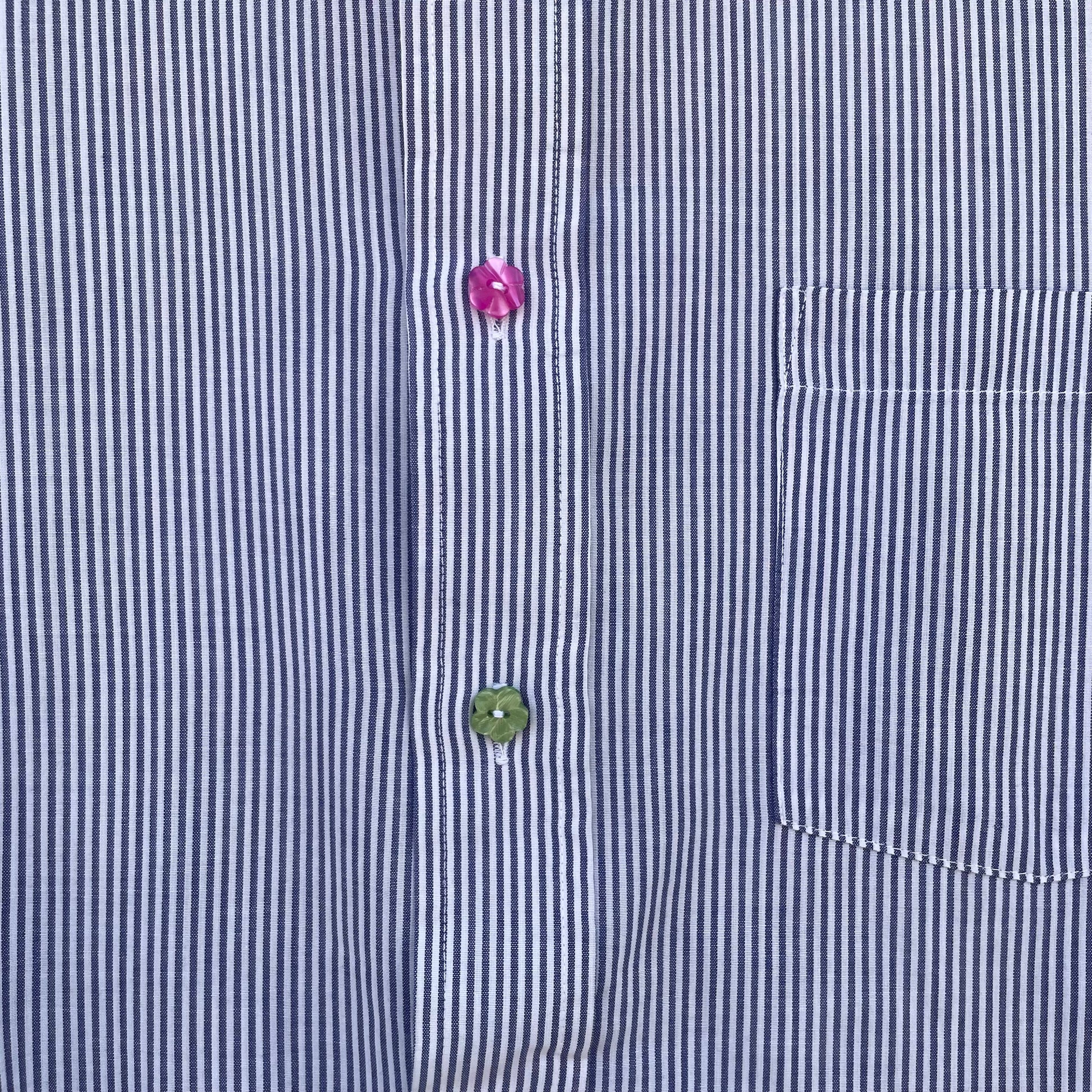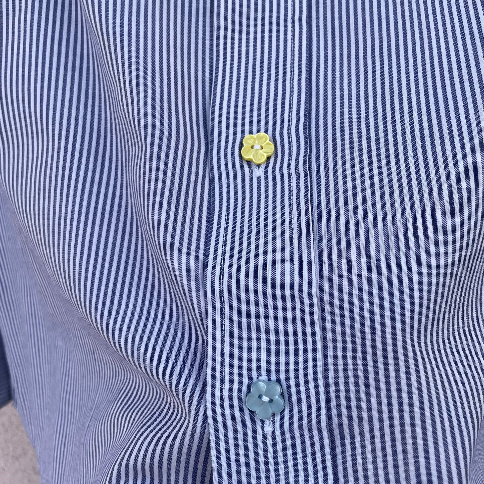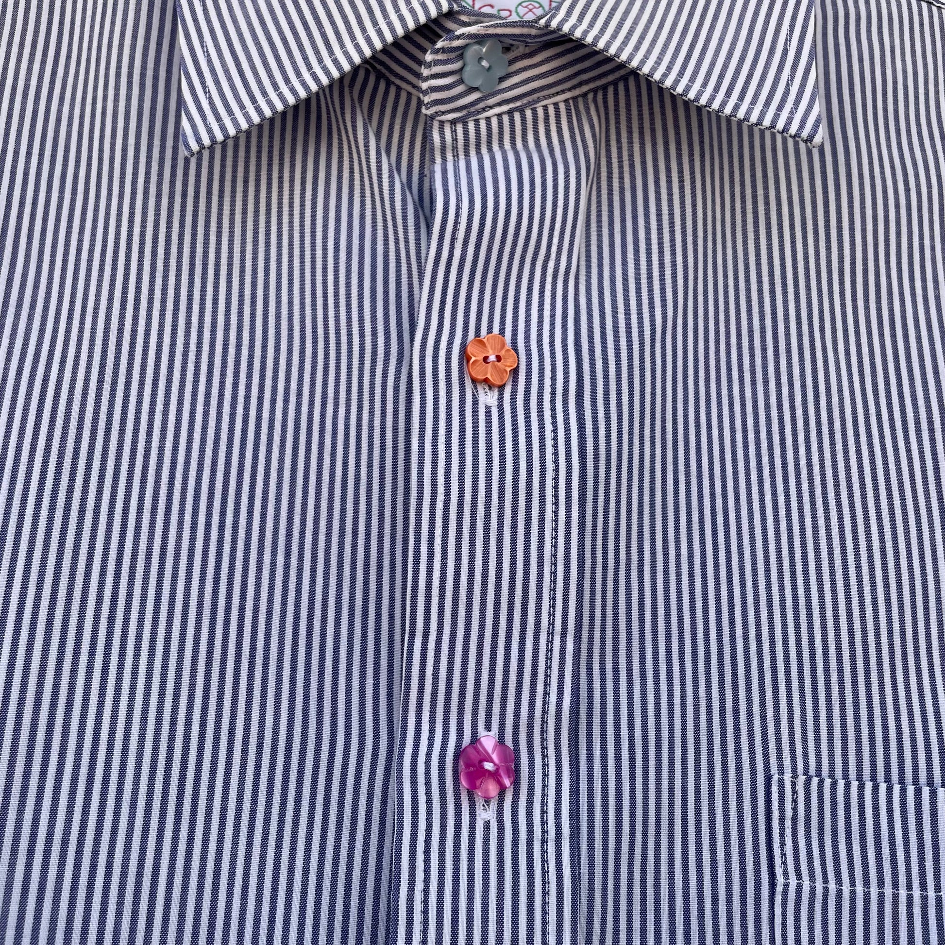 Camicia a righe bianche e blu con bottoni colorati a forma di fiorellino (reworked da me). Manca il merceologico ma è cotone.
