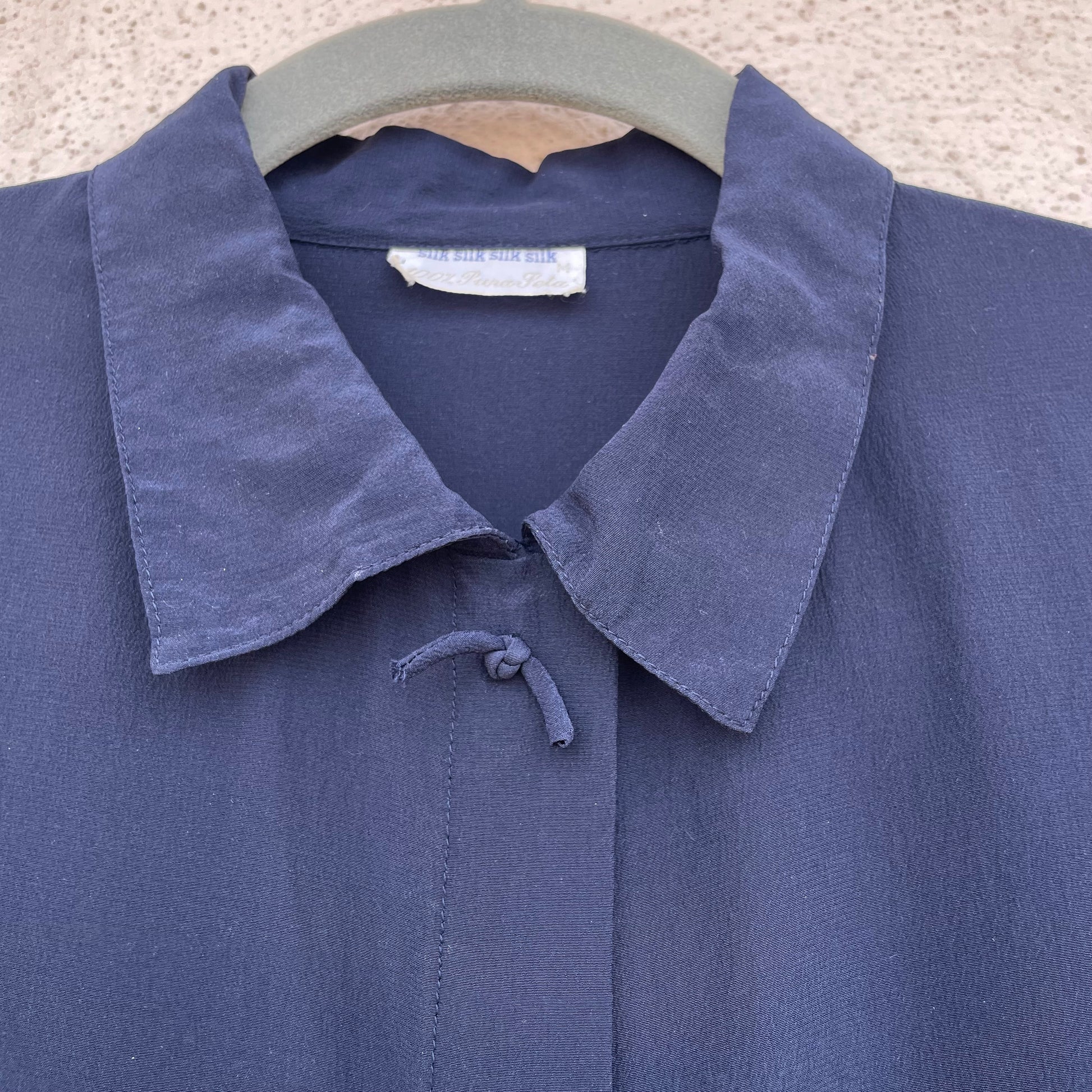 Camicia blu 100% seta. Bottoni nascosti, in corrispondenza dei bottoni fiocchetti di seta.
