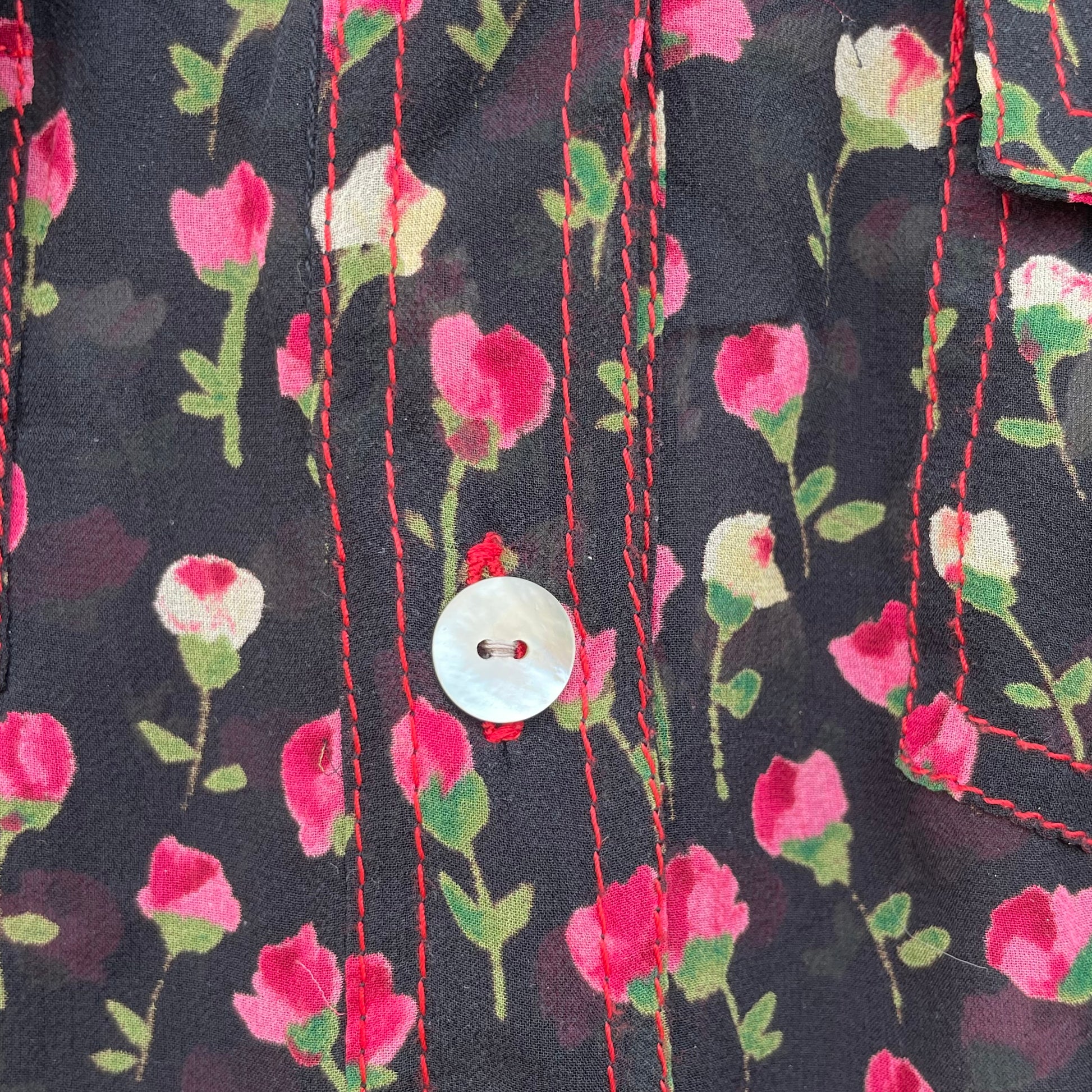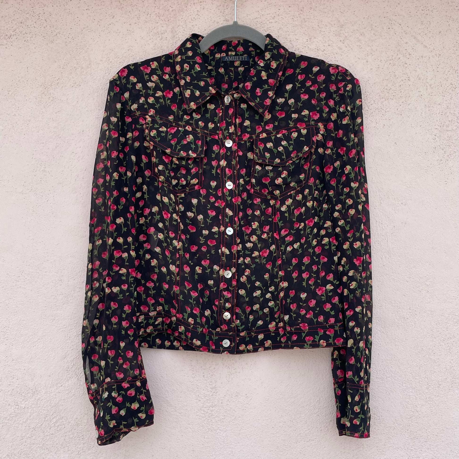 Camicia 100% seta Mariella Burani. Fondo nero con motivo floreale. Bottoni in madreperla.