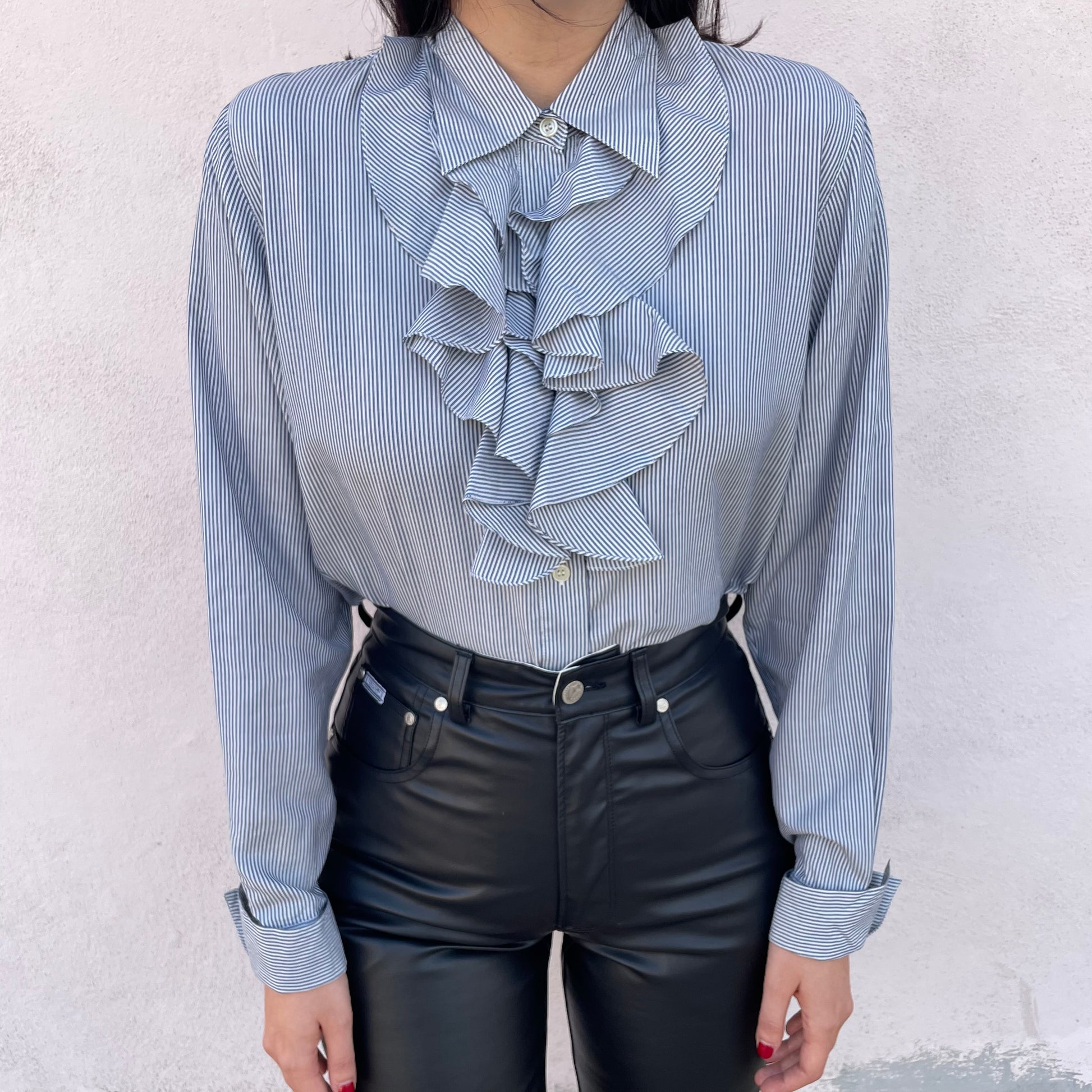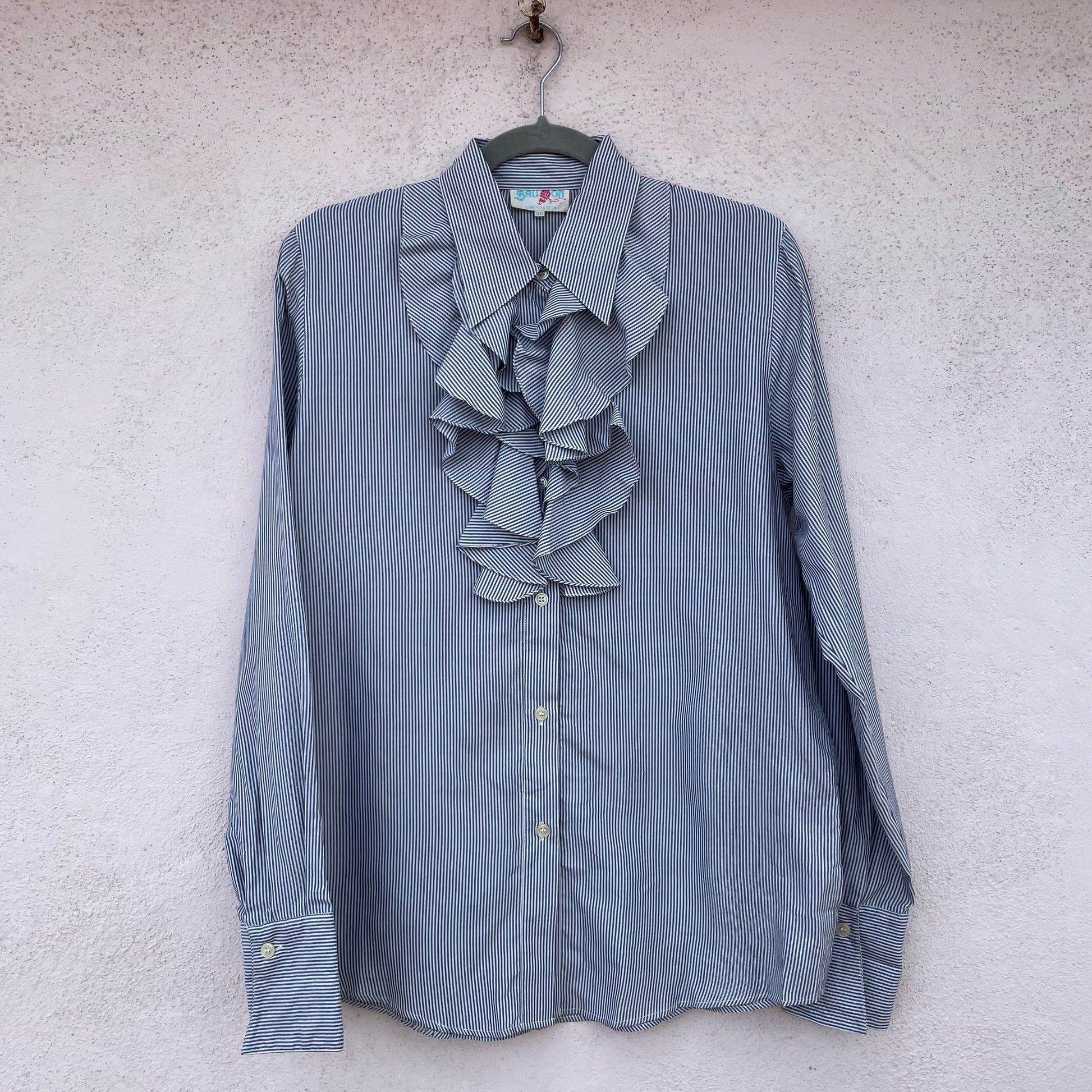 Camicia a righe con grande ruches centrali Balloon. 100% seta (al tatto sembra quasi cotone, non è scivolosa).