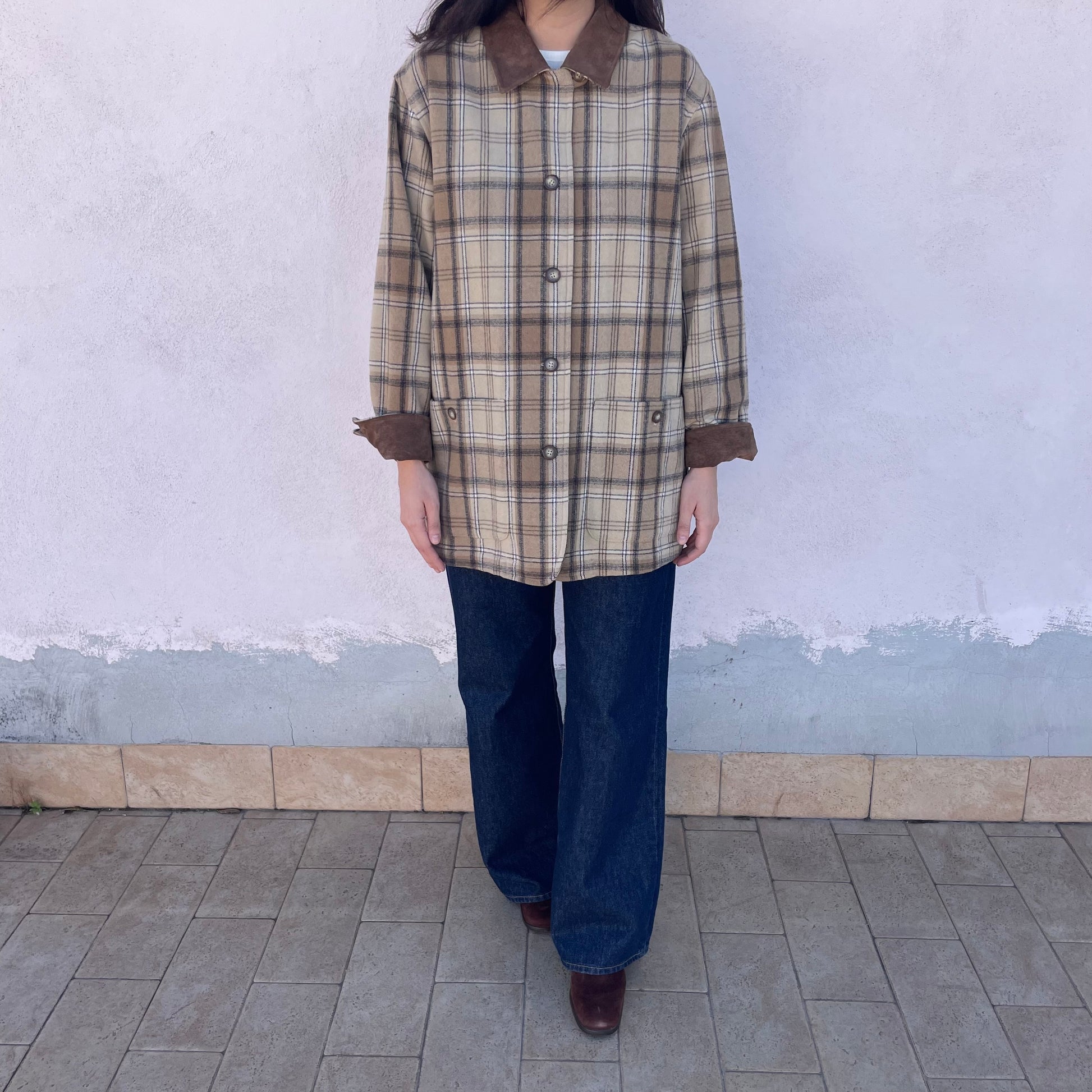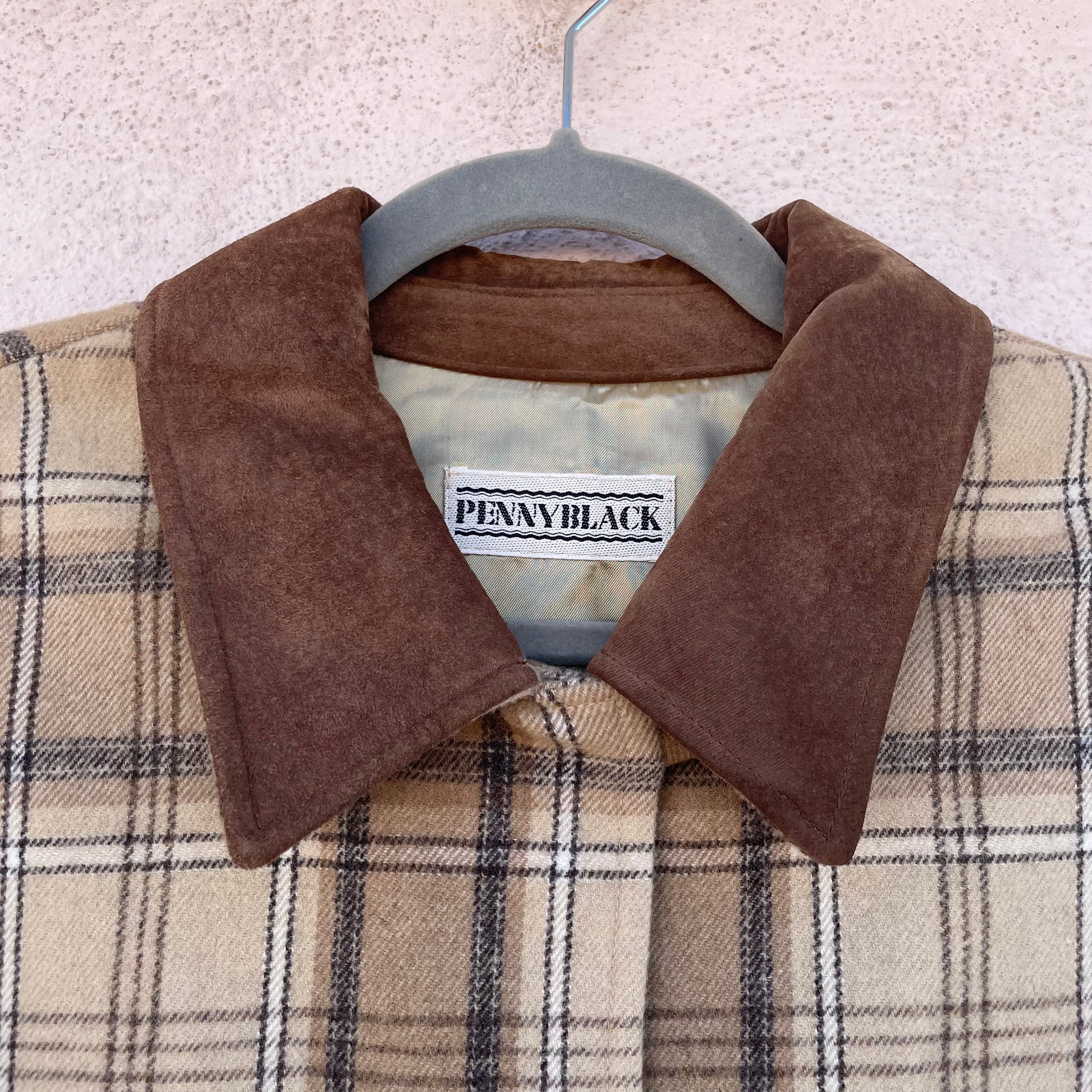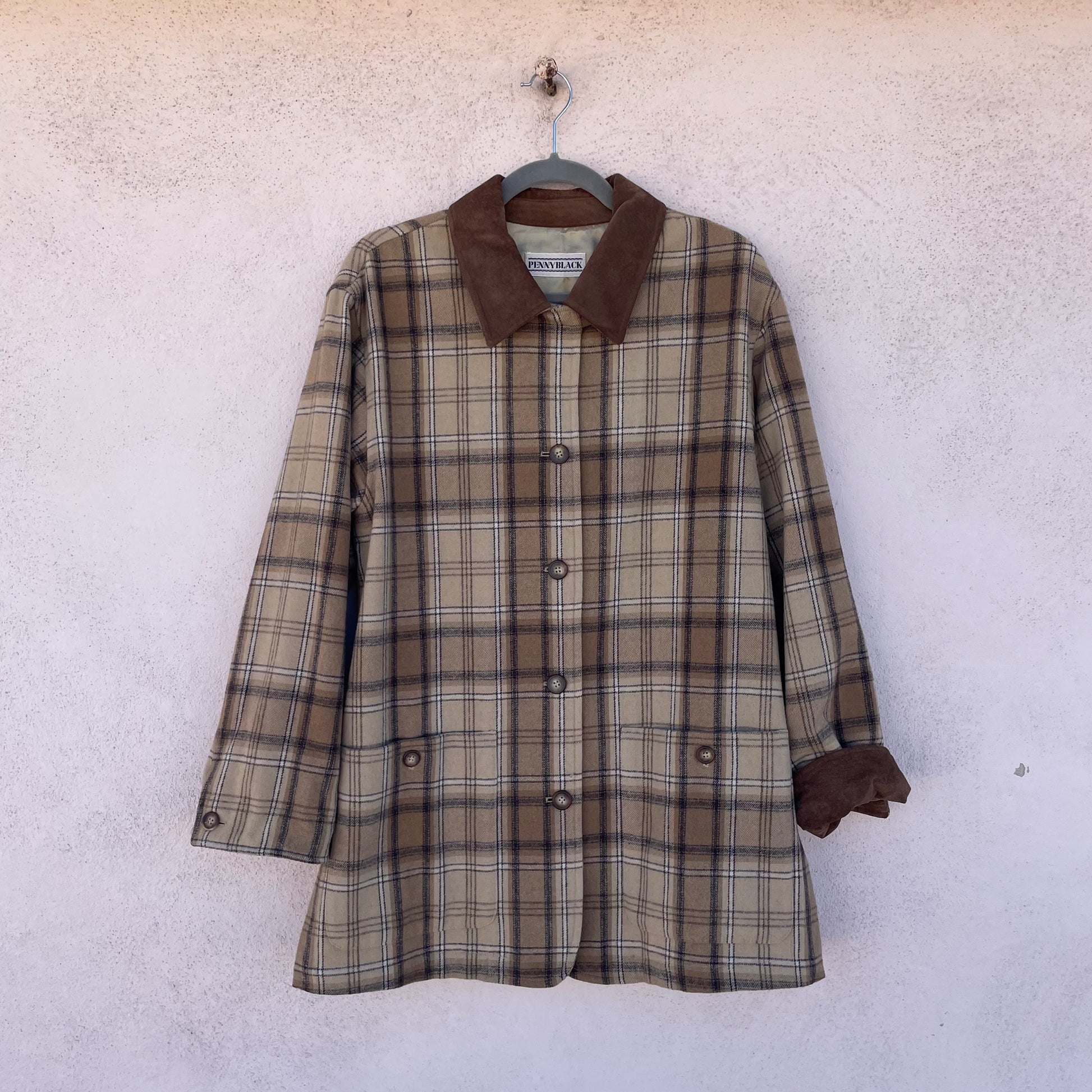 Cappottino tartan beige/nocciola Pennyblack. Modello monopetto, colletto e polsini in pelle scamosciata. 70% lana 30% poli.