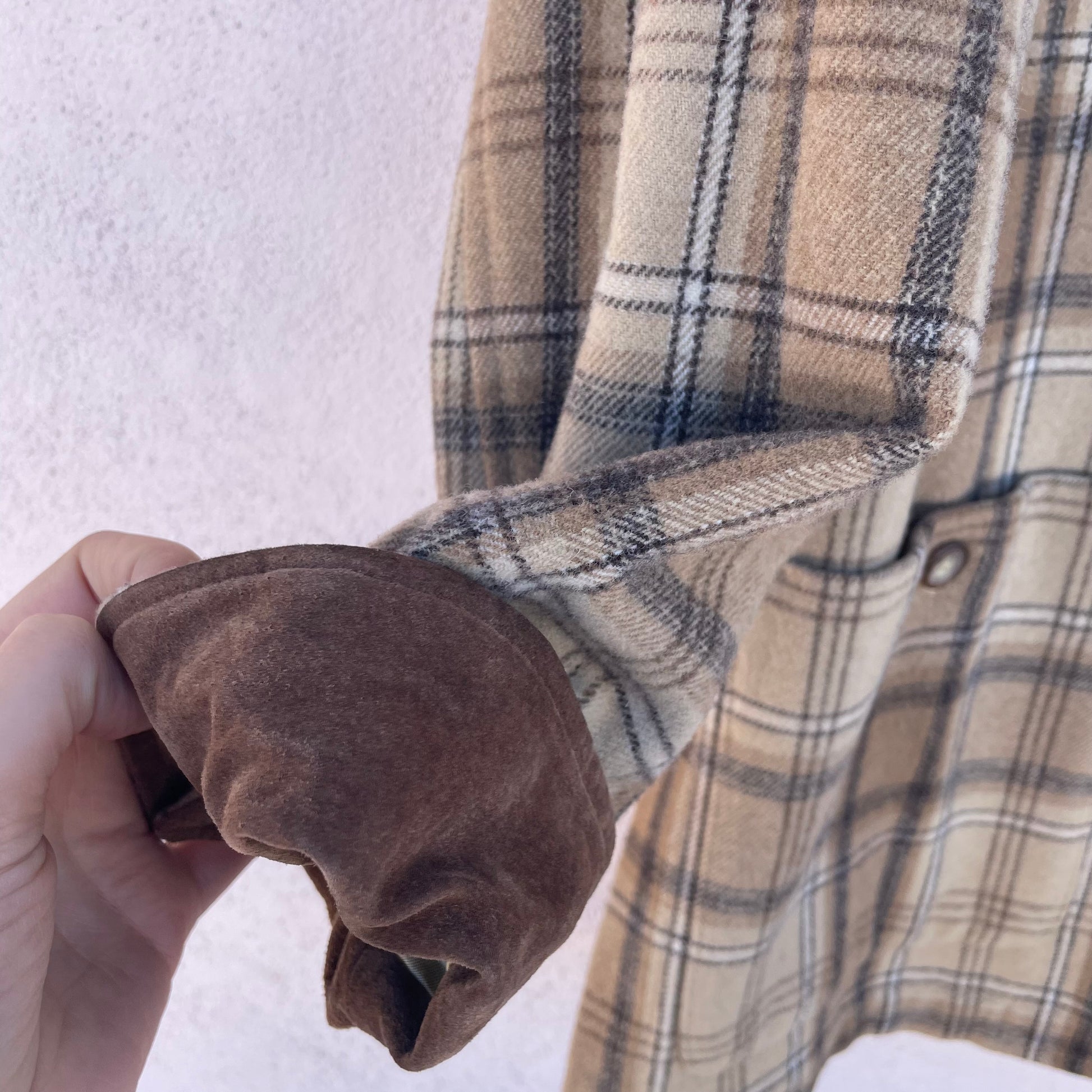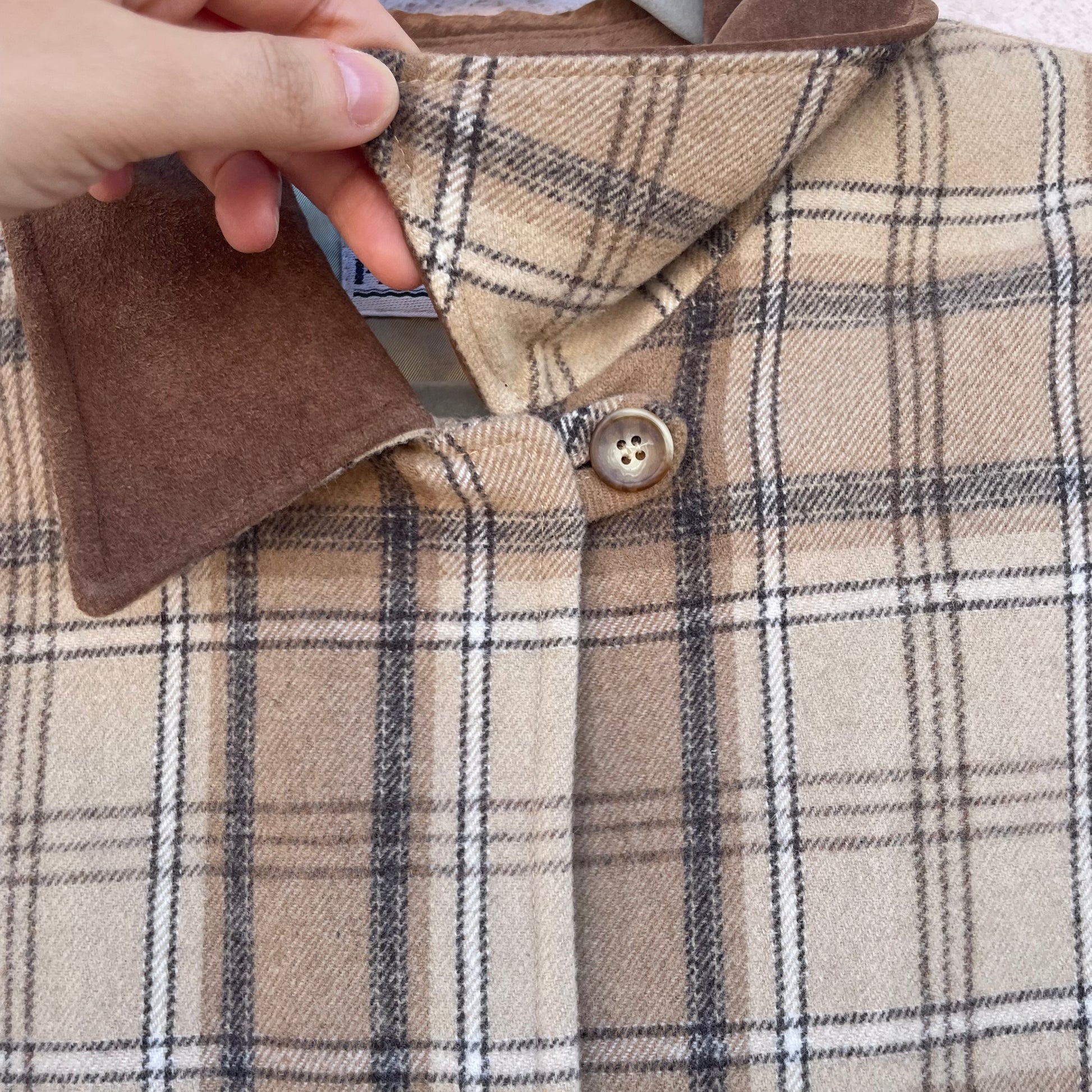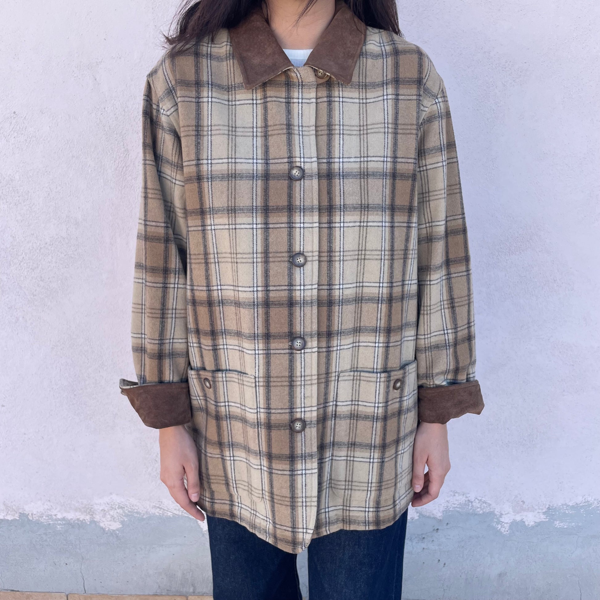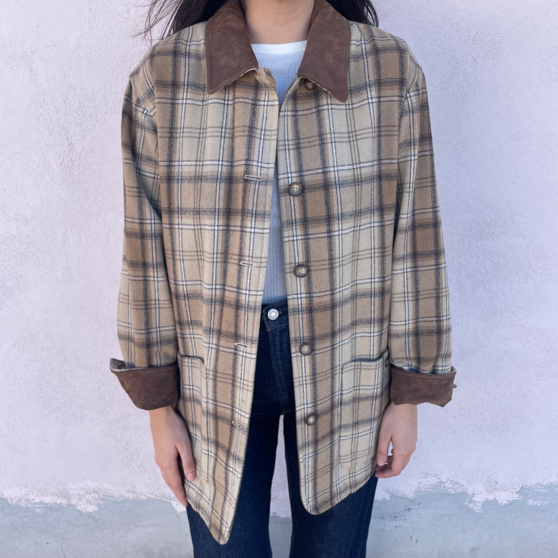 Cappottino tartan beige/nocciola Pennyblack. Modello monopetto, colletto e polsini in pelle scamosciata. 70% lana 30% poli.