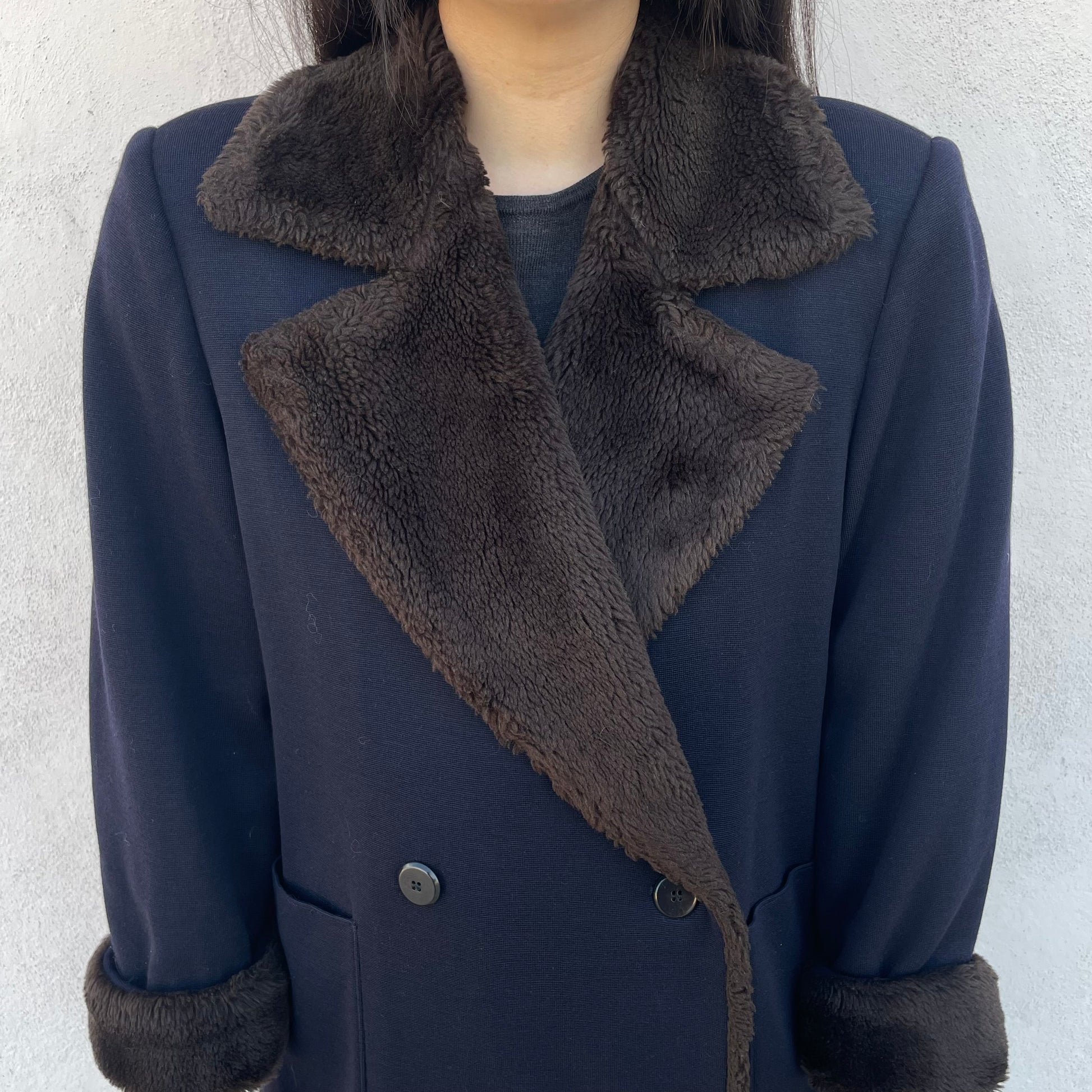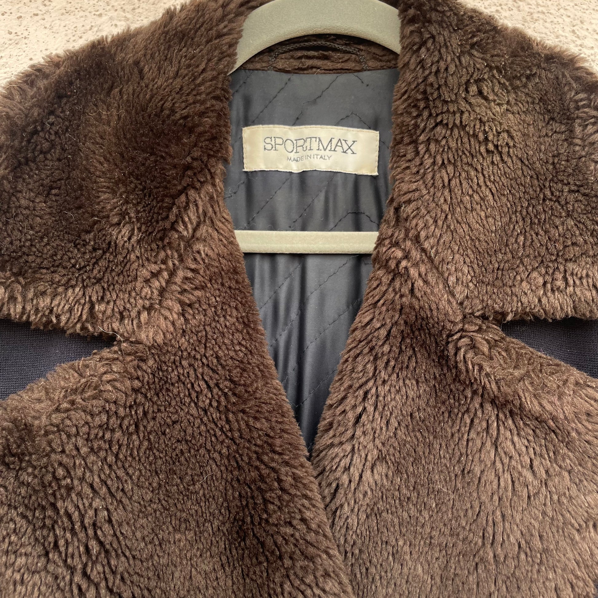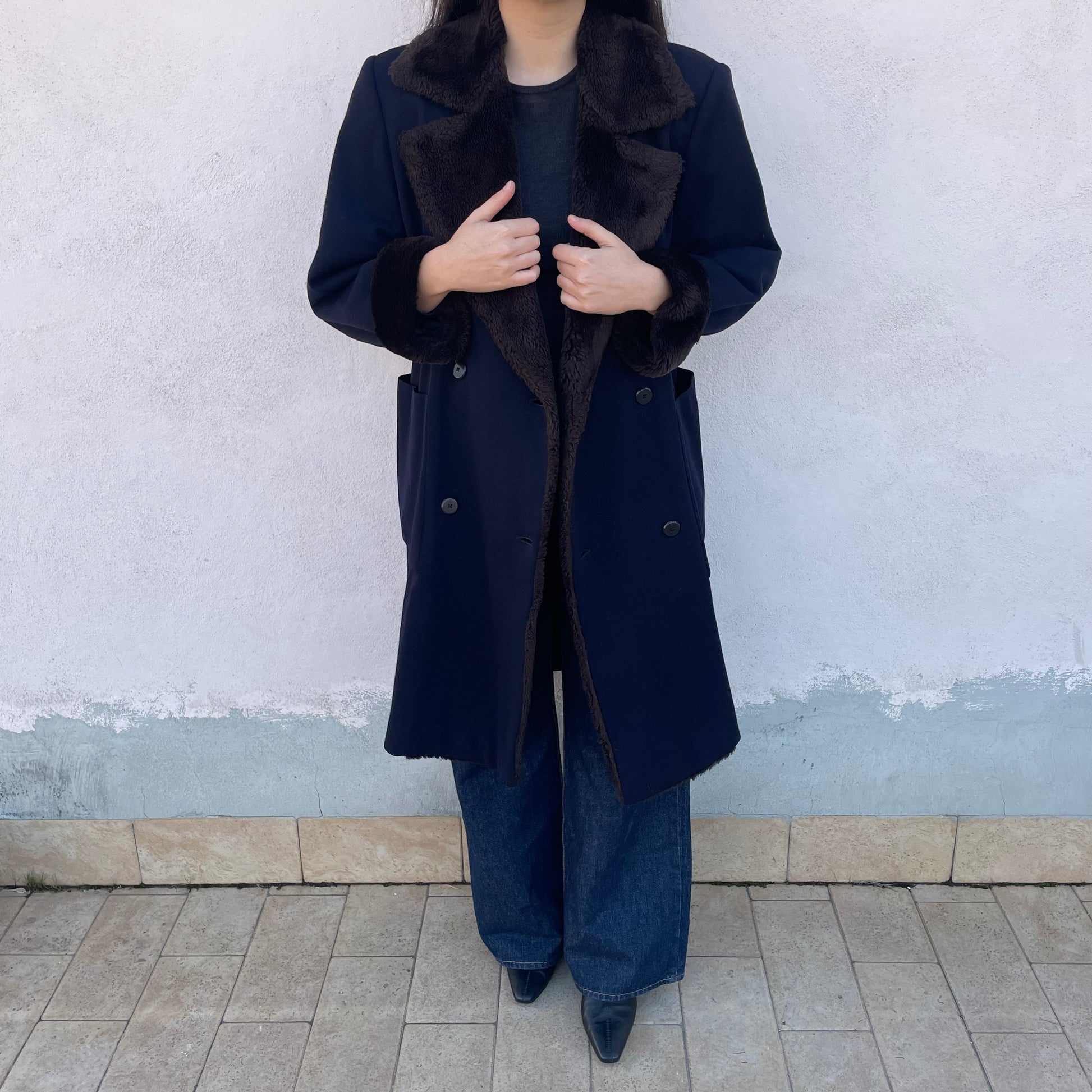 Cappotto Sportmax blu doppiopetto con collo e polsini in ecopelliccia. Manca il merceologico ma è lana (vedi foto dettaglio). Trapuntato.