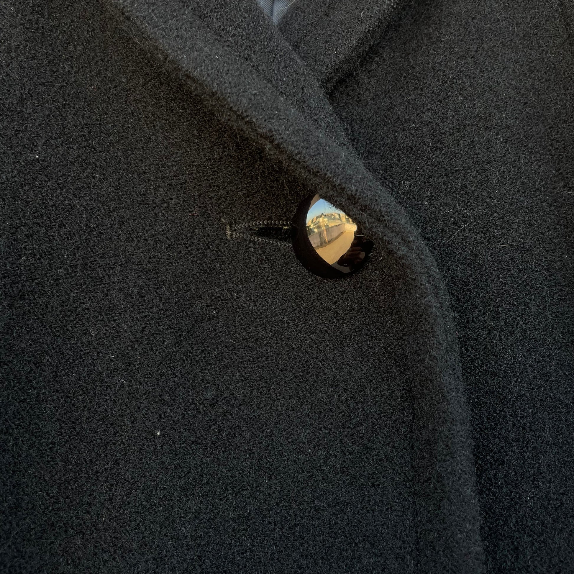 Cappotto nero chiusura a un bottone, modello a ruota. 100% lana vergine.