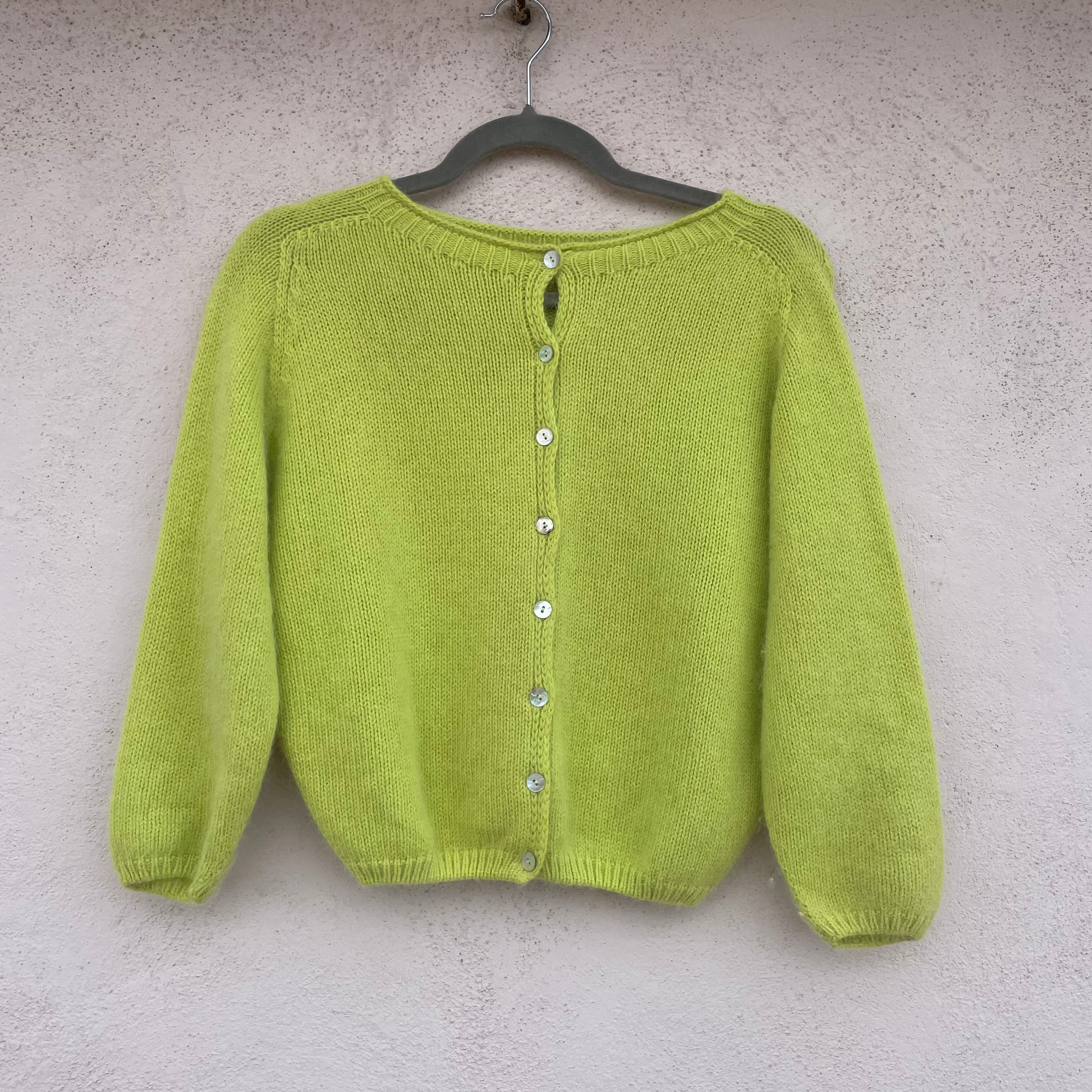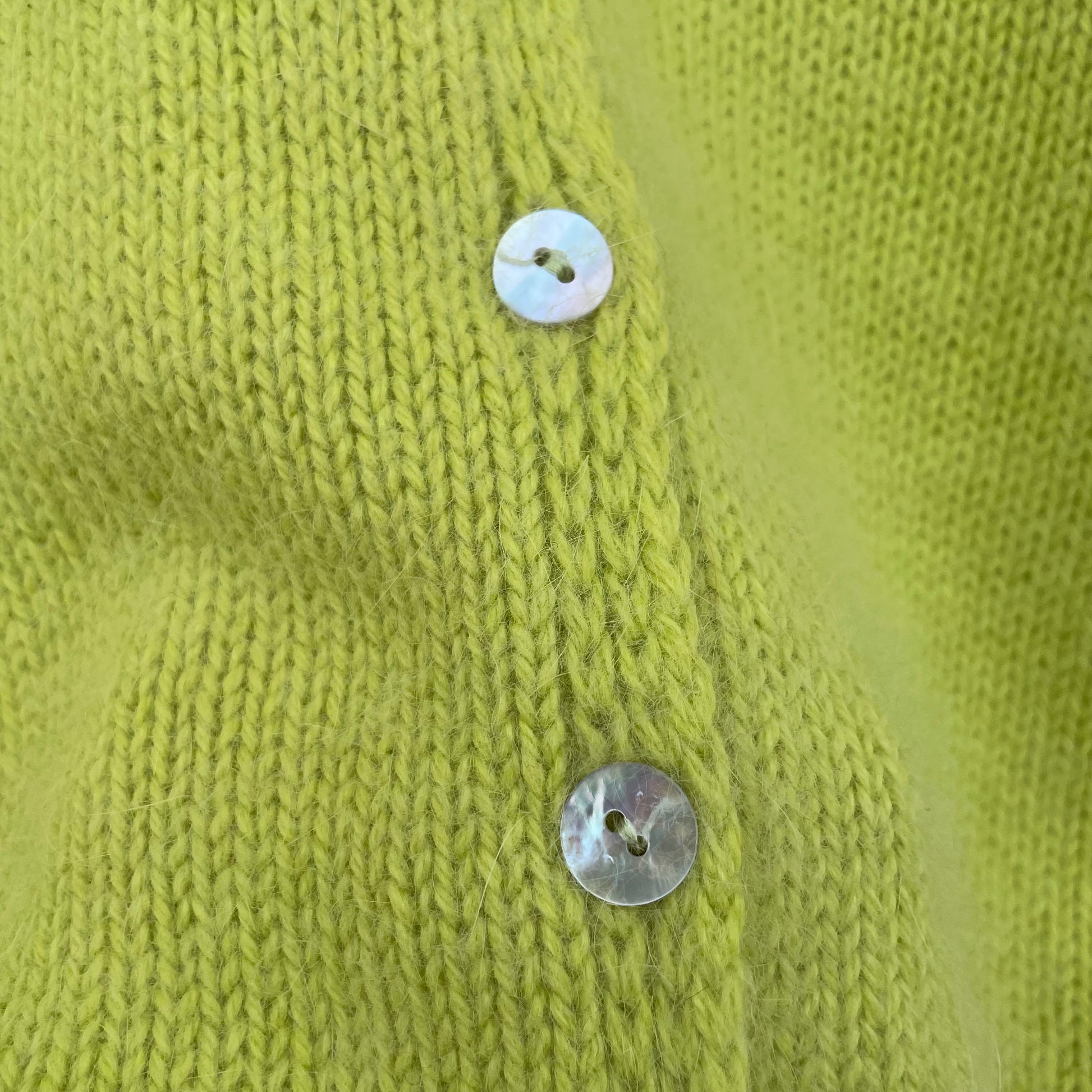 Cardigan lime con bottoni in madreperla. 50% angora 5% lana 45% poli.