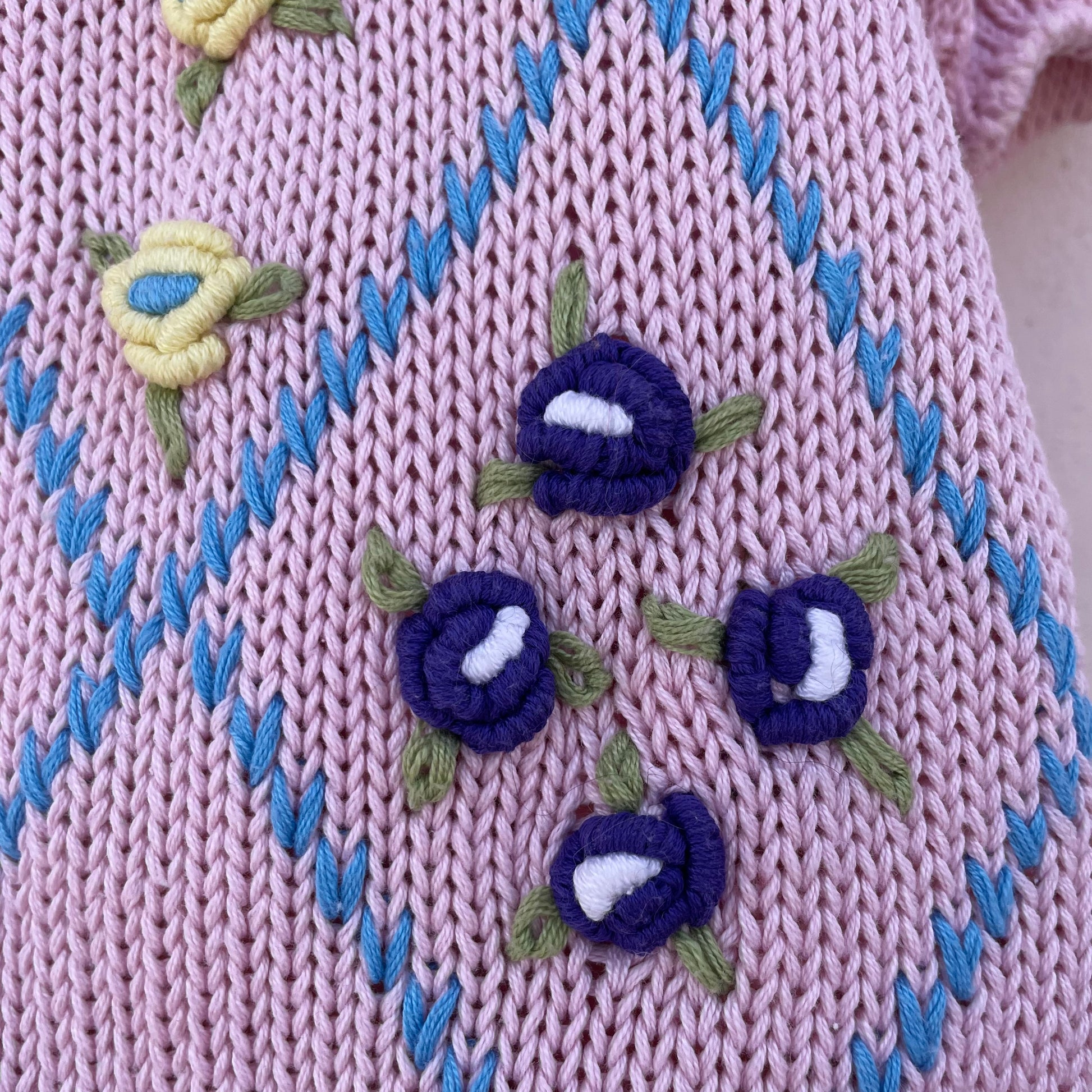 Cardigan fatto a mano in cotone rosa con ricami roselline.