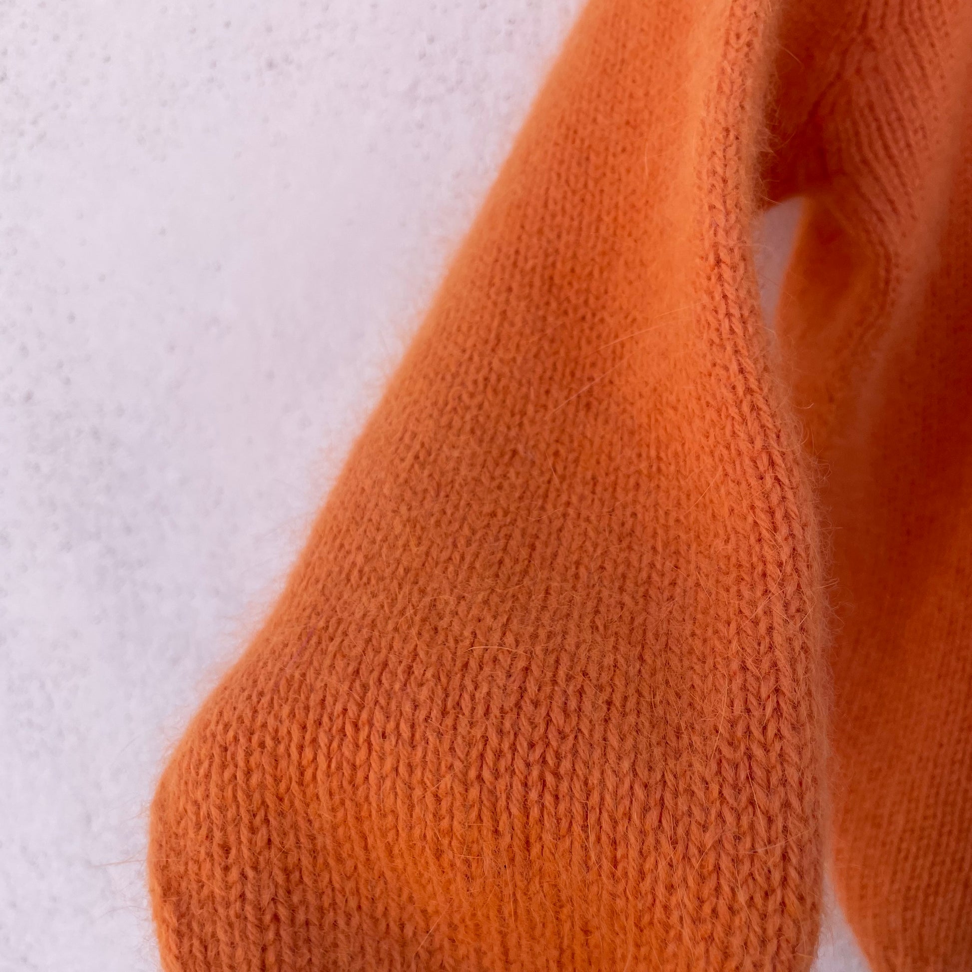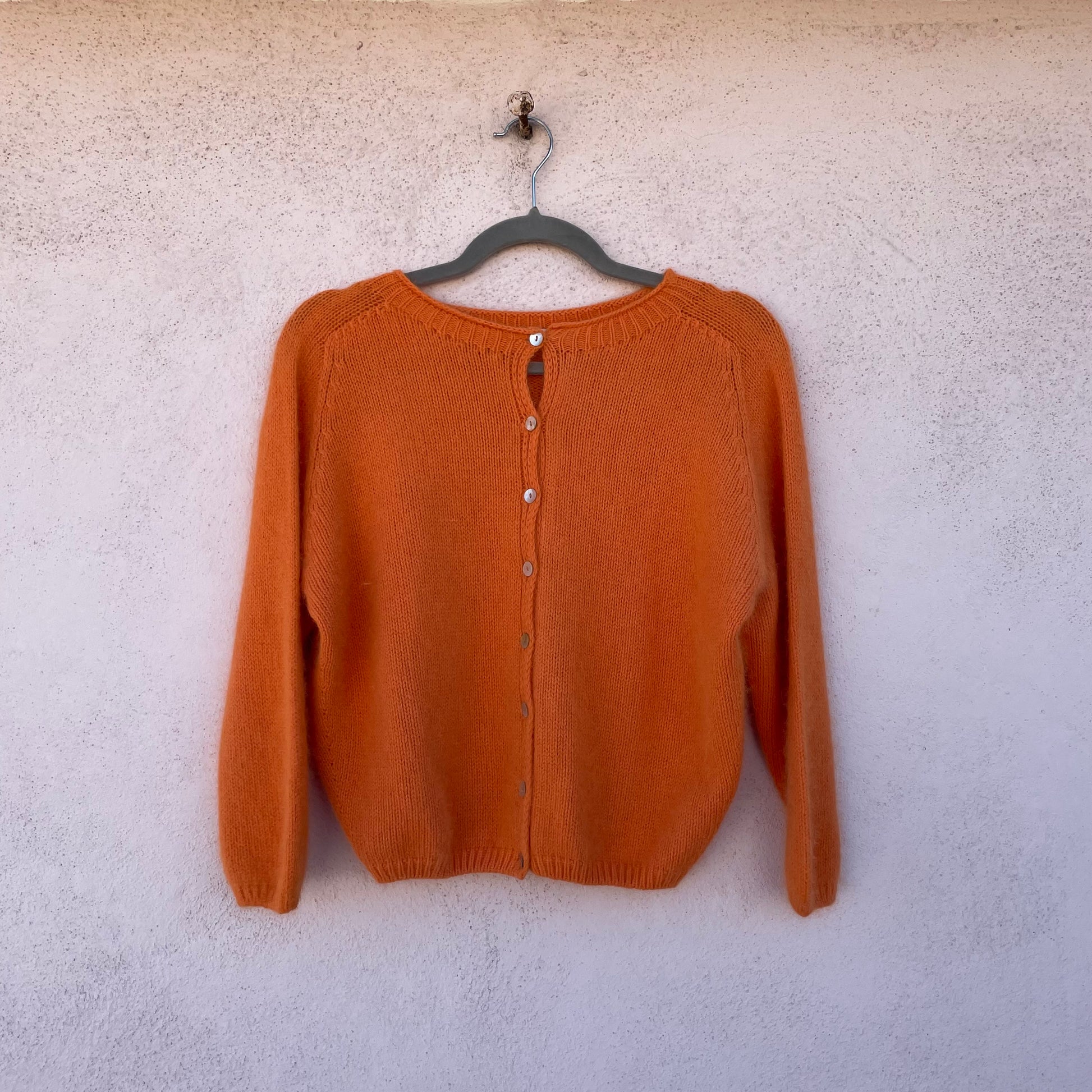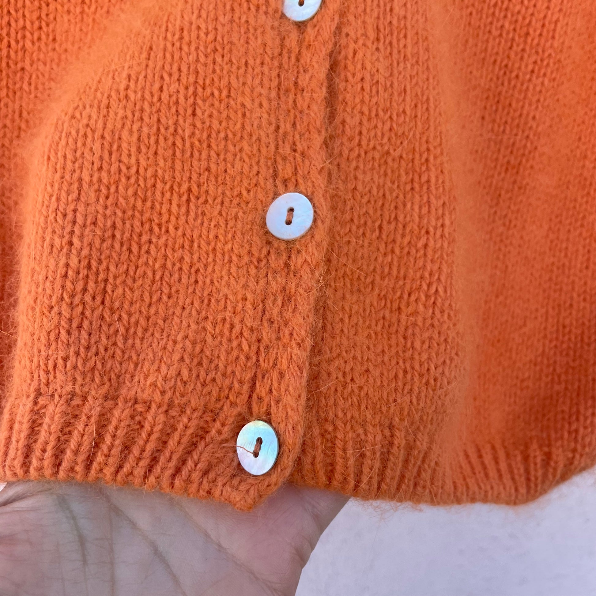 Cardigan mandarino 50% angora 45% poli 5% lana con bottoni in madreperla.