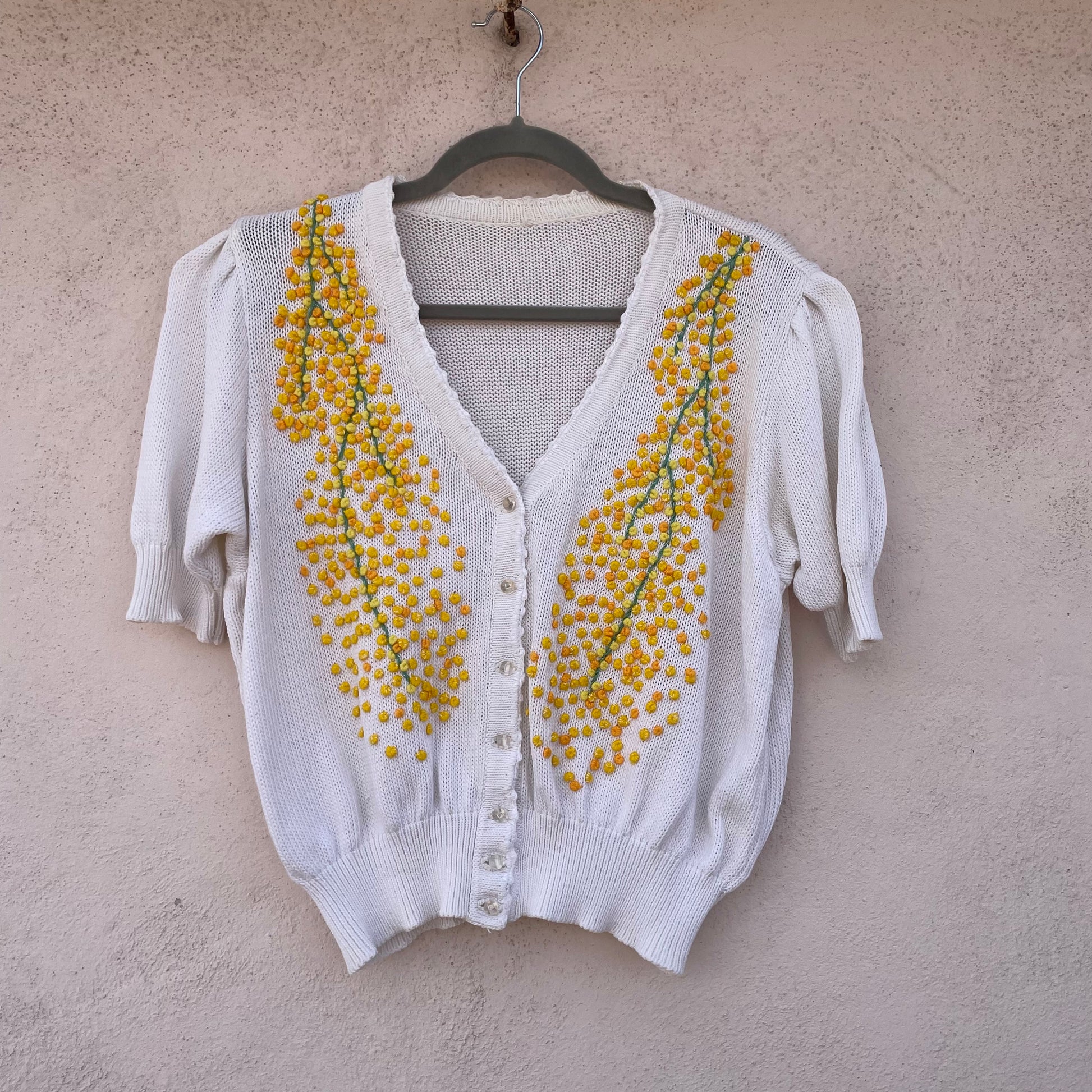 Cardigan realizzato a mano in cotone con ricamo mimosa.