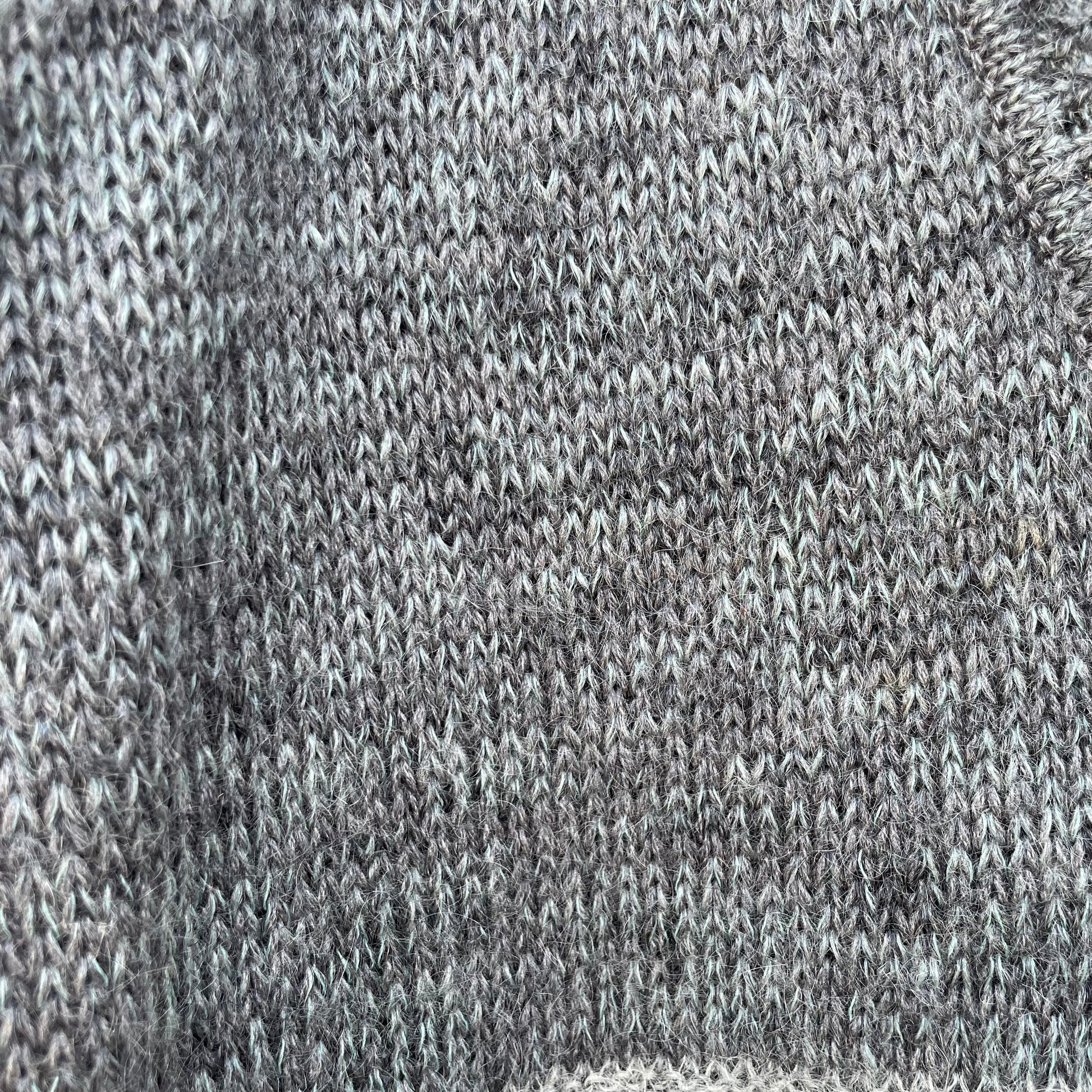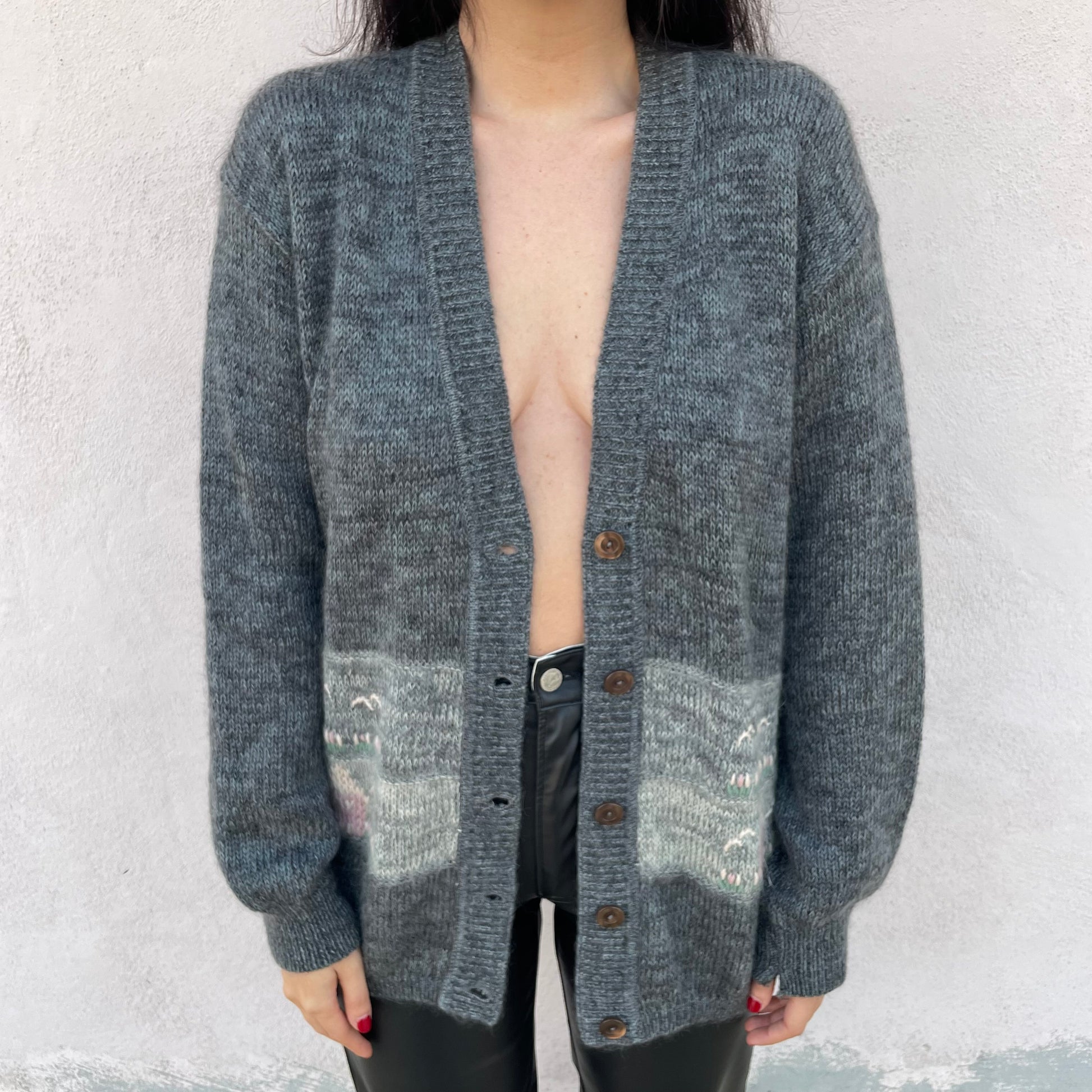 Cardigan grigio mélange con casette sulle tasche. 45% lana 22% mohair 33% nylon.