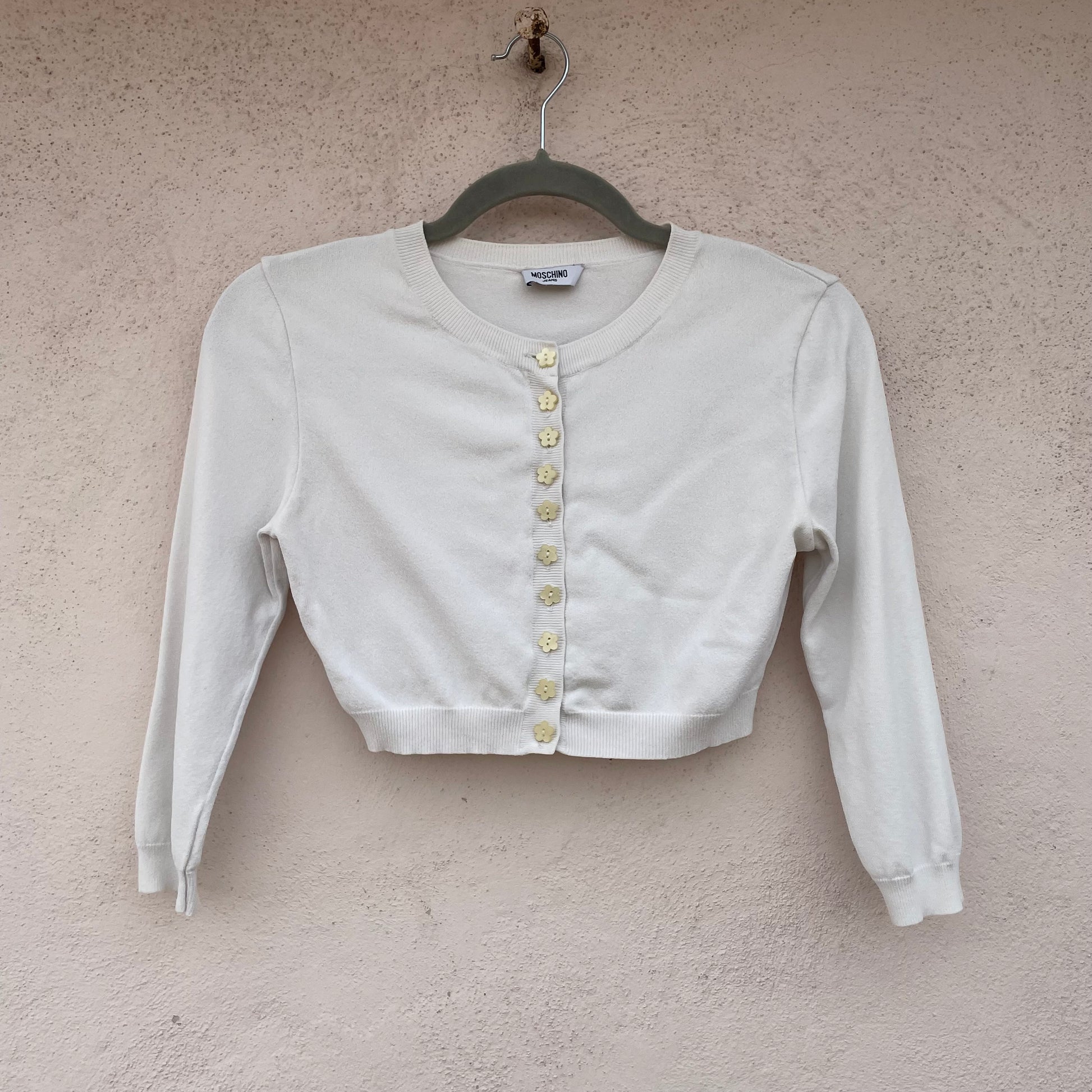 Cardigan crop Moschino bianco con bottoni a forma di fiorellino. Manca il merceologico, suppongo sia maglia di cotone con percentuale di elastan.