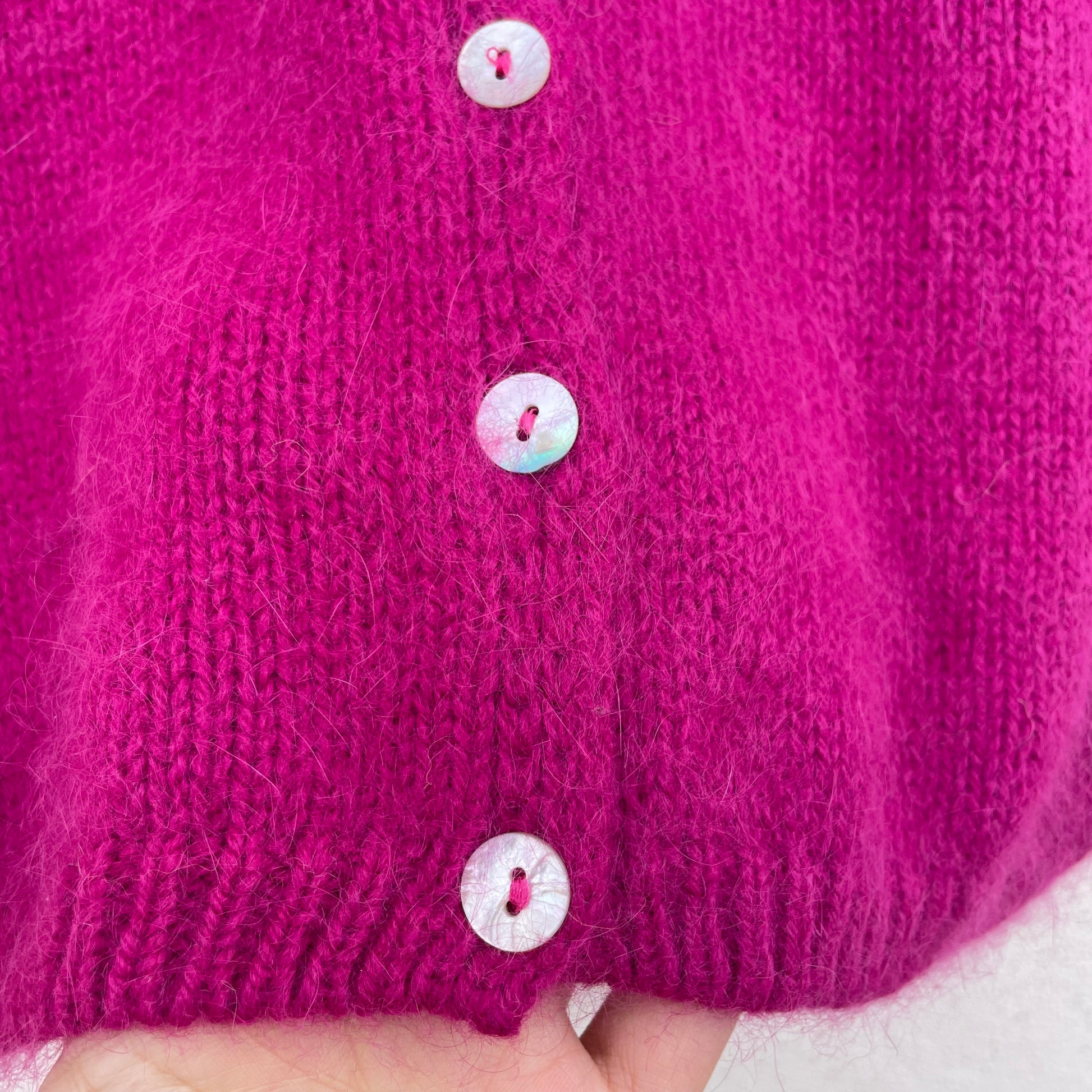 Cardigan magenta con bottoni in madreperla. 50% angora 5% lana 45% poli.