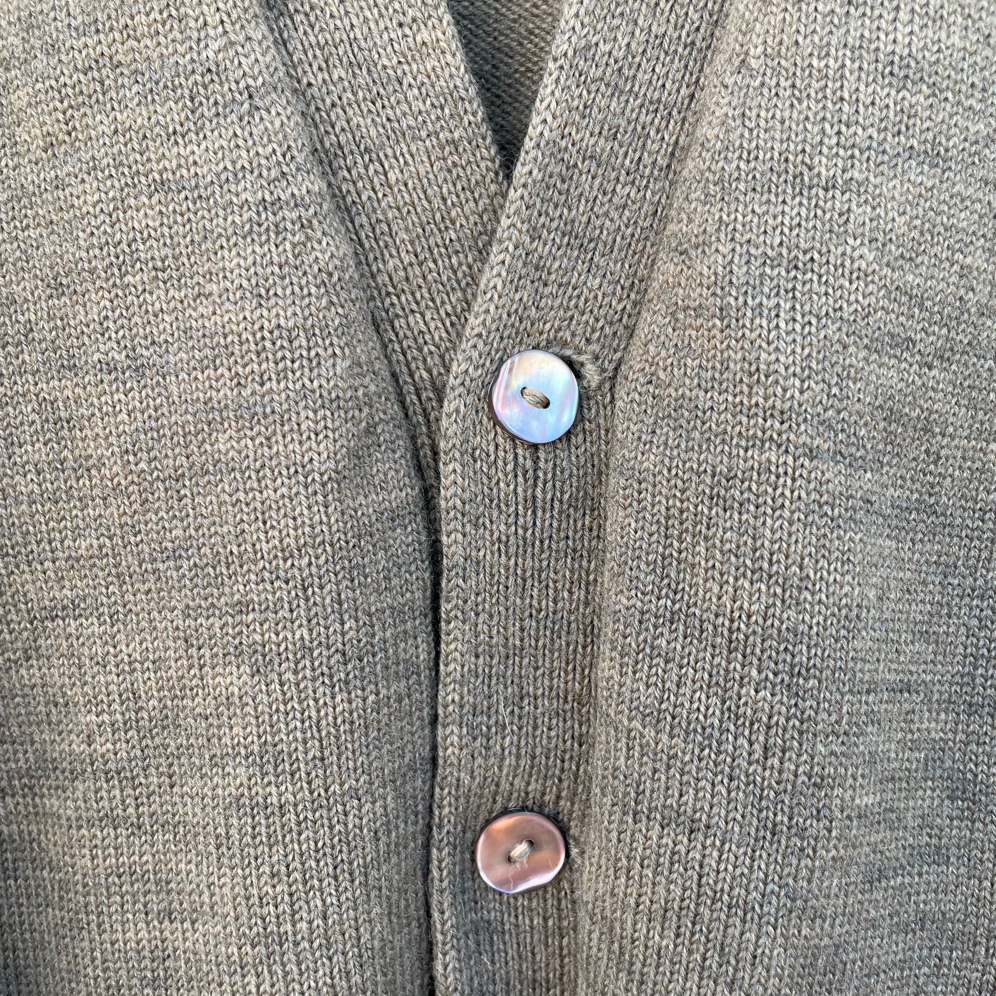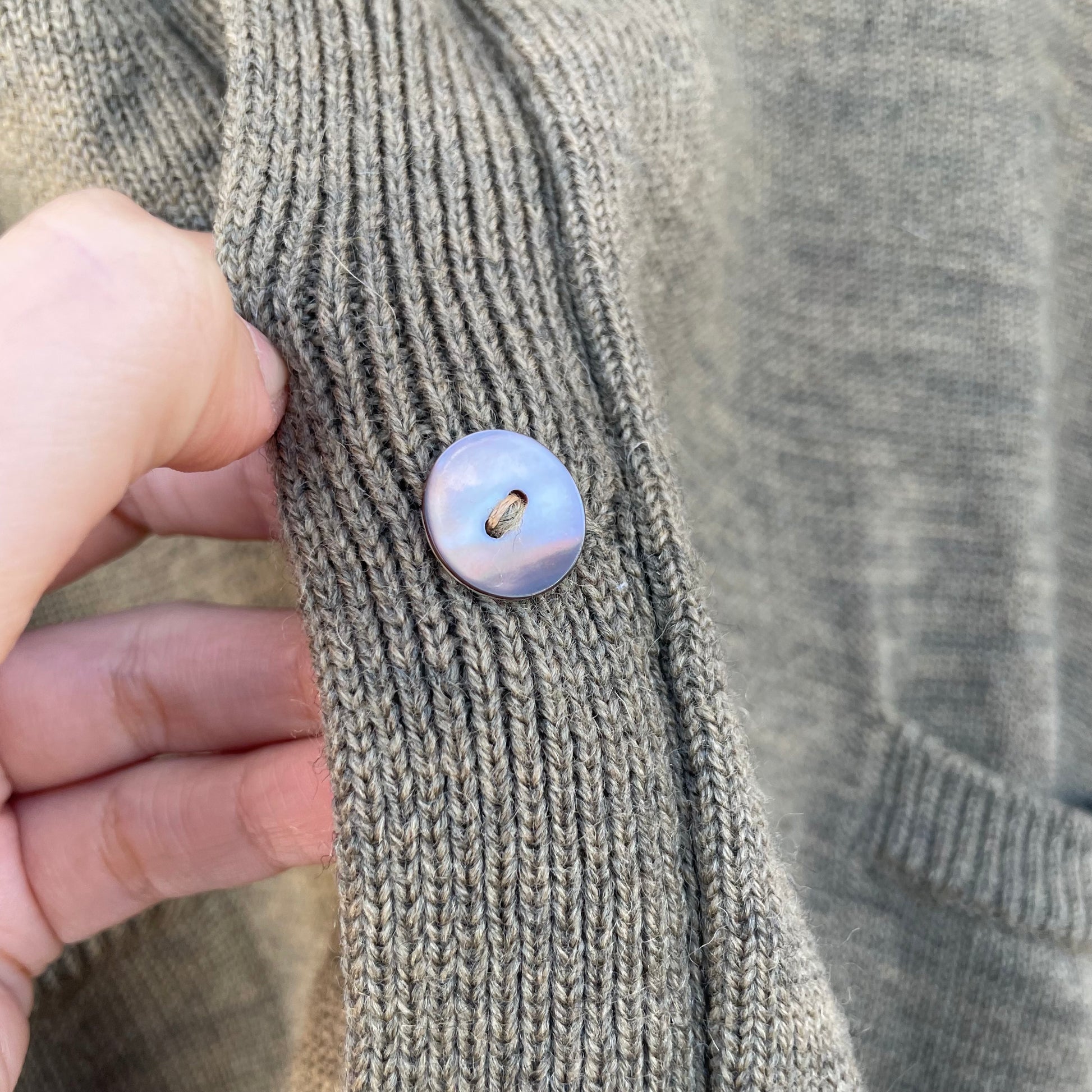 Cardigan verde muschio con taschini sul fondo. Bottoni in madreperla. Manca il merceologico ma è lana.