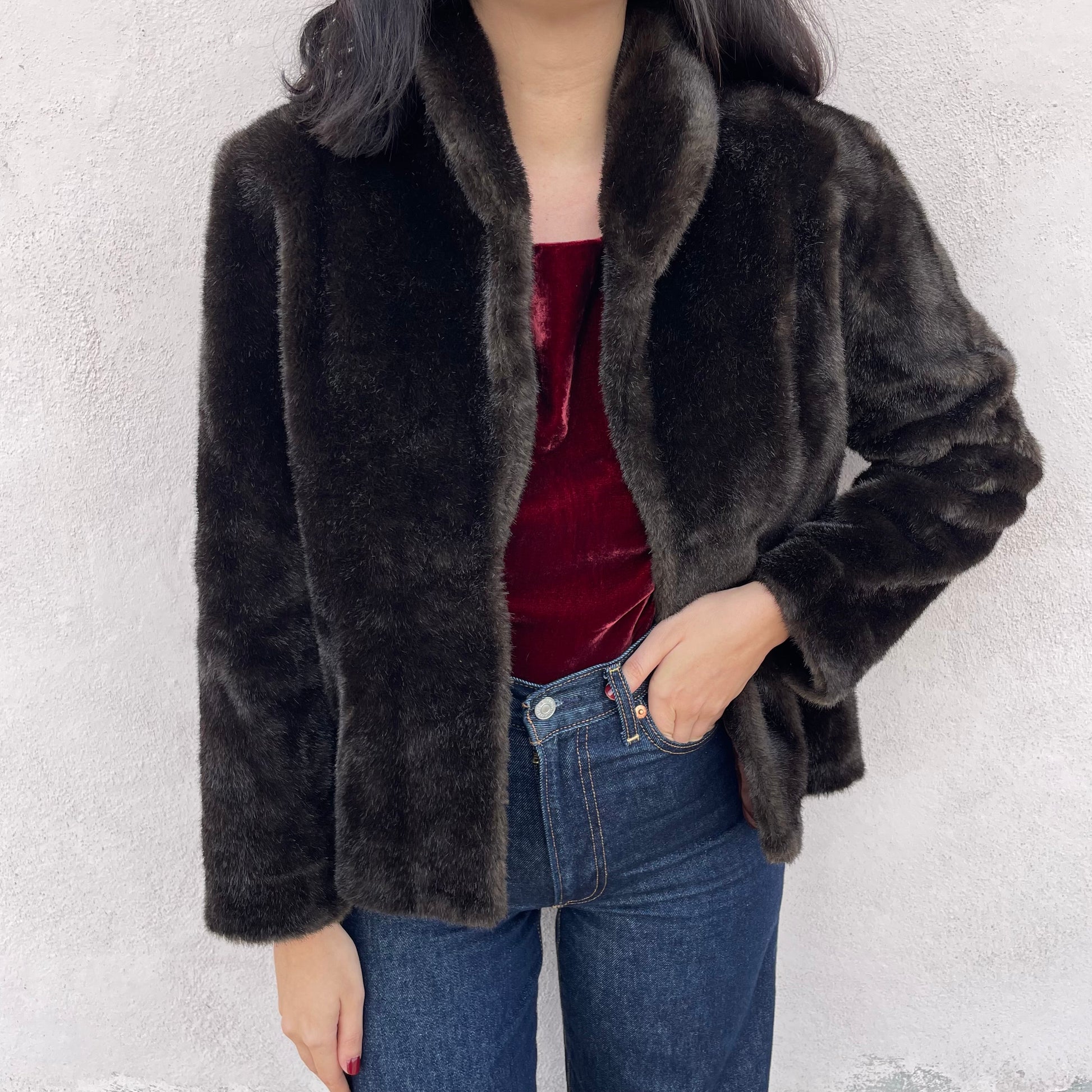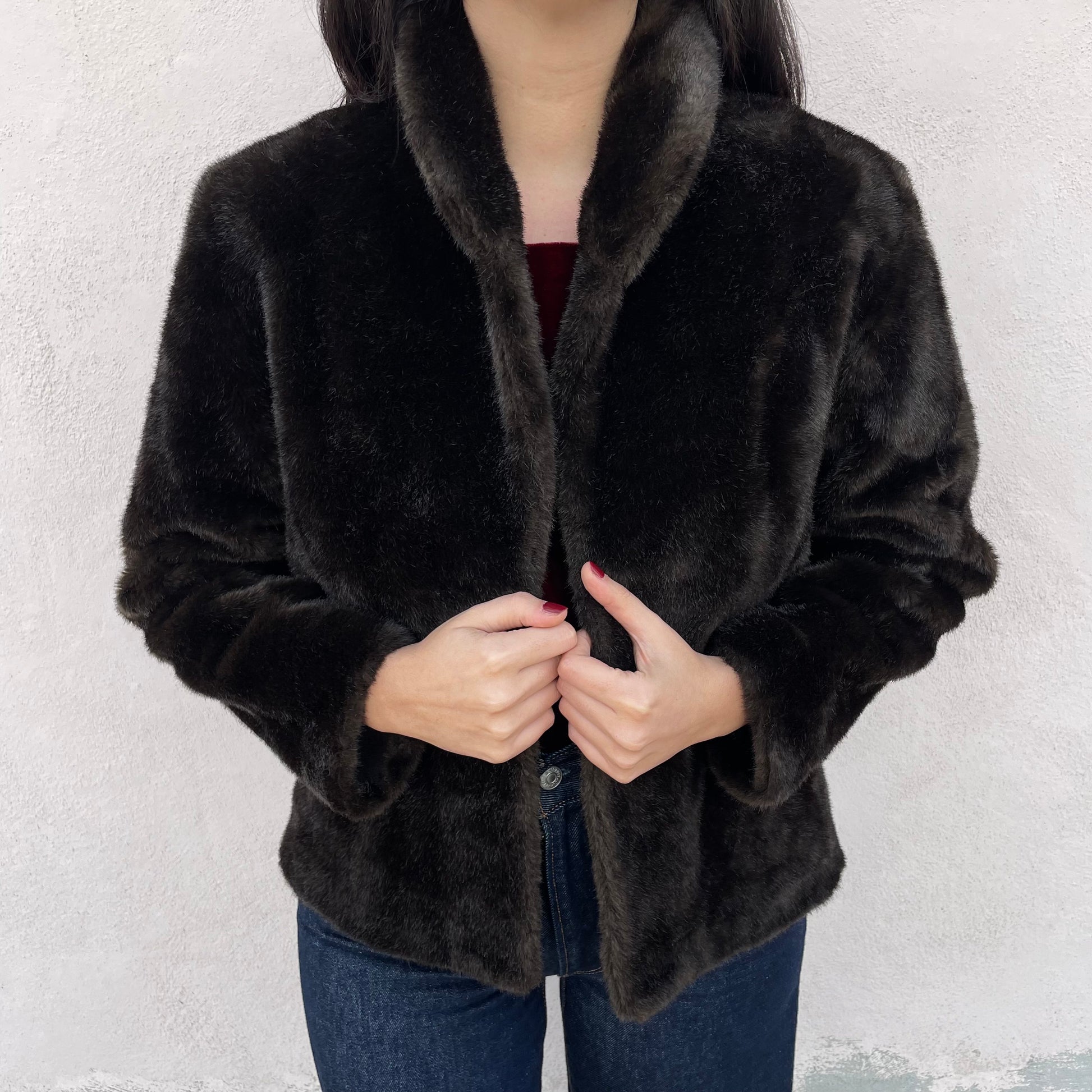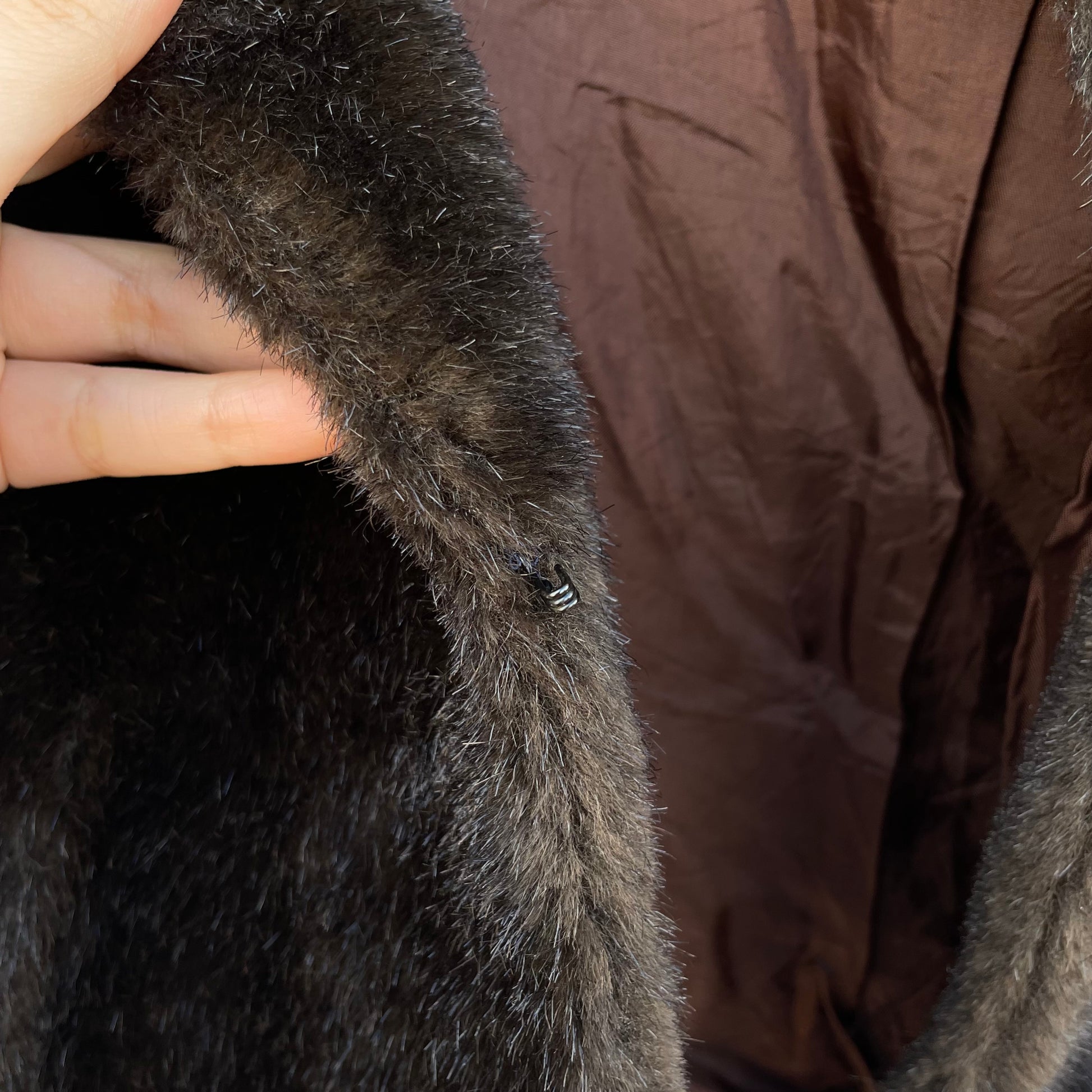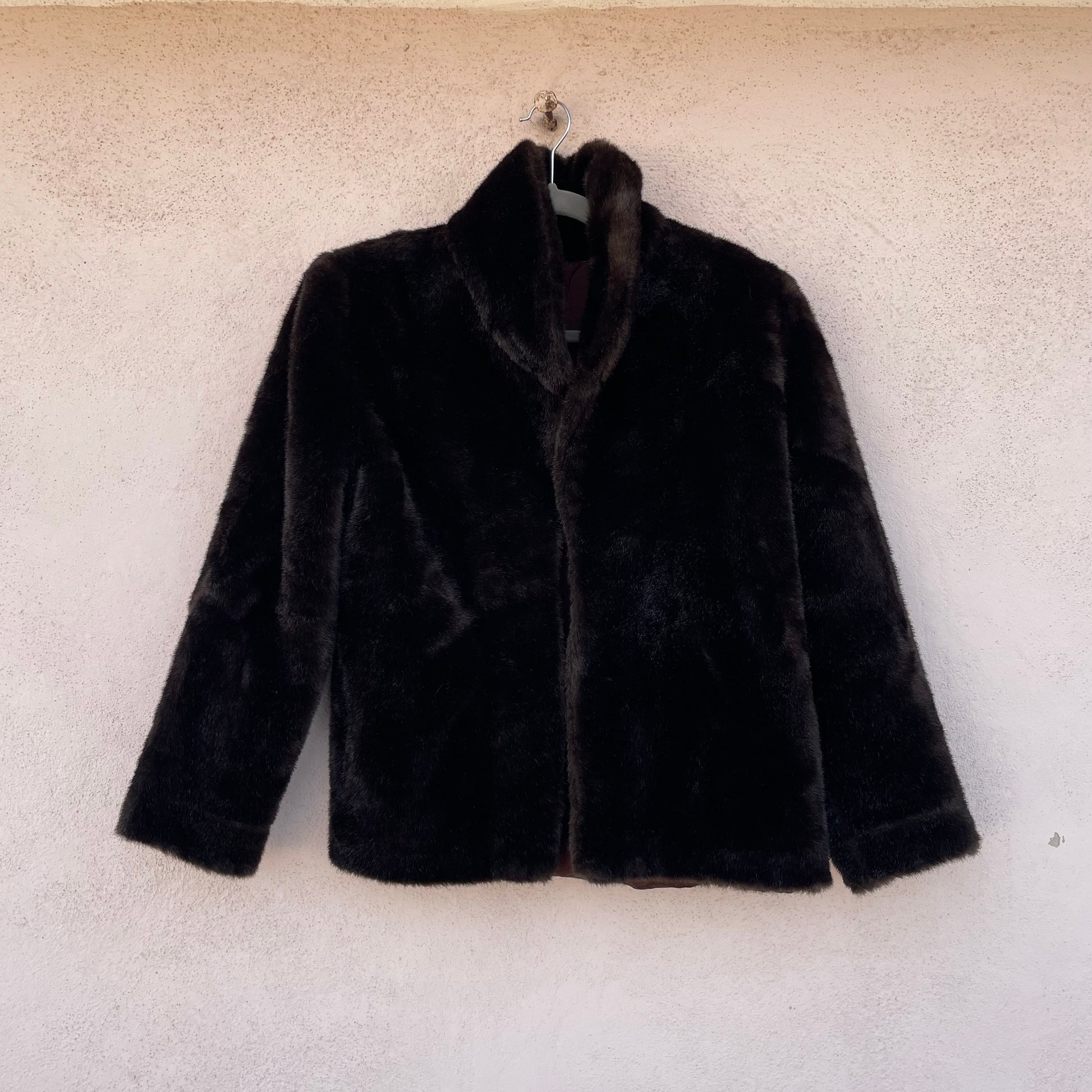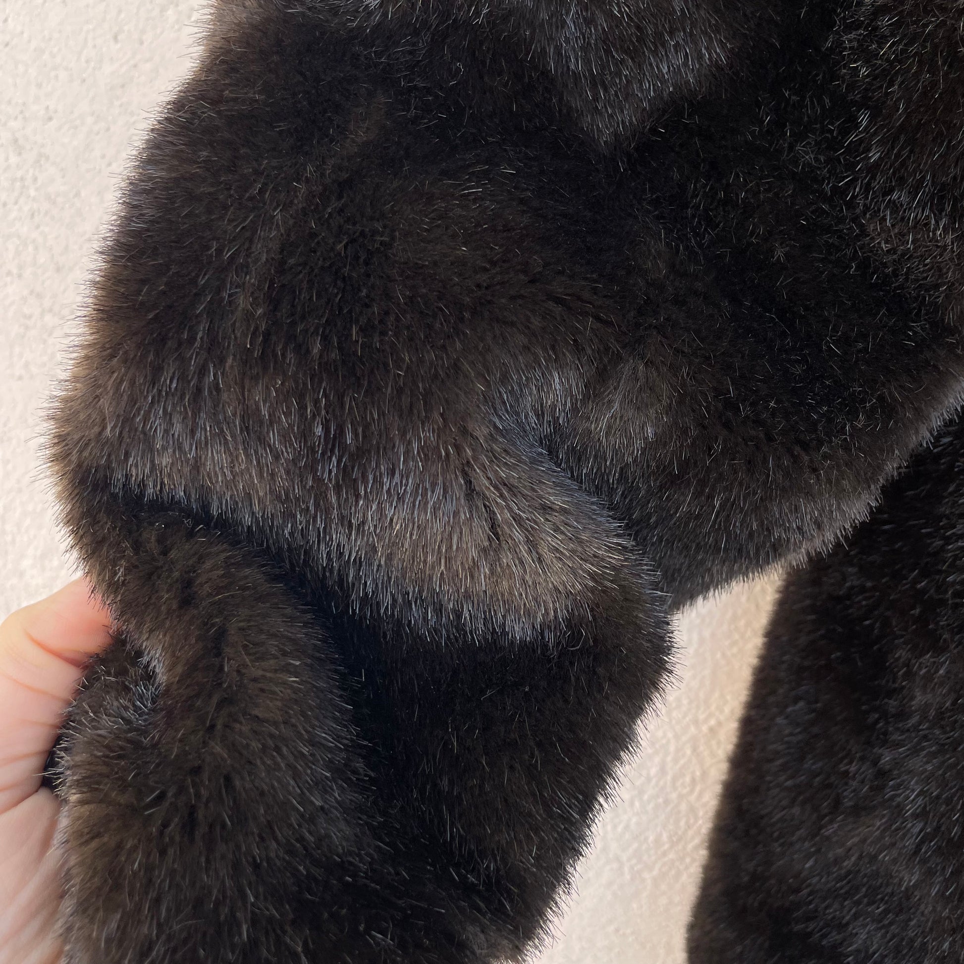 Ecopelliccia corta color testa di moro. Chiusura a un gancetto.