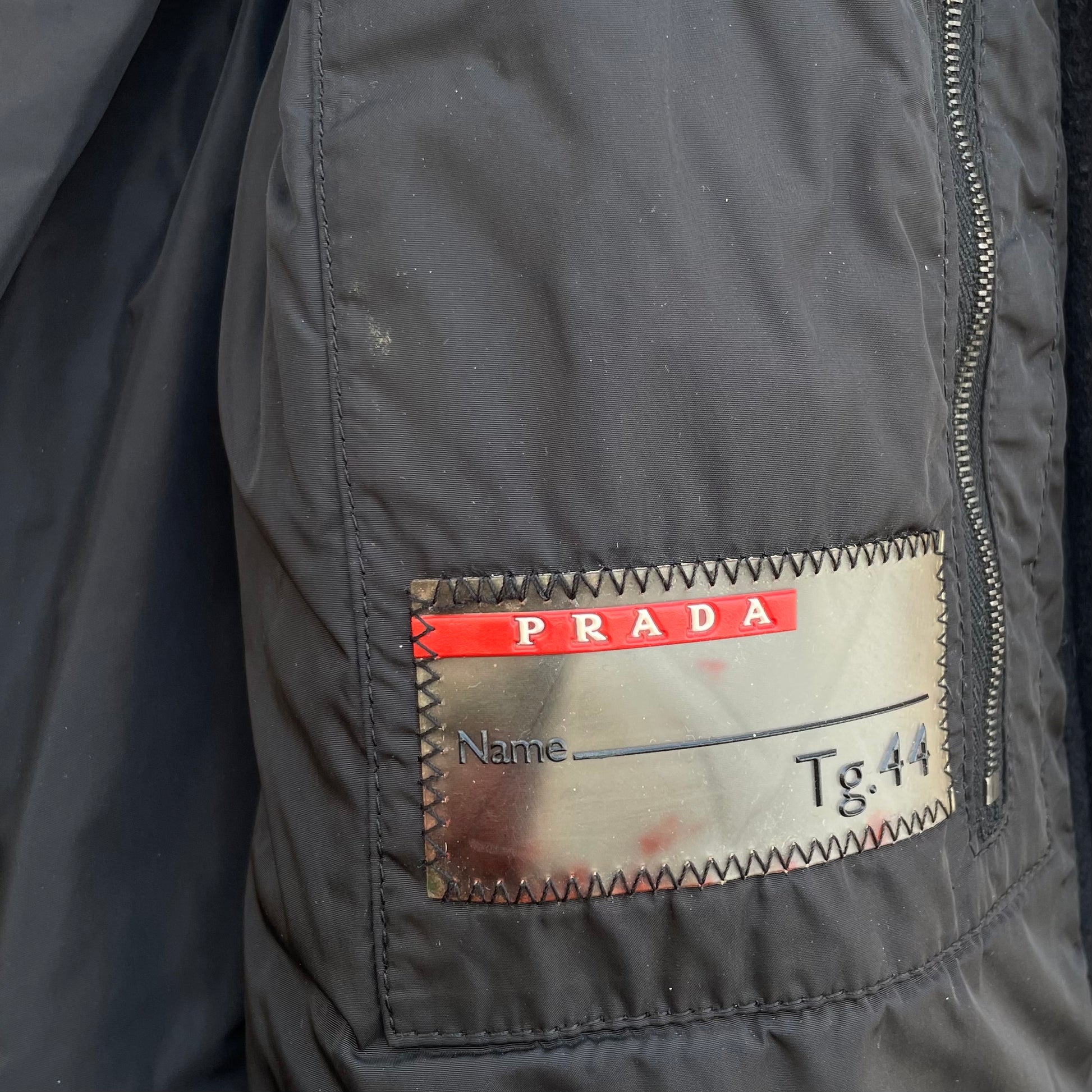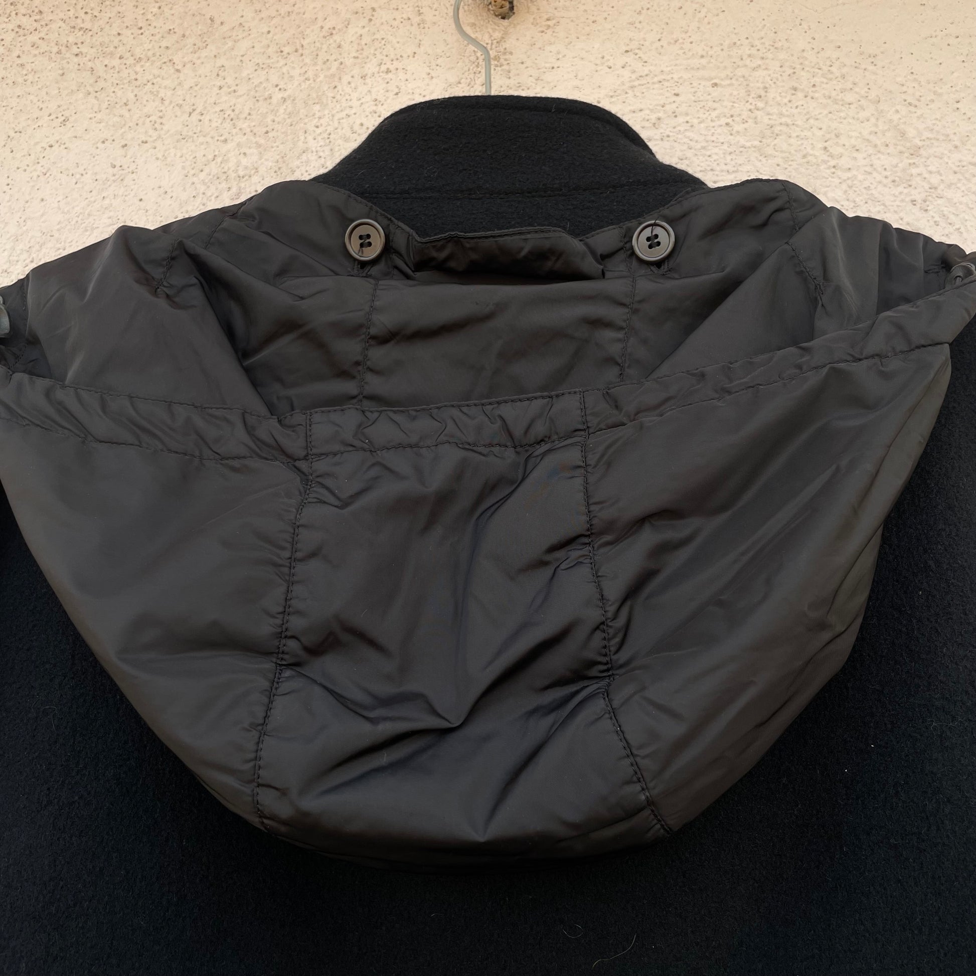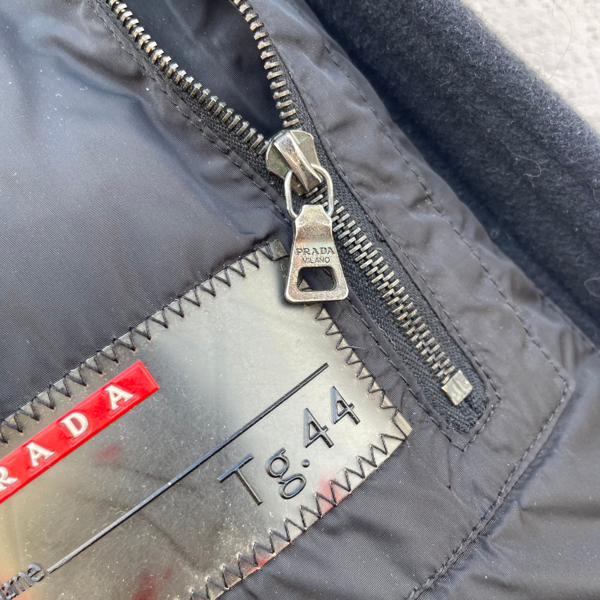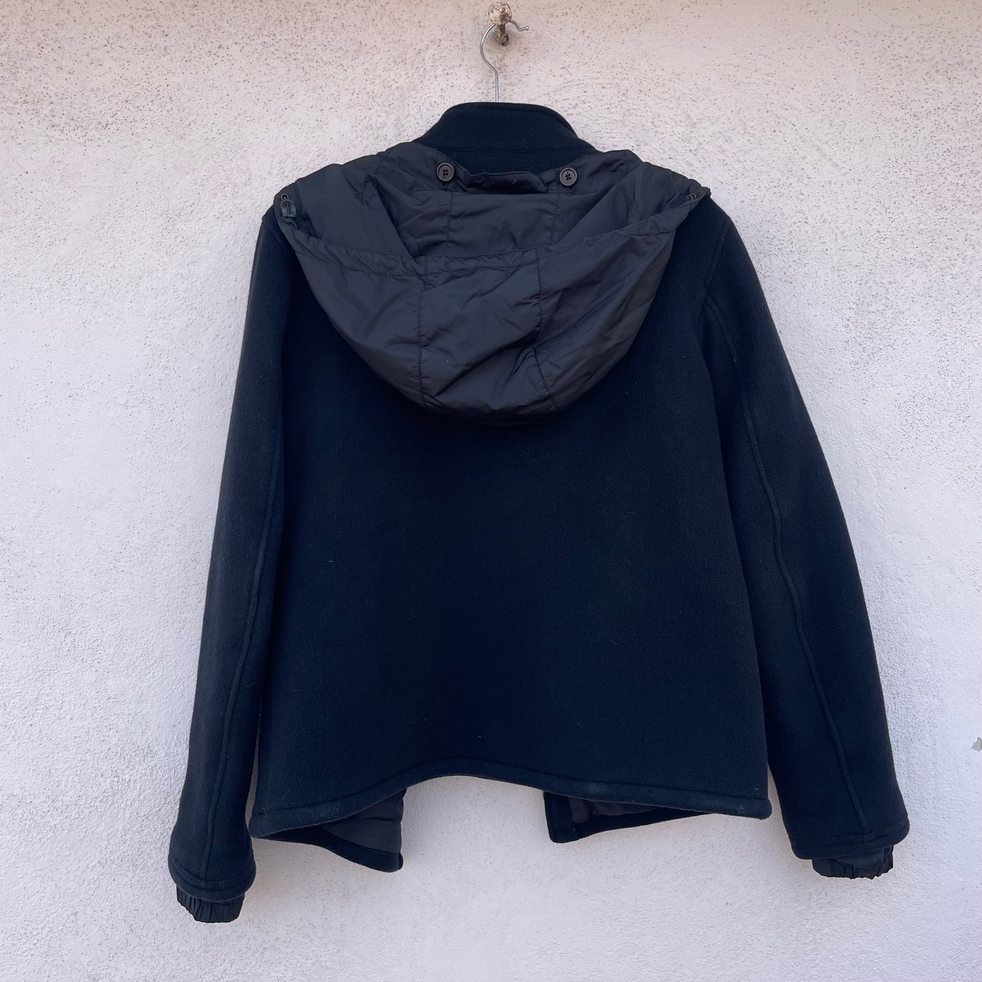 Giacca Prada Linea Rossa. Esterno 100% lana, imbottitura 100% polo cappuccio 100% nylon. Tasche interne.