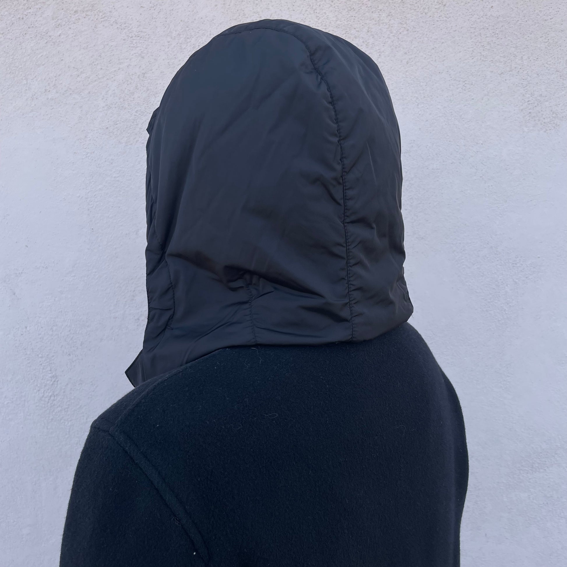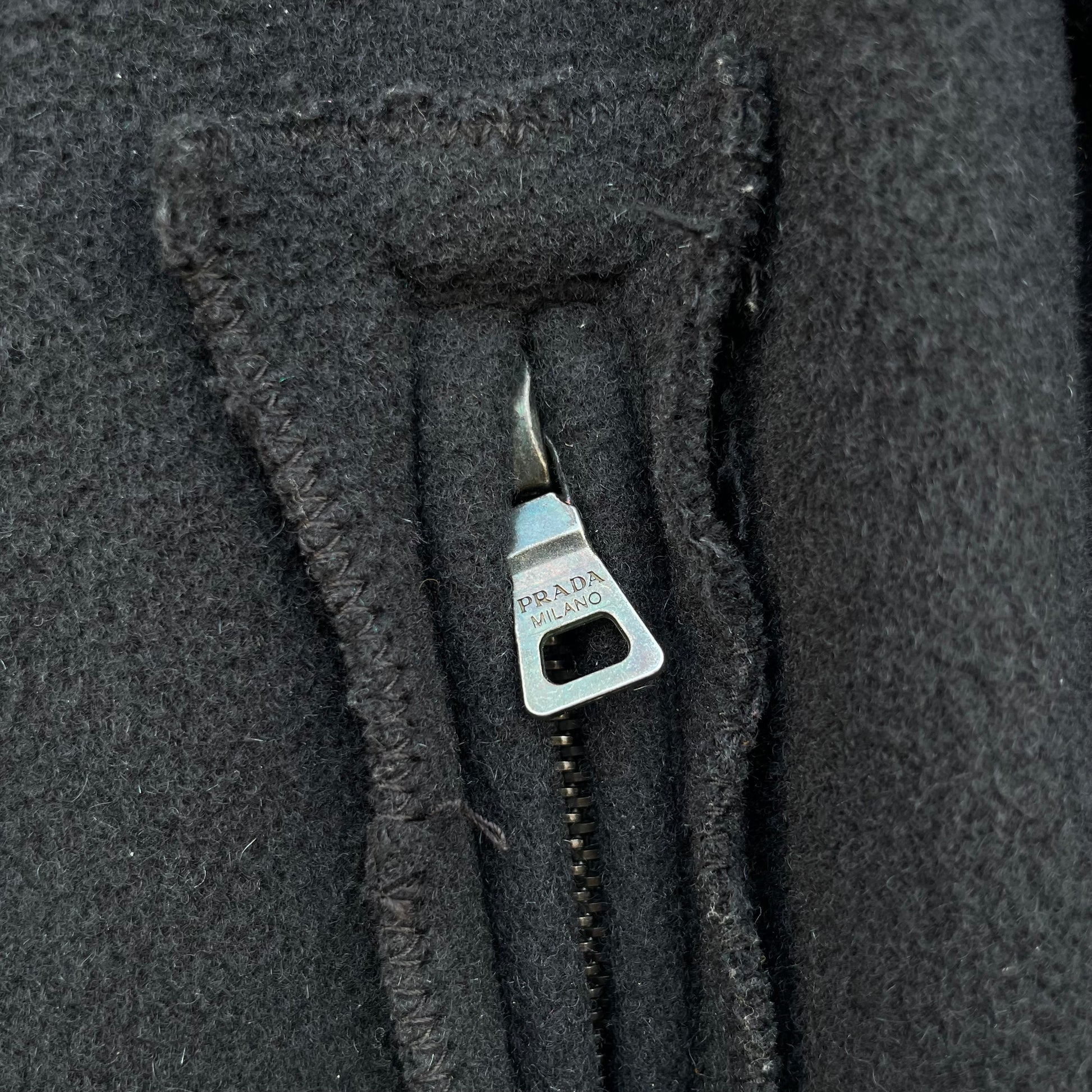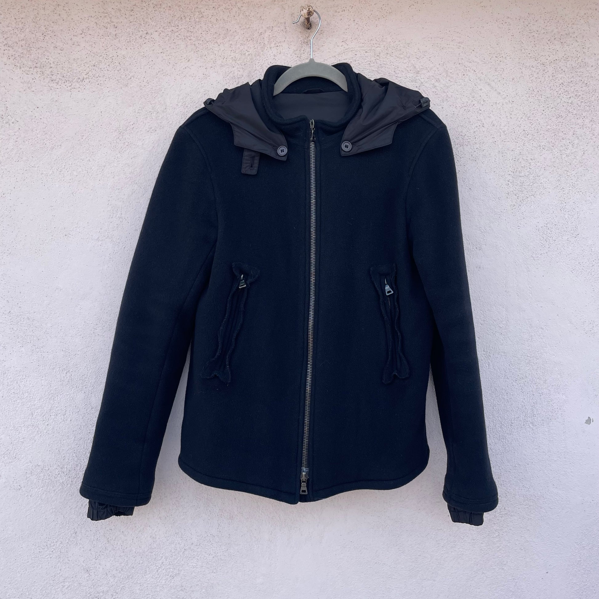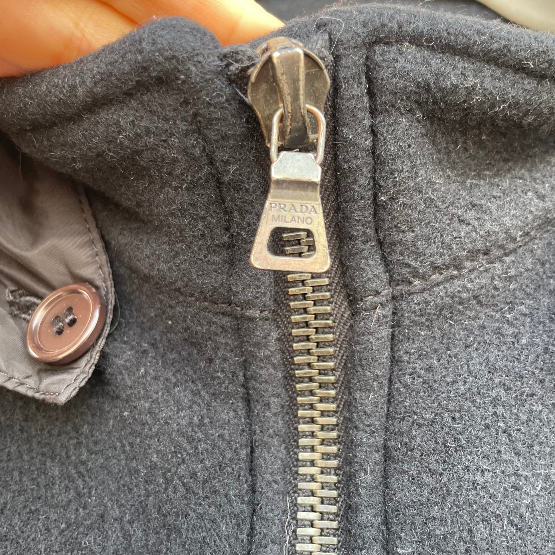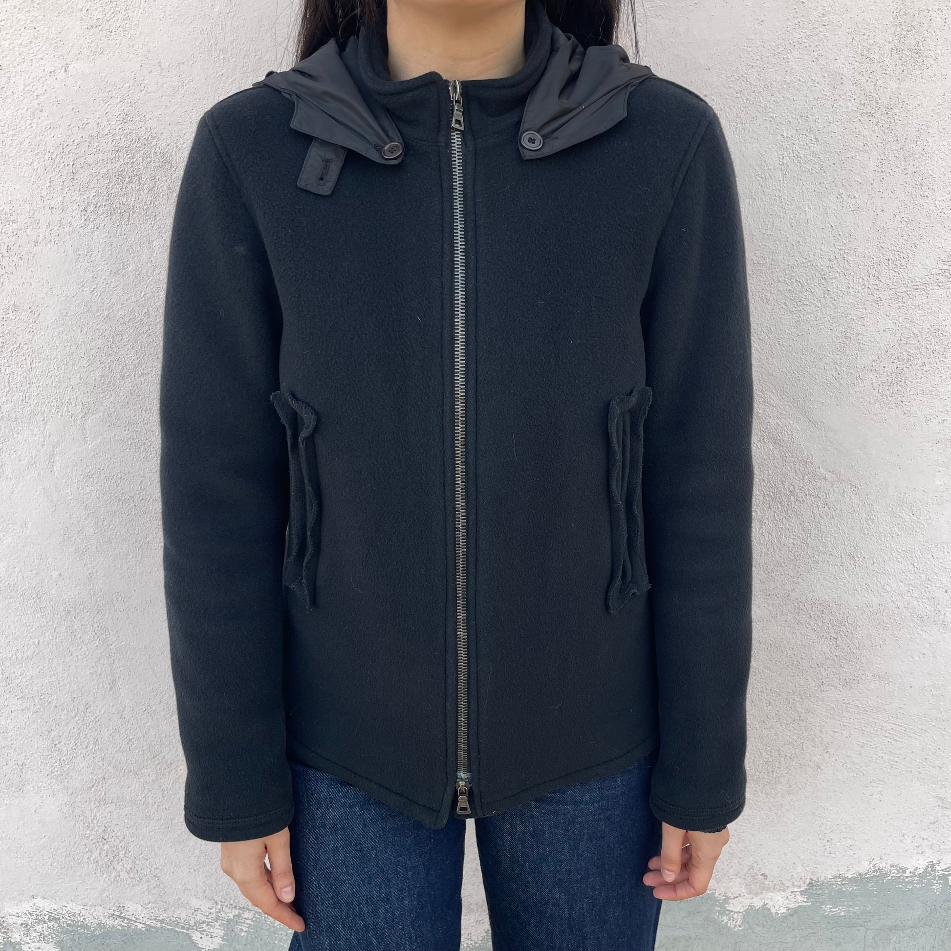 Giacca Prada Linea Rossa. Esterno 100% lana, imbottitura 100% polo cappuccio 100% nylon. Tasche interne.