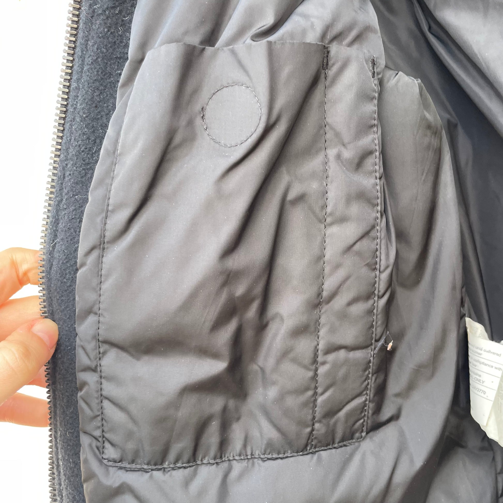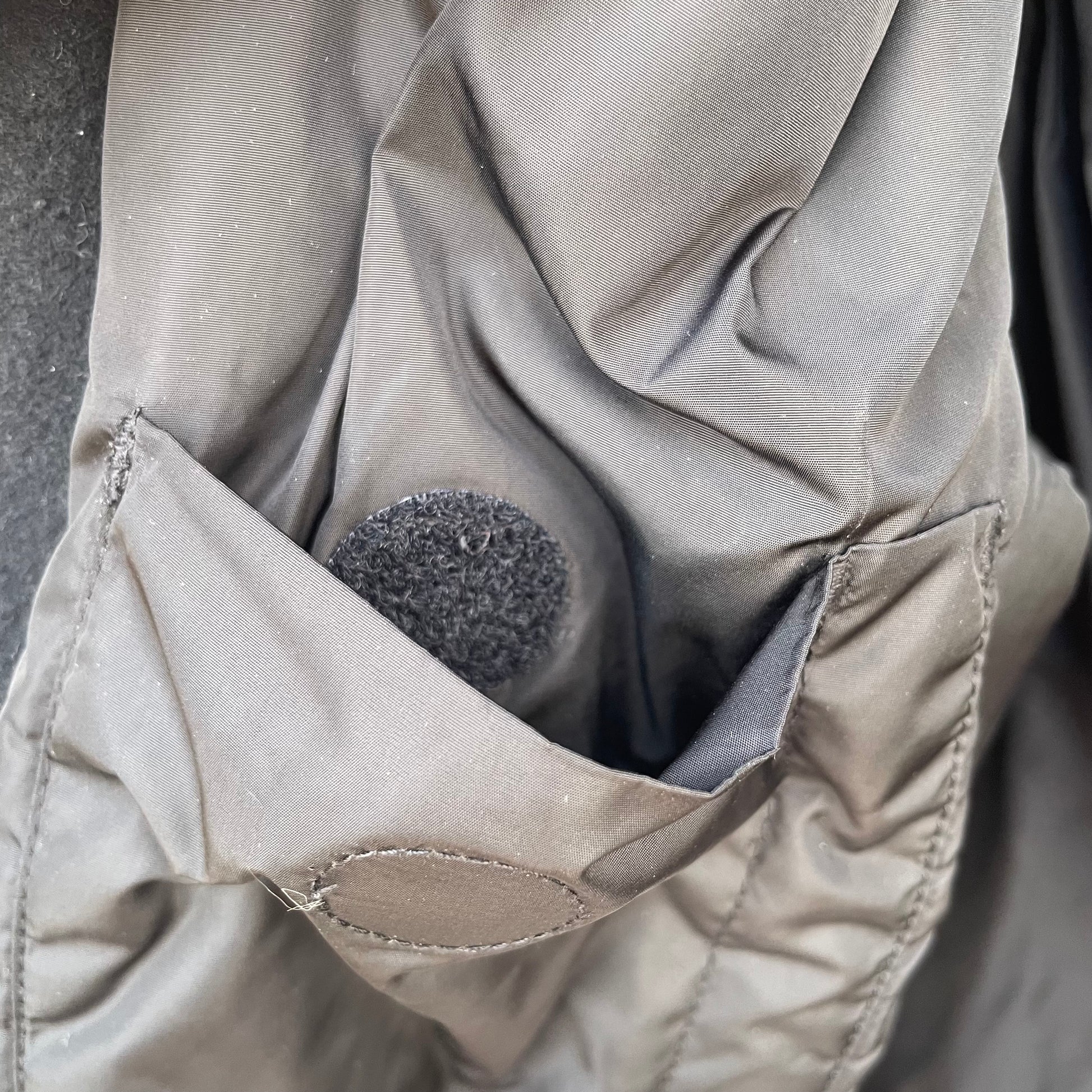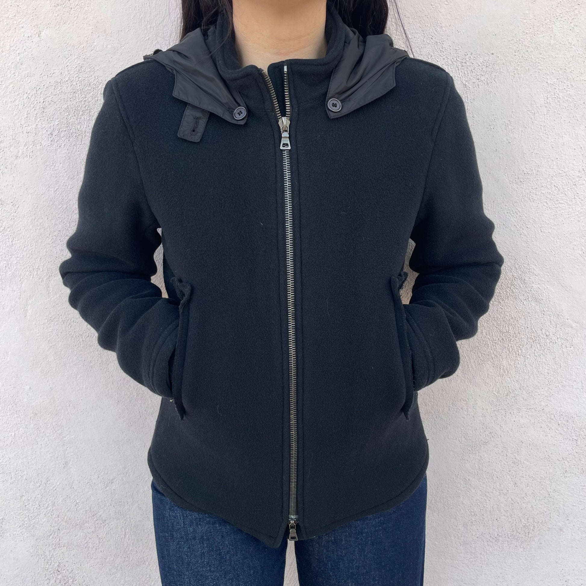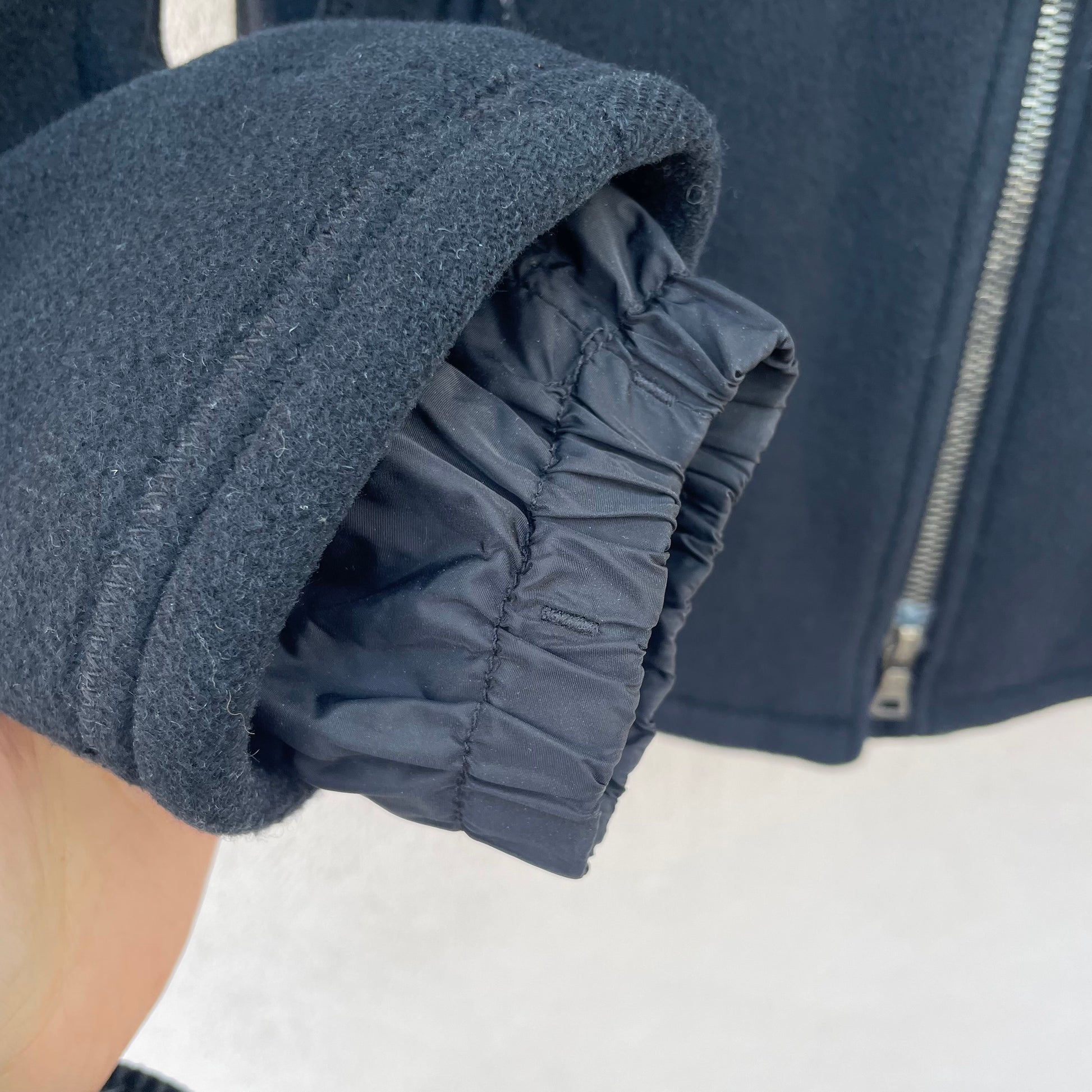 Giacca Prada Linea Rossa. Esterno 100% lana, imbottitura 100% polo cappuccio 100% nylon. Tasche interne.