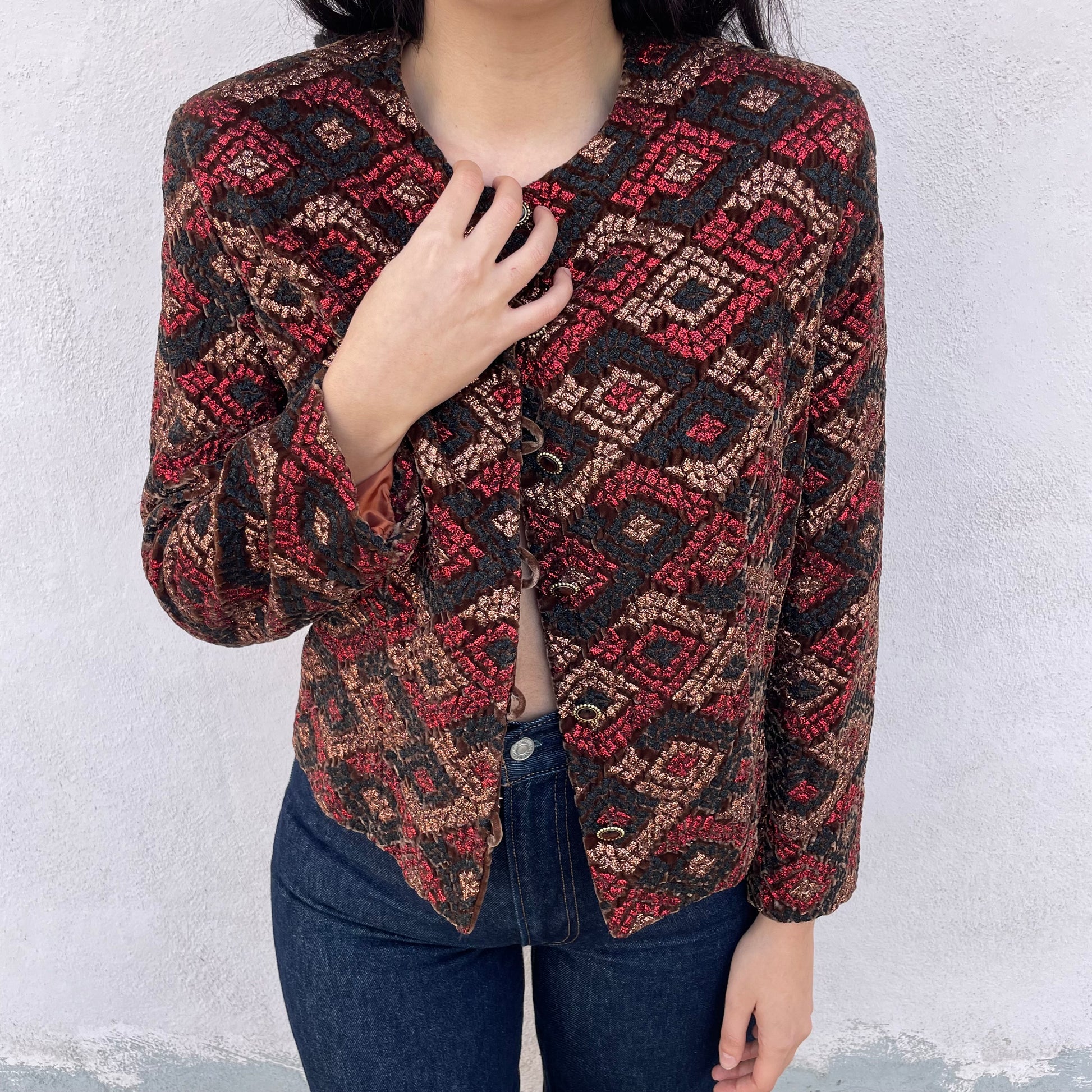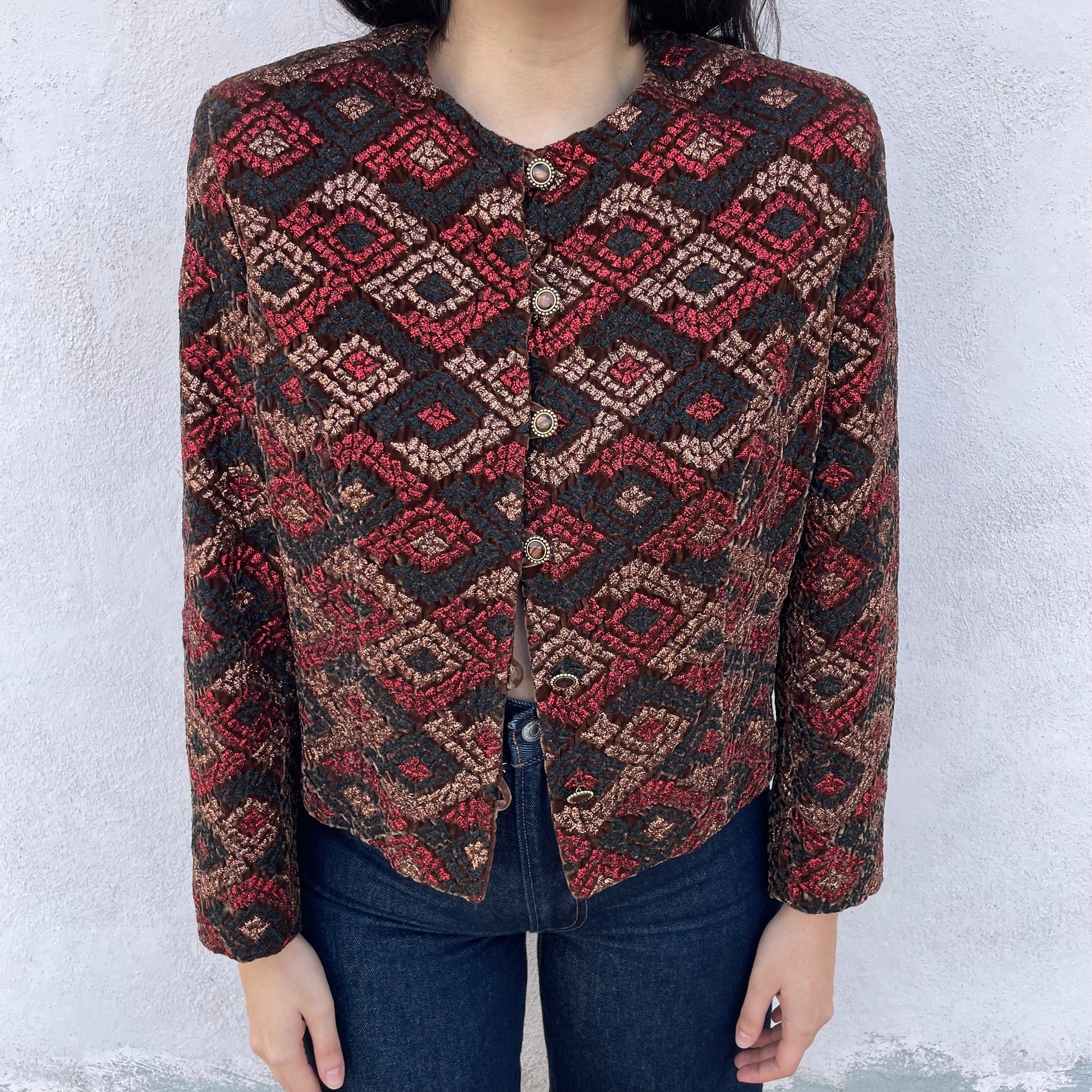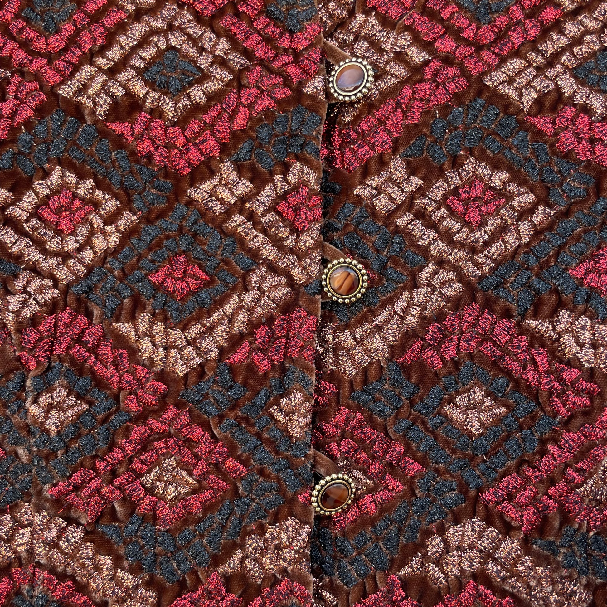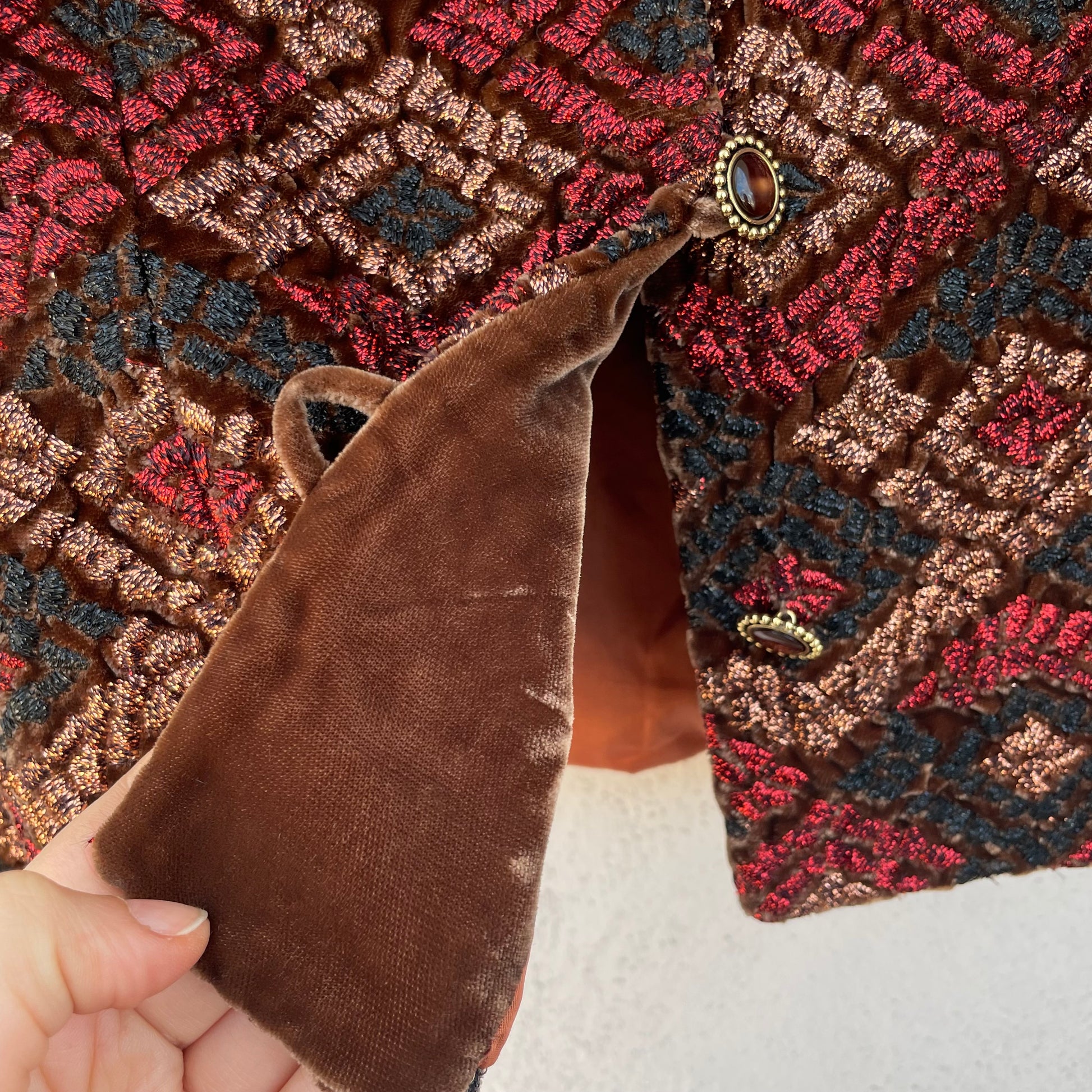 Giacchino marrone con motivo geometrico lurex e rifiniture in velluto. 43% viscosa 26% cupro 18% nylon 13% poli