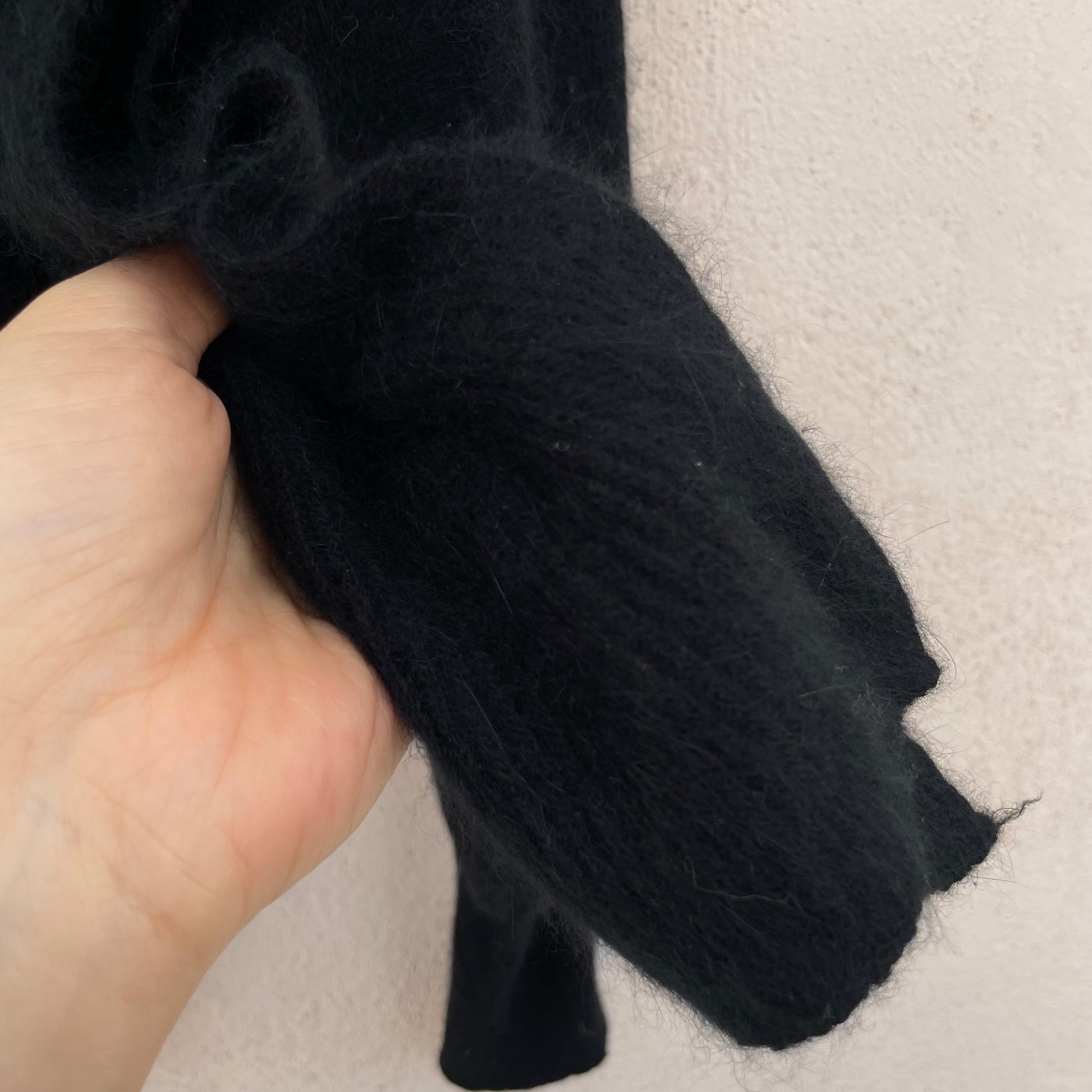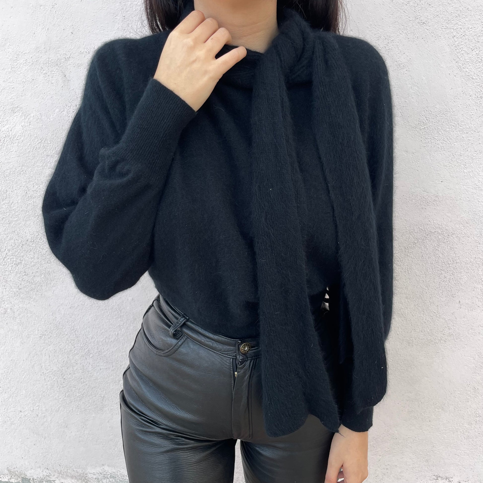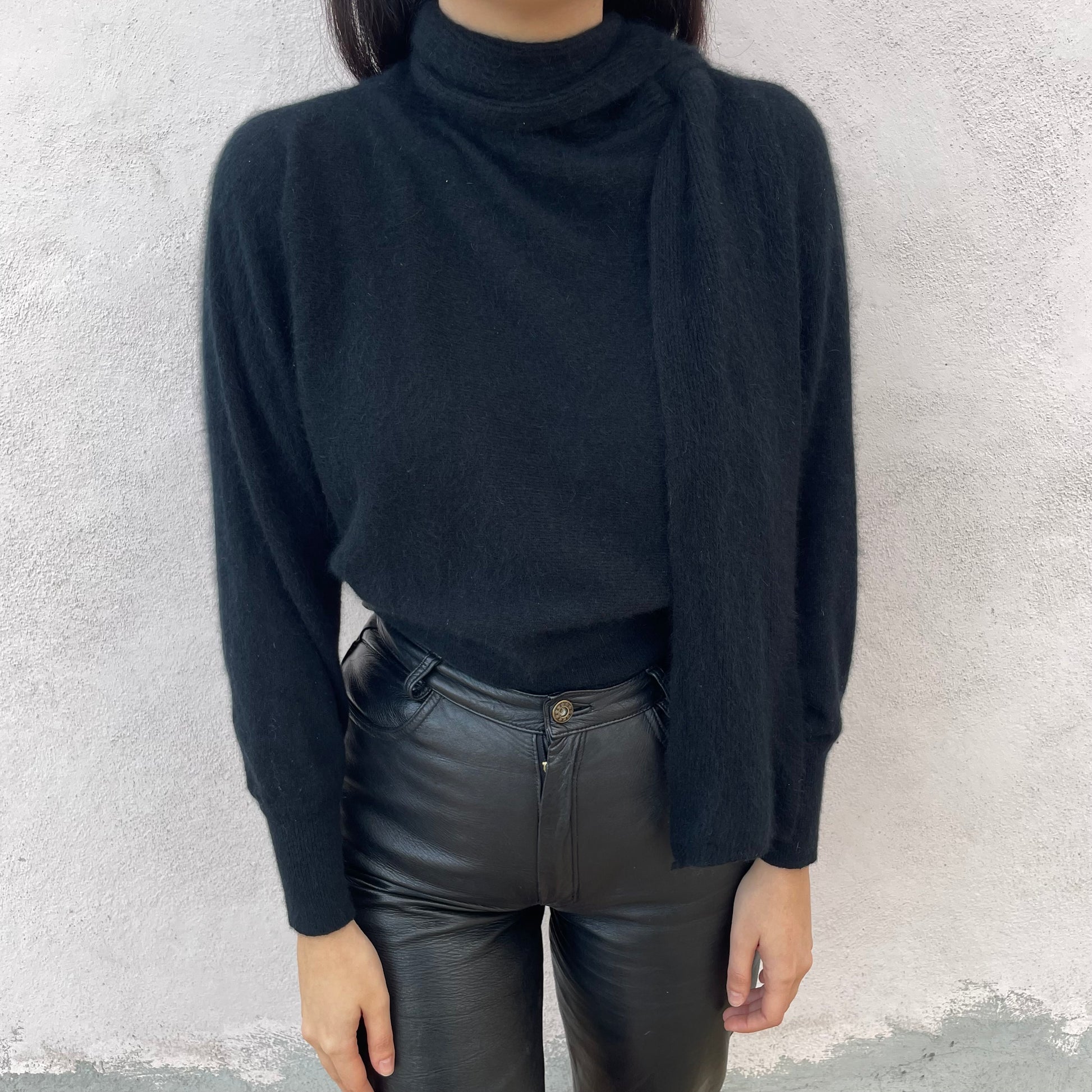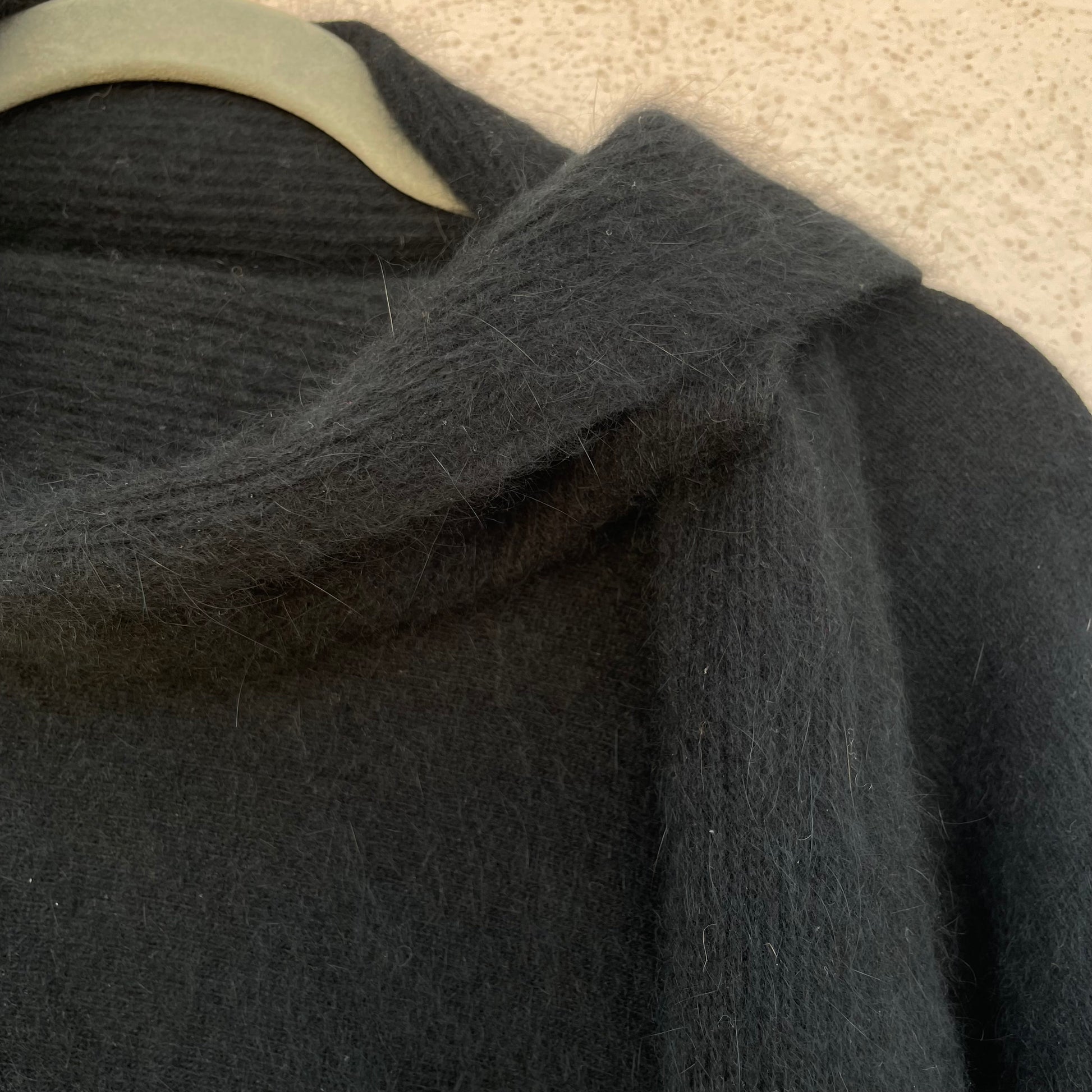 Golf nero corto a collo alto con sciarpina incorporata. Manca il merceologico ma è sicuramente angora (morbidissimo). Si stringe in vita.