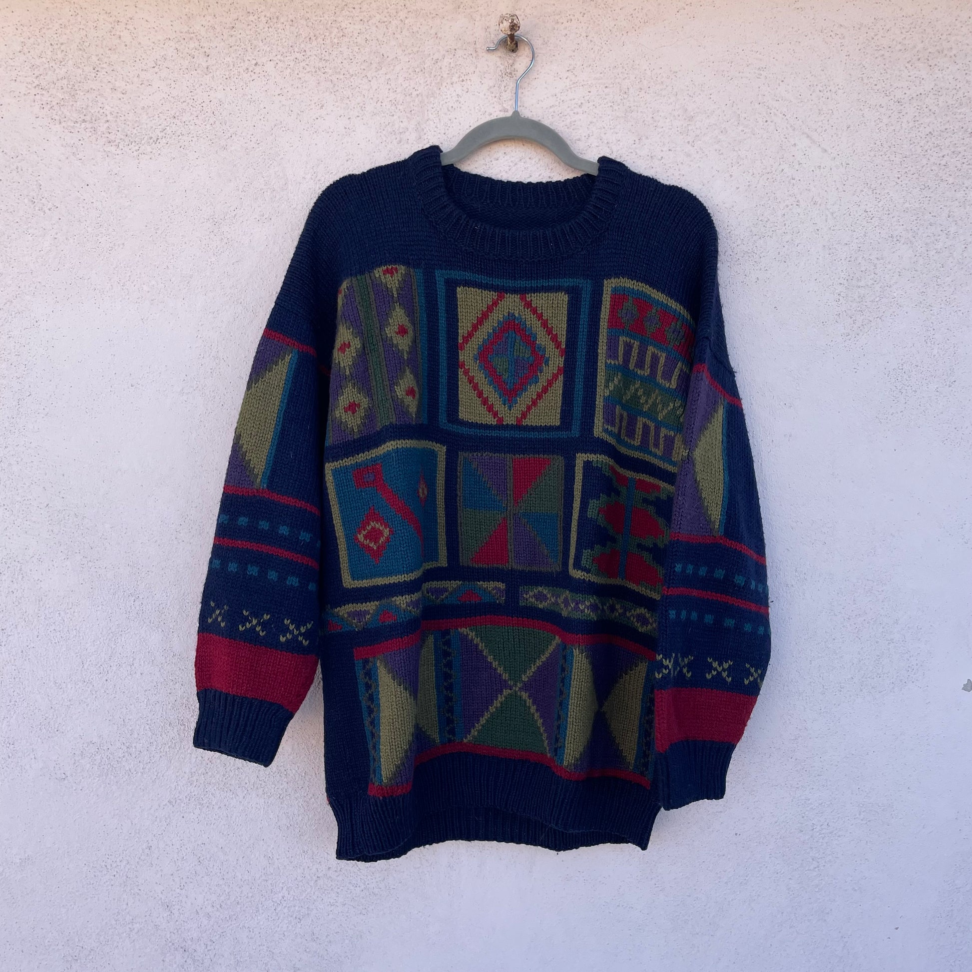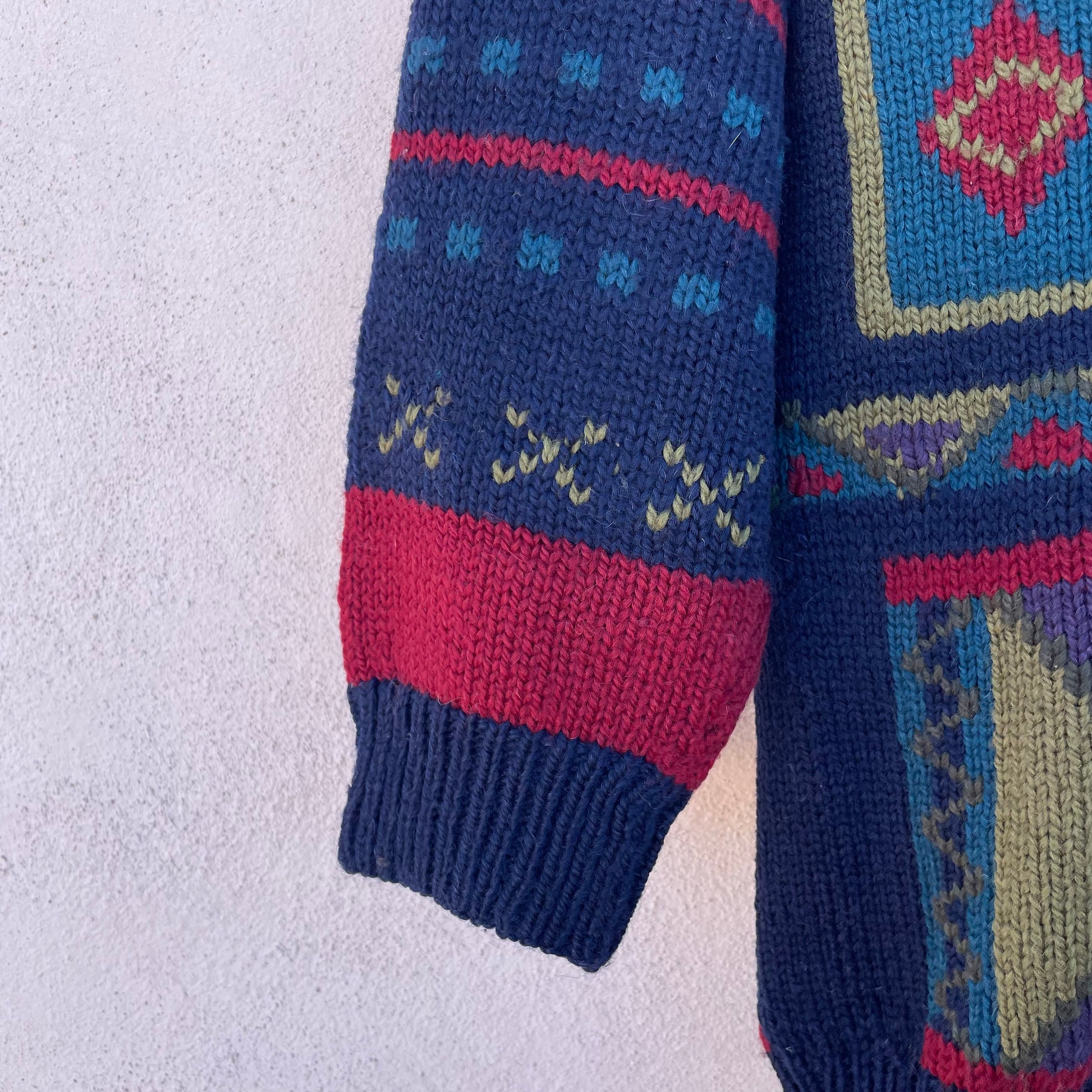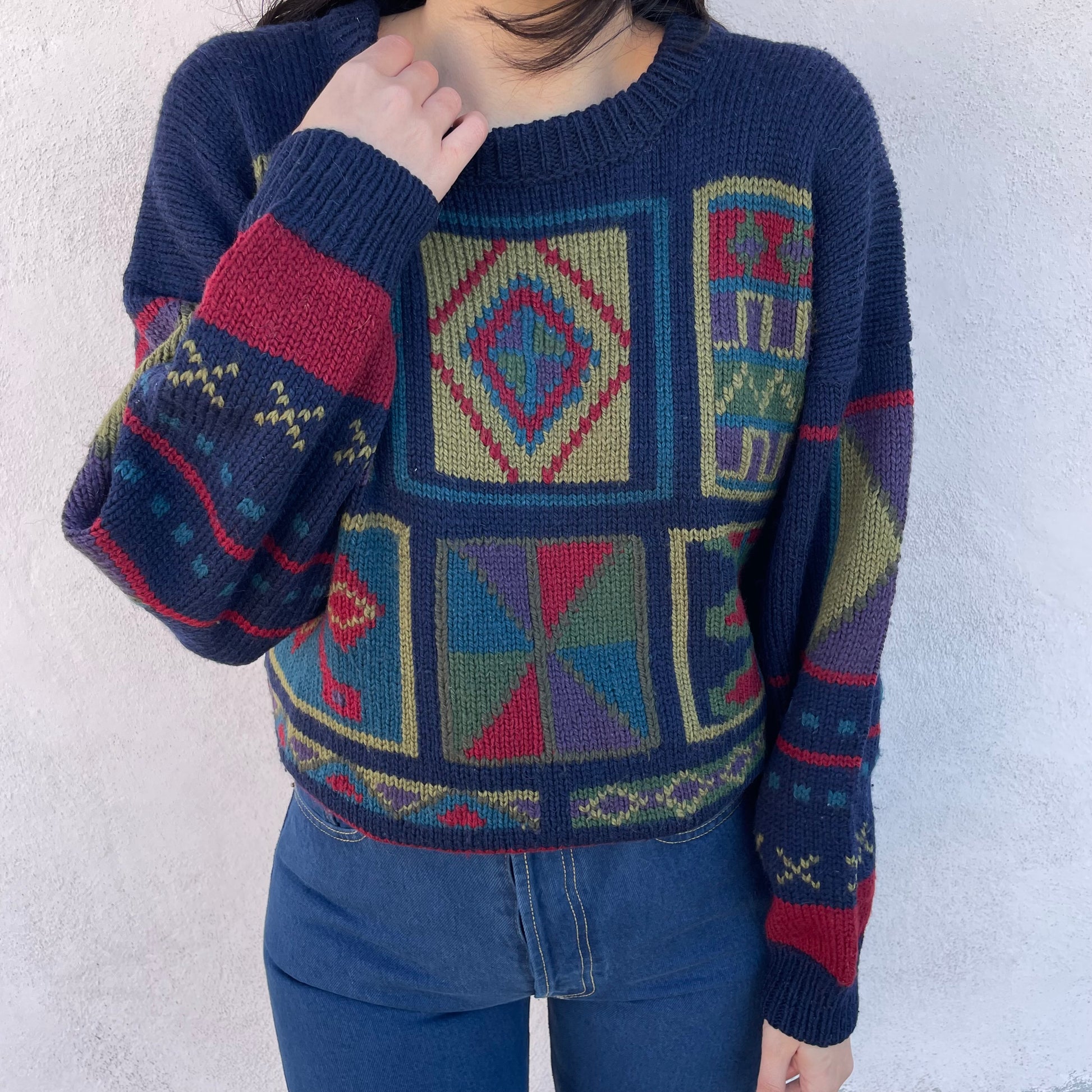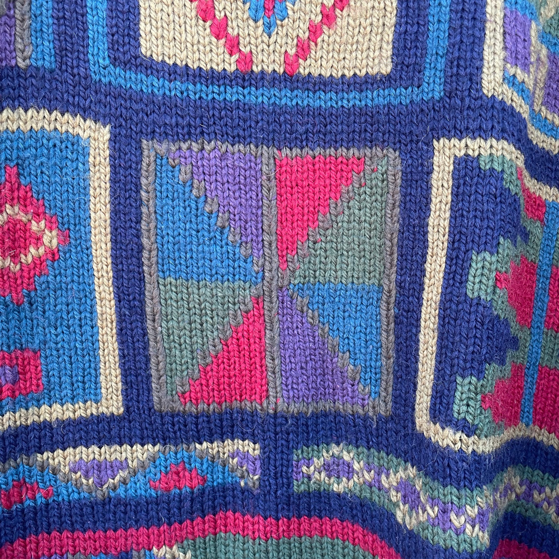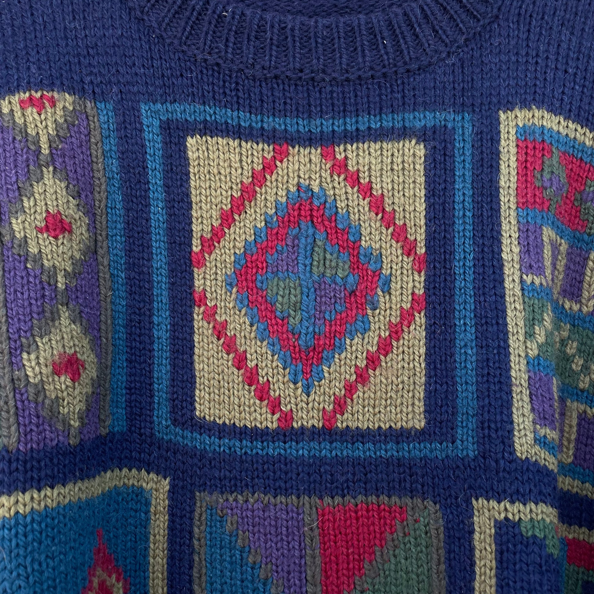 Golf girocollo base blu con riquadri con fantasie geometriche. Manca il merceologico ma è lana (spessa).