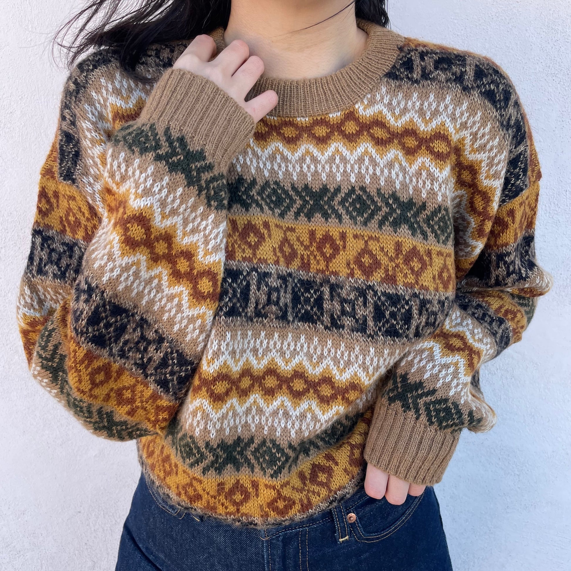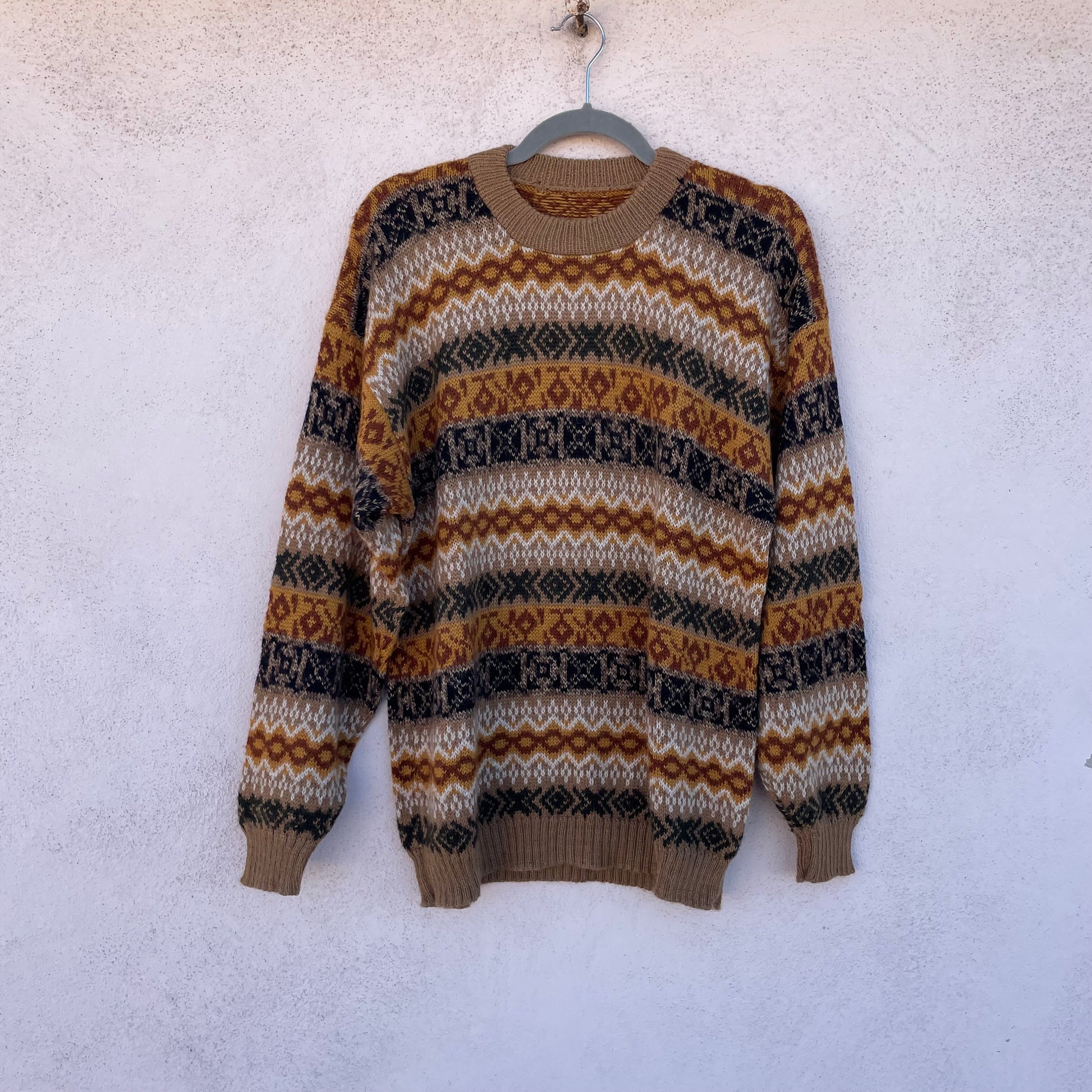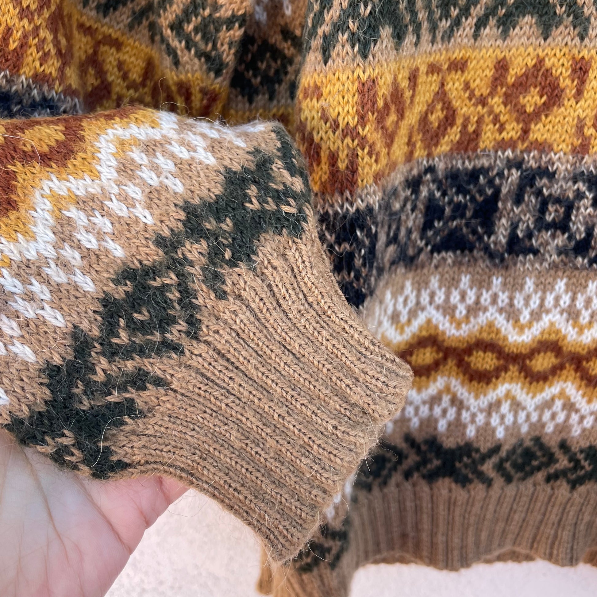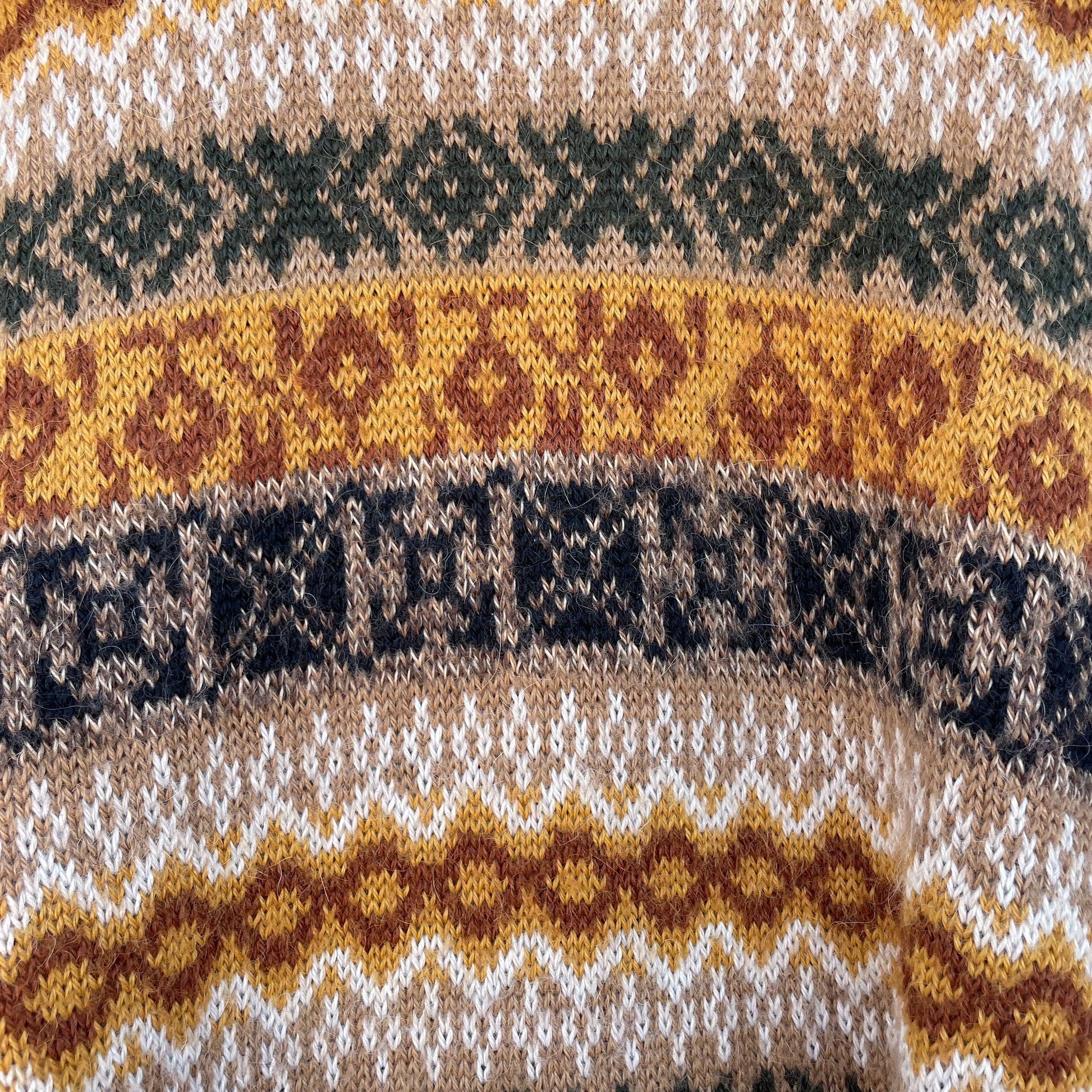 Golf girocollo base senape a righe orizzontali con fantasie. Manca il merceologico ma sicuramente è un misto mohair.