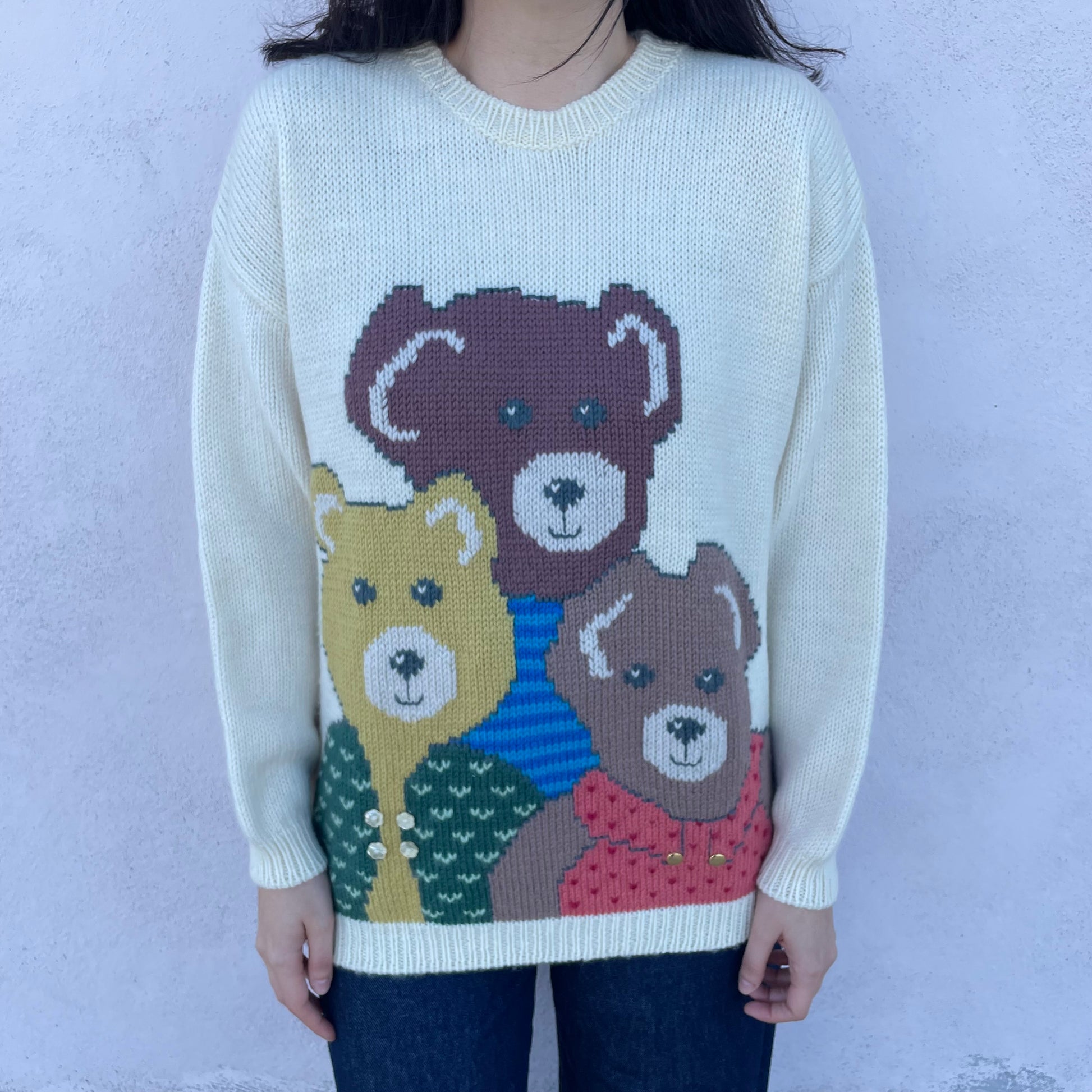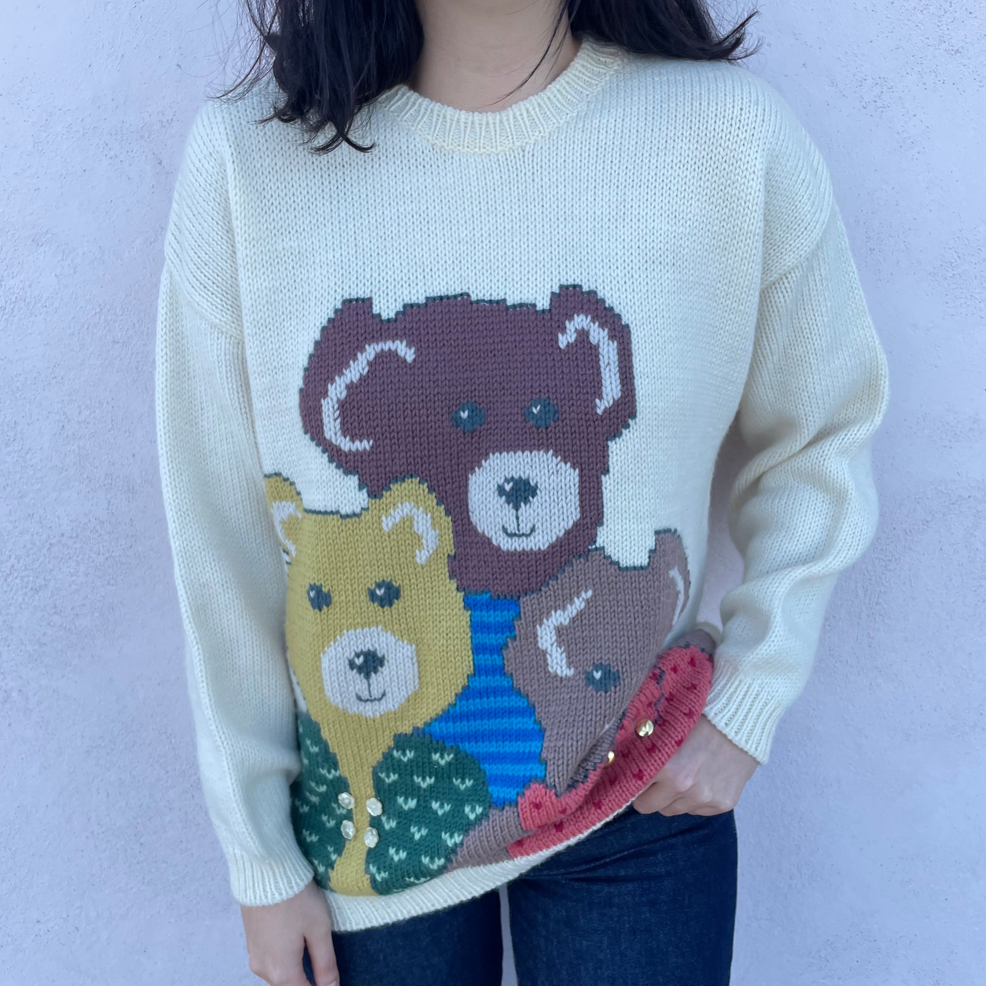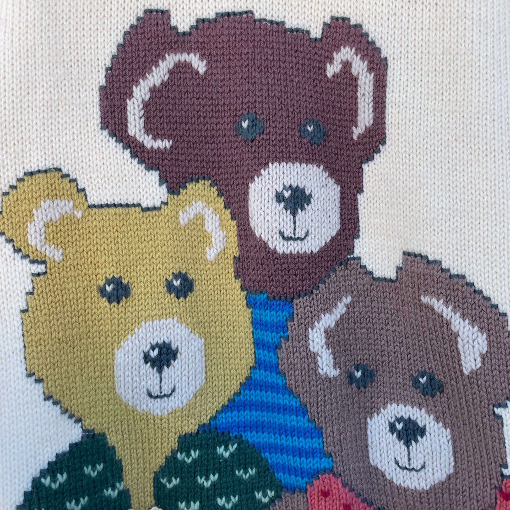 Golf girocollo 100% lana con tre orsacchiotti. I maglioni degli orsacchiotti sono rifiniti con bottoni.