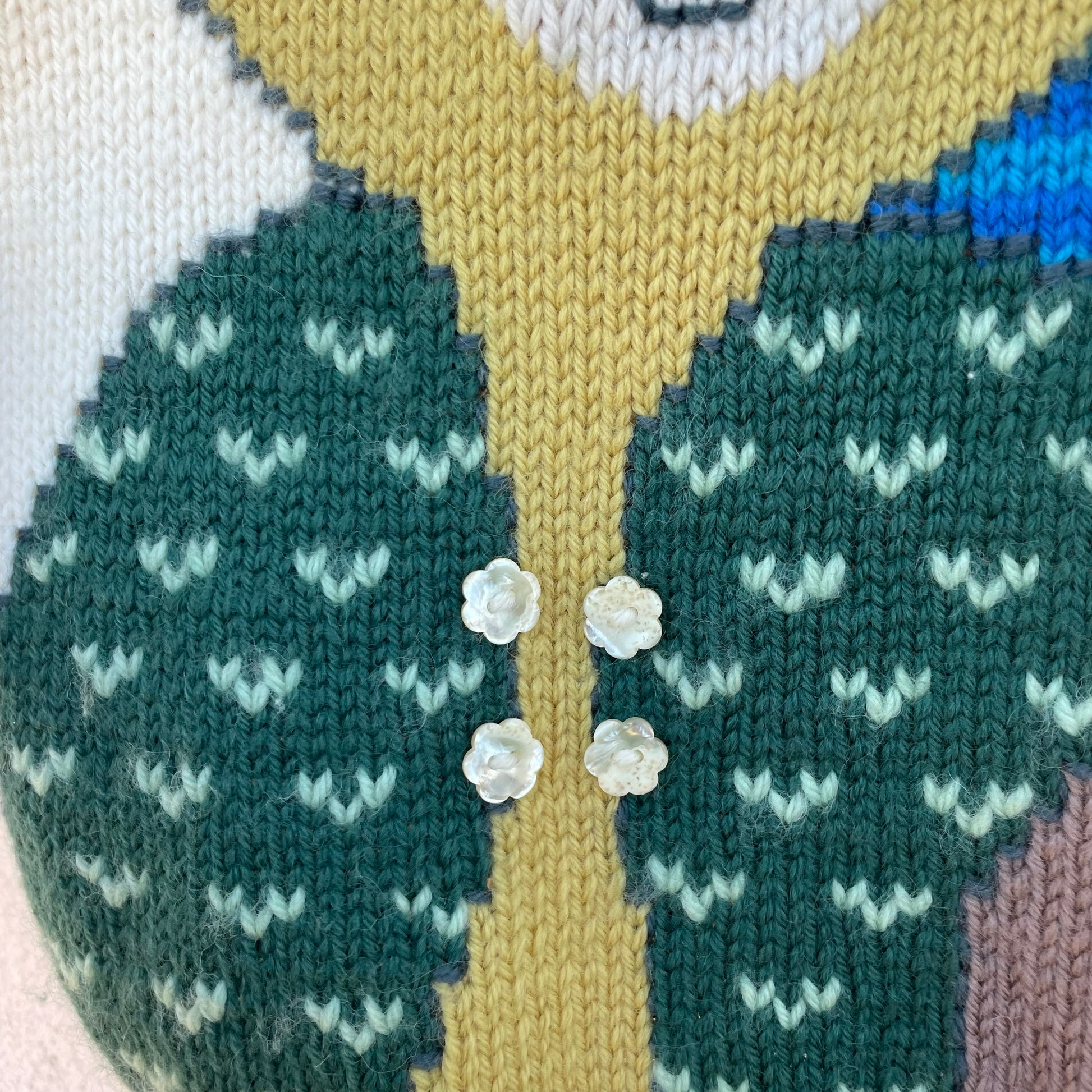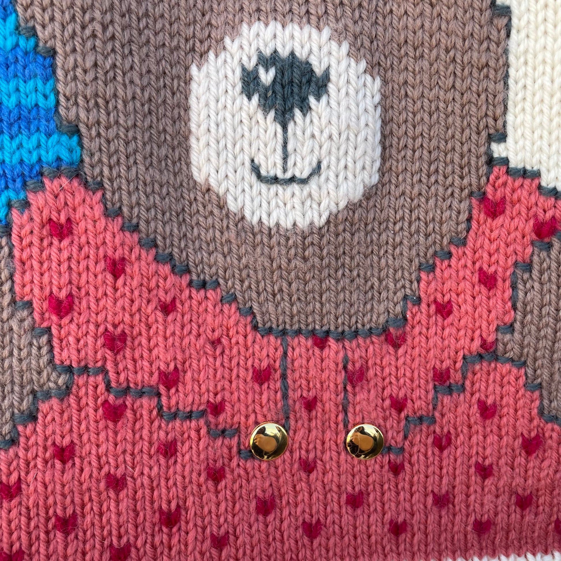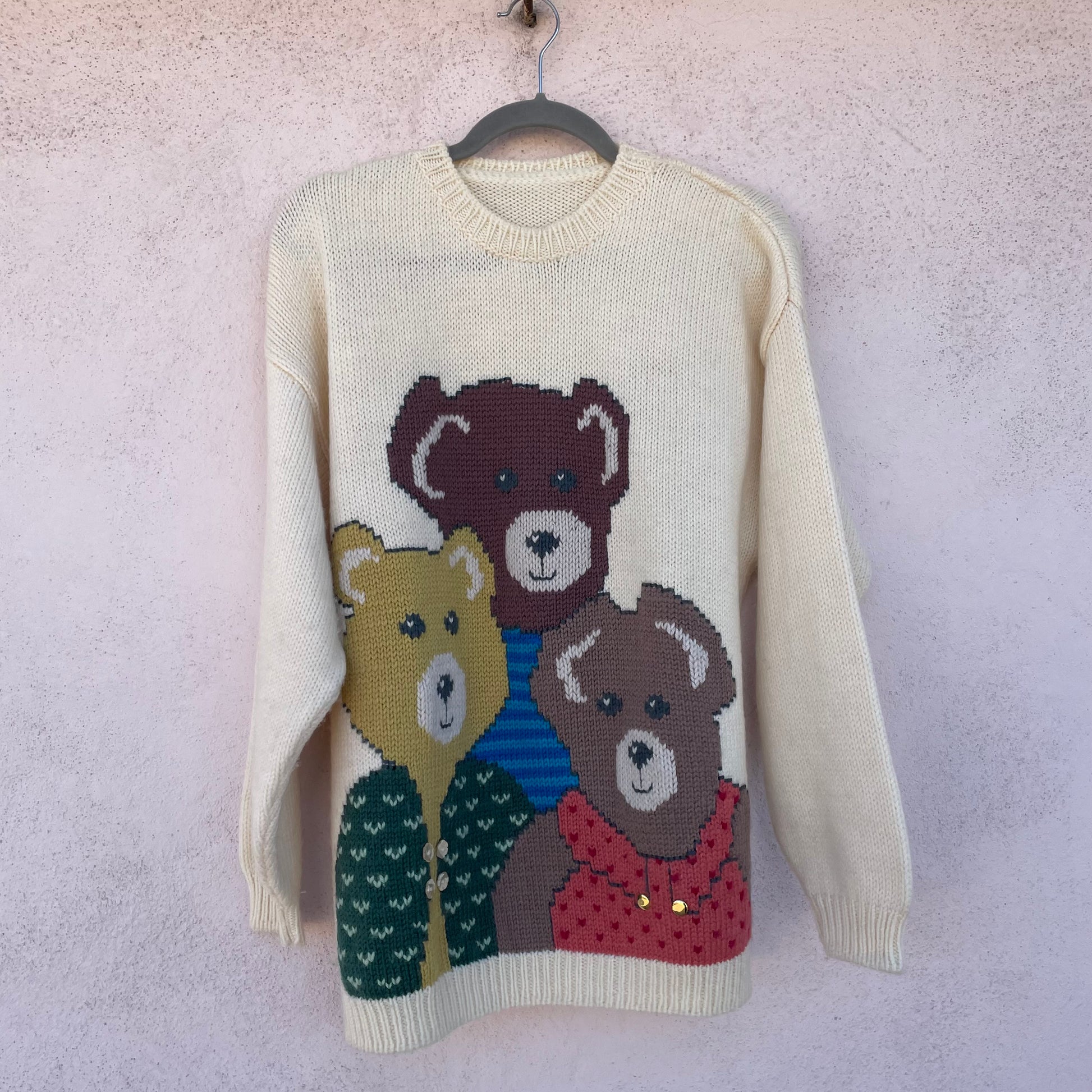 Golf girocollo 100% lana con tre orsacchiotti. I maglioni degli orsacchiotti sono rifiniti con bottoni.