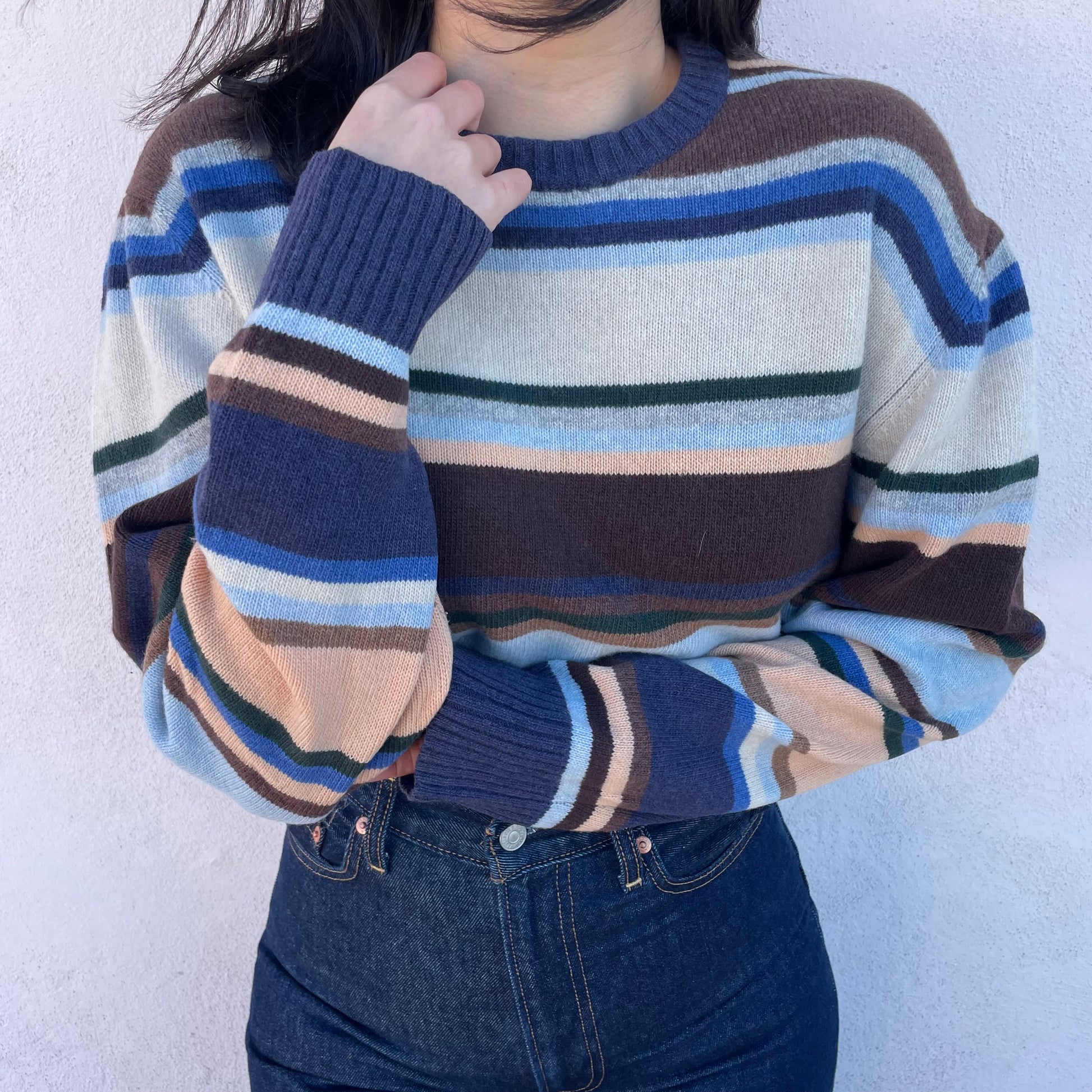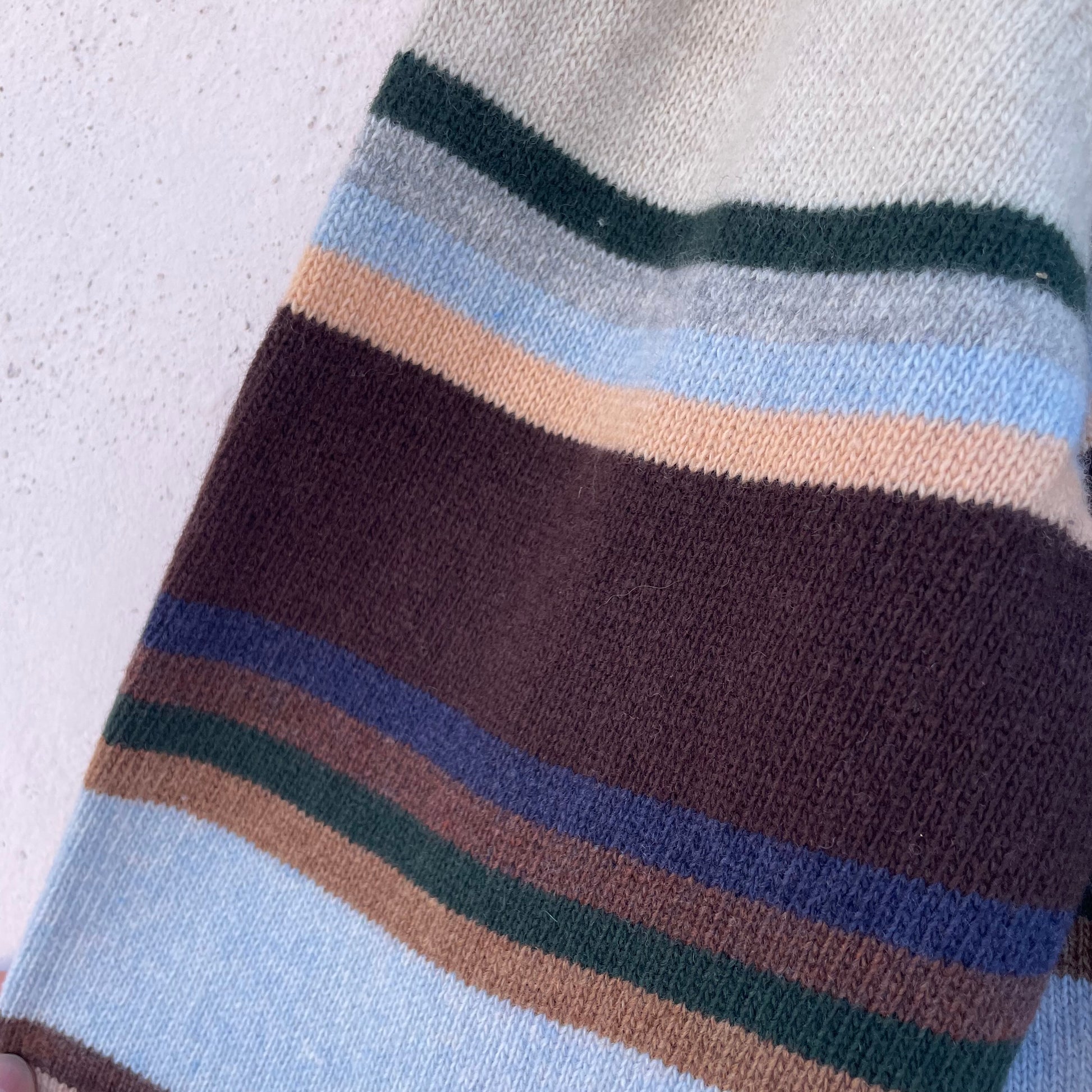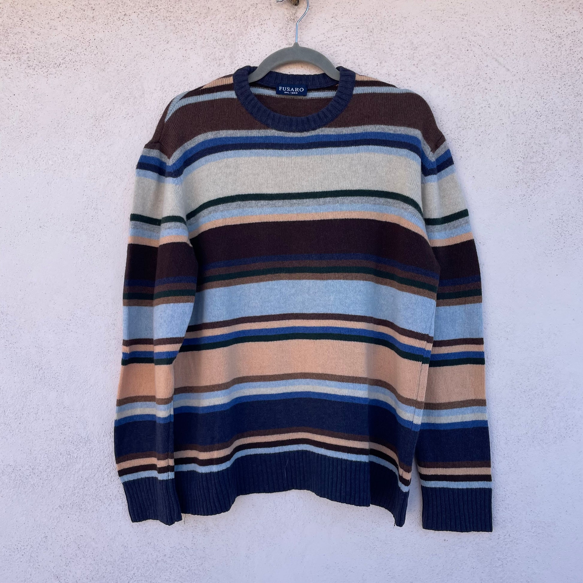 Golf in pura lana vergine a righe colorate blu, marroni, pesca.