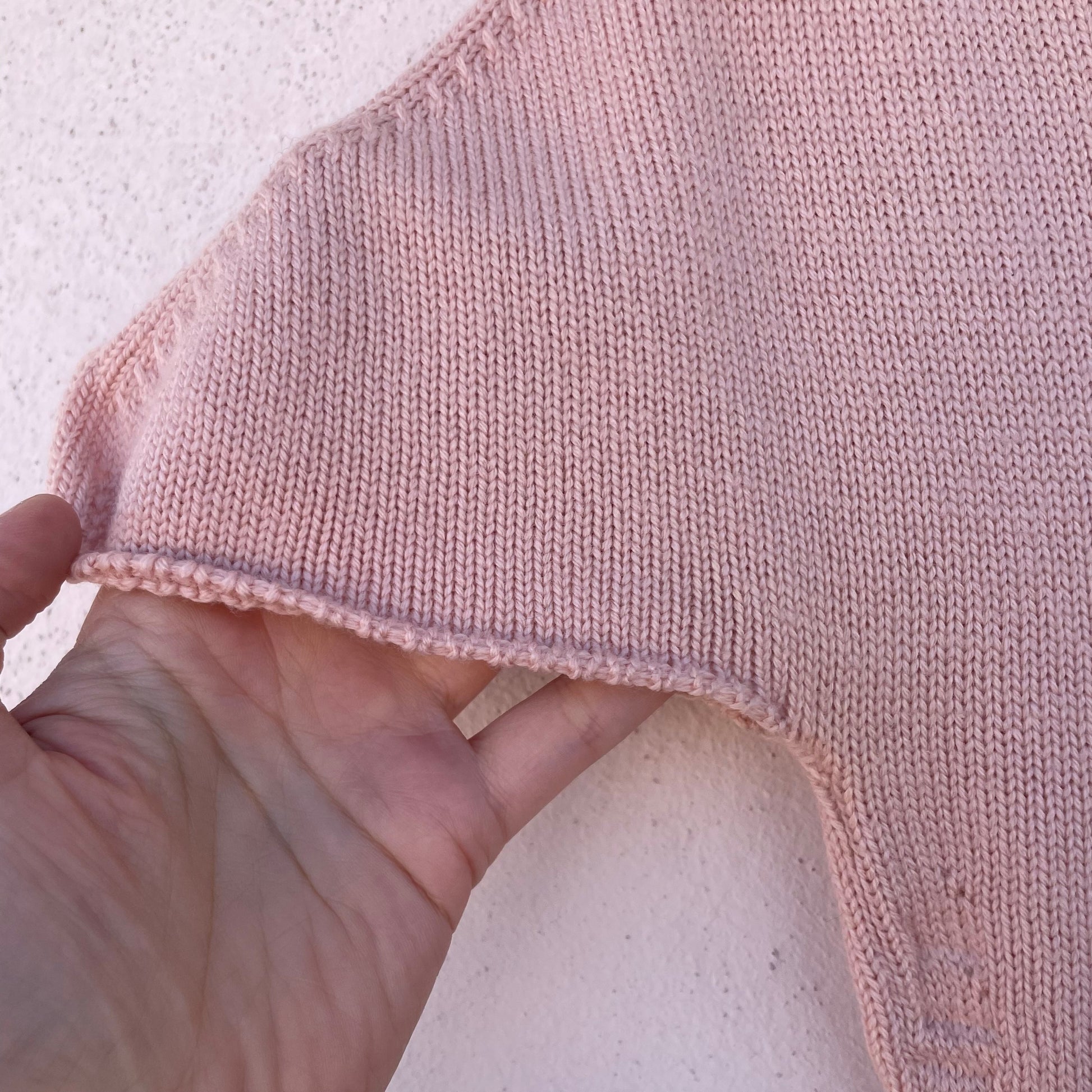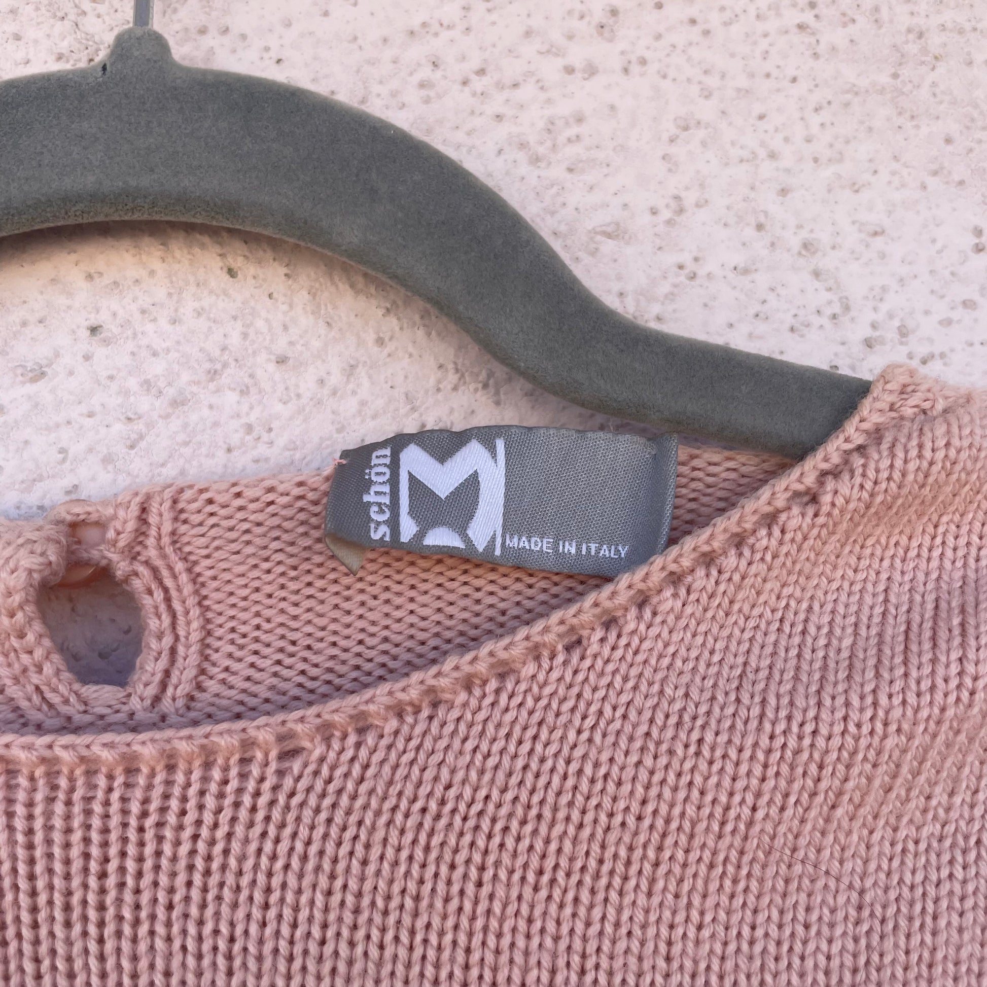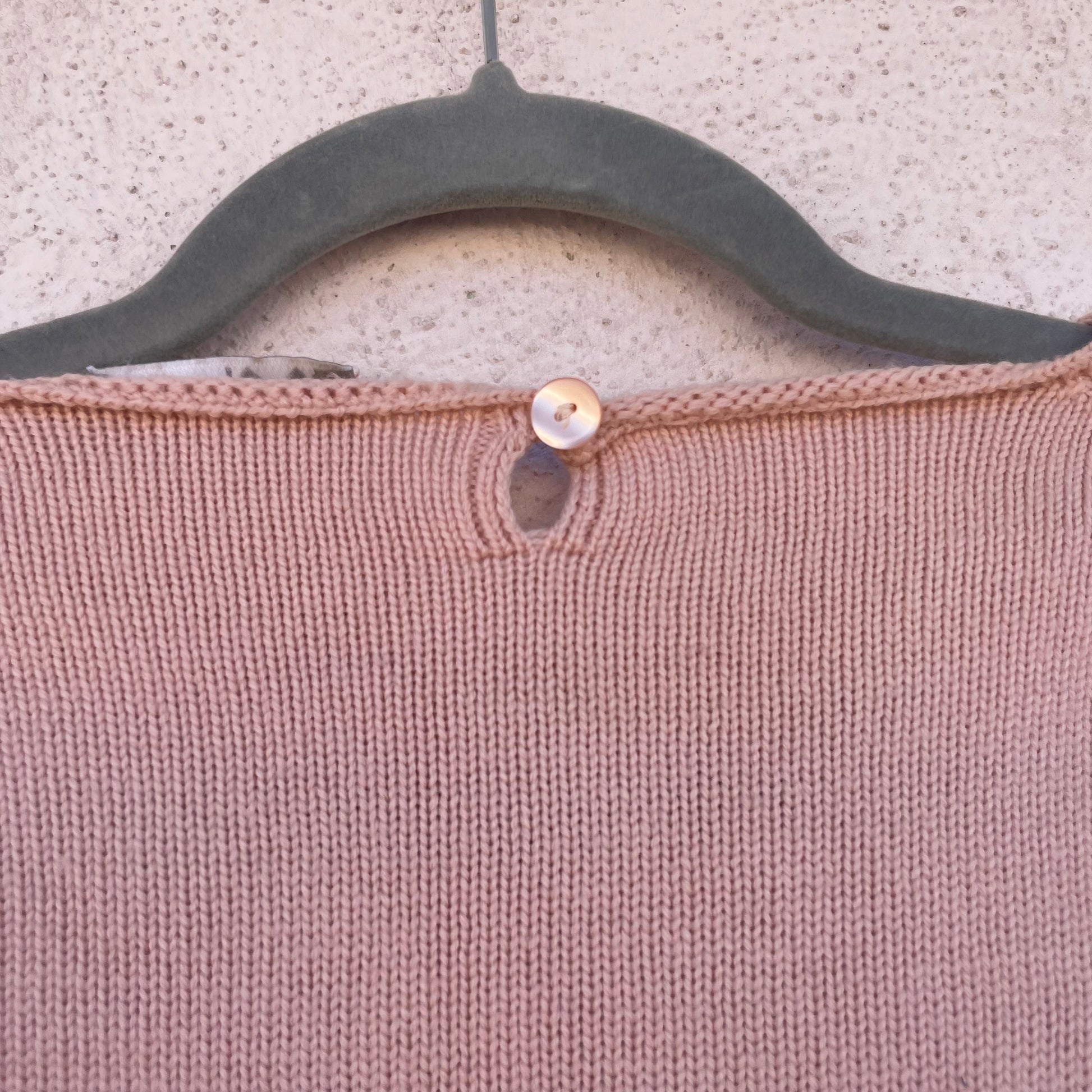 Golfino rosa Mila Schön 100% lana. Mezza manica tipo a kimono (svasata), scollo dritto accollato (tipo barchetta stretto). Bottoncino sul collo. Logo ricamato.