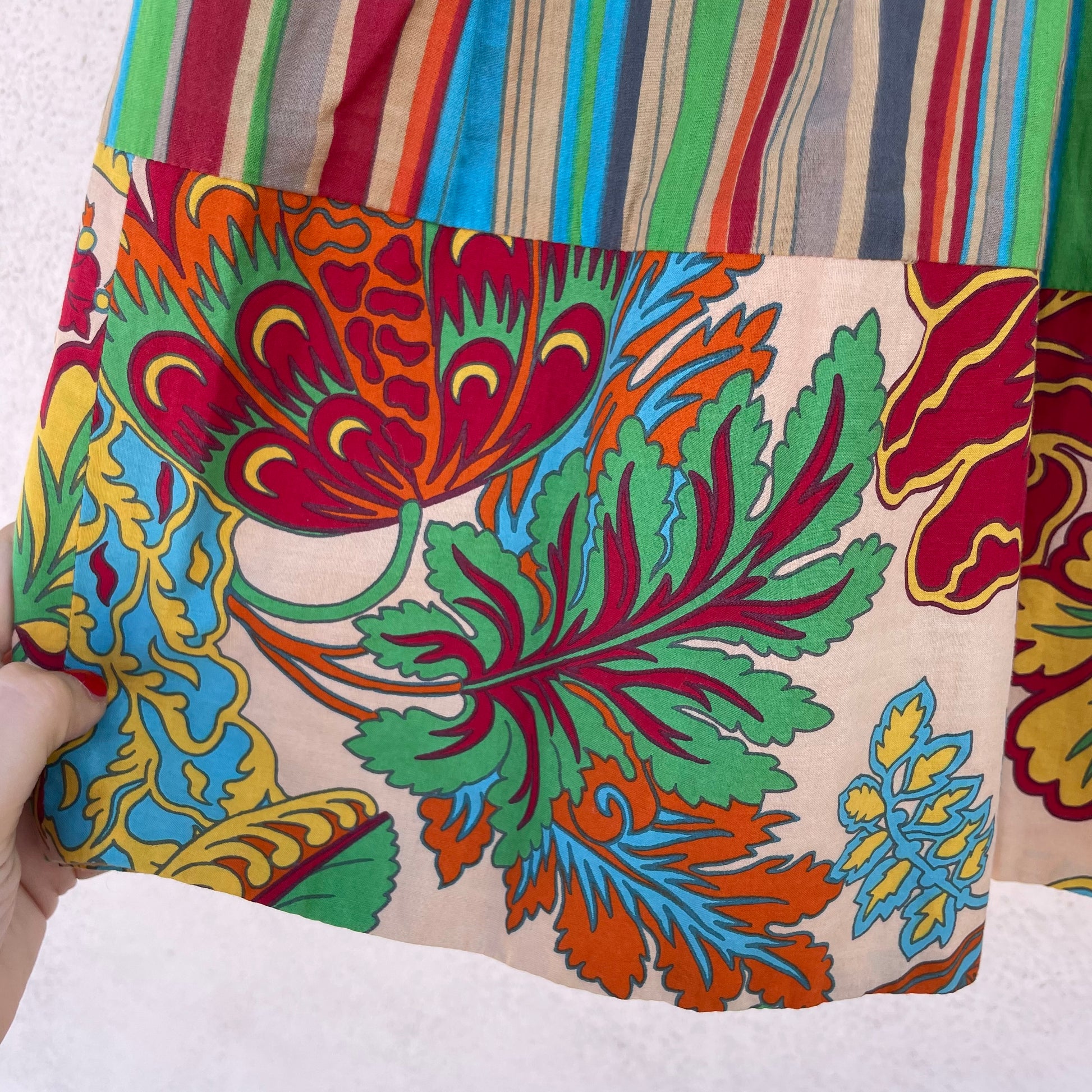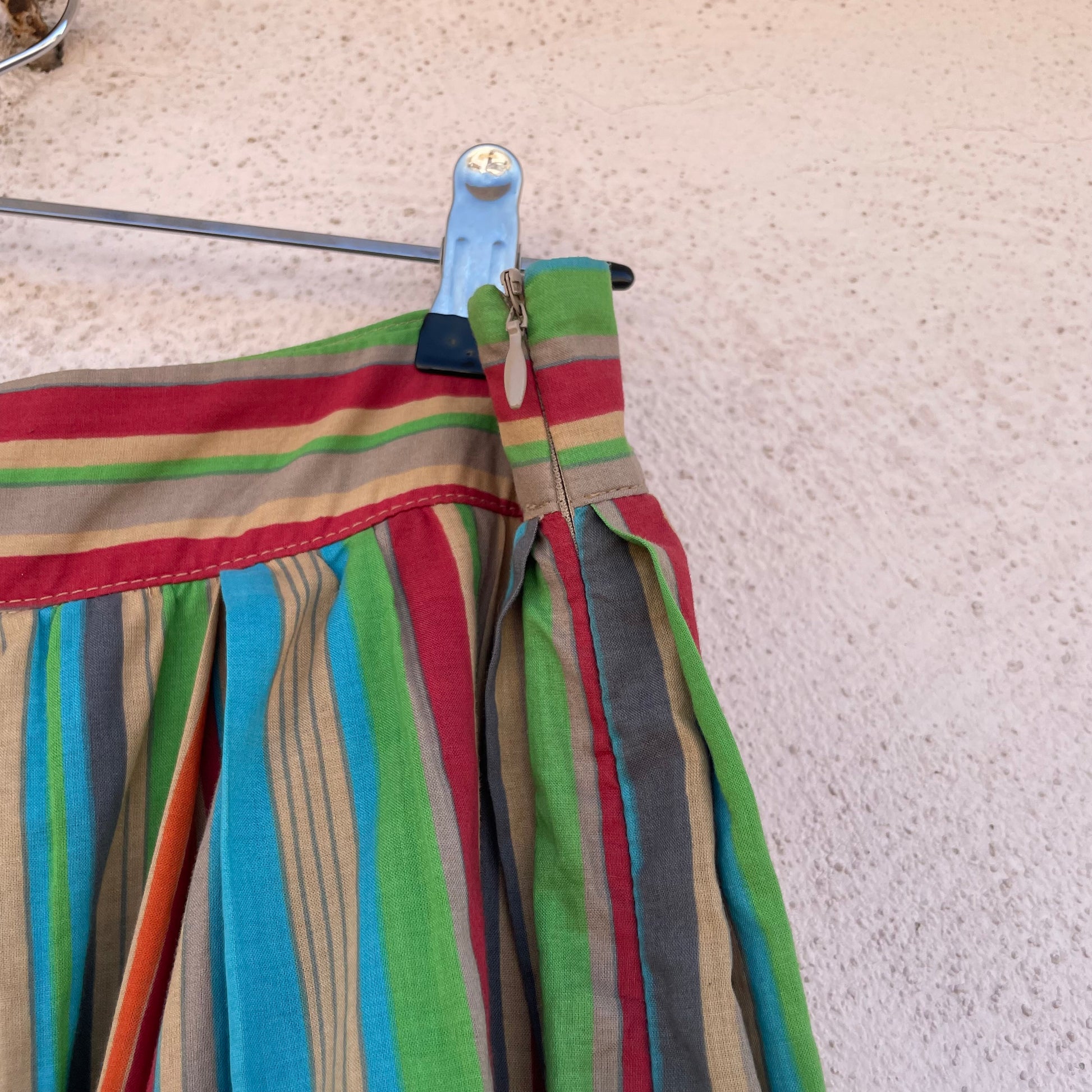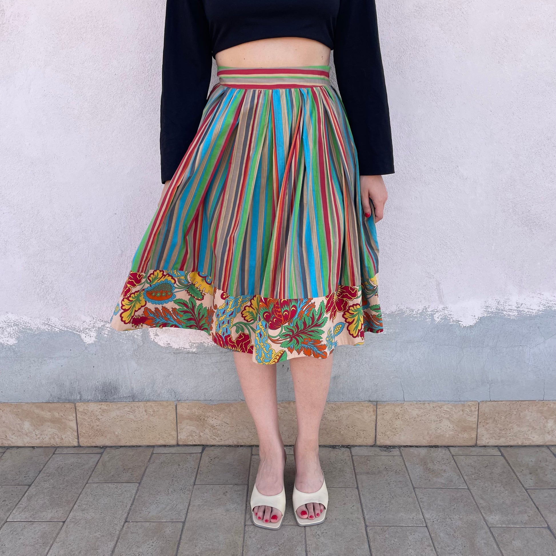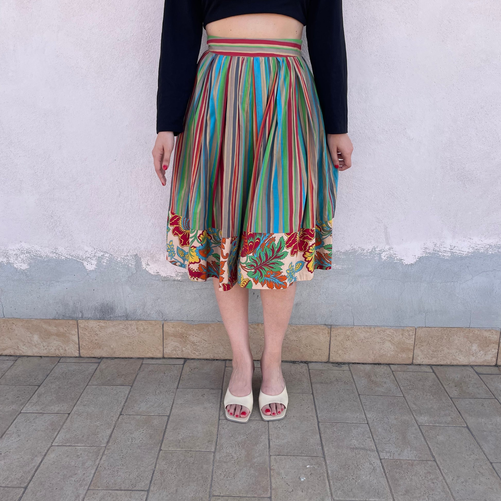 Gonna midi 100% cotone con doppio pattern, righe verticali e fascia sul fondo foliage.