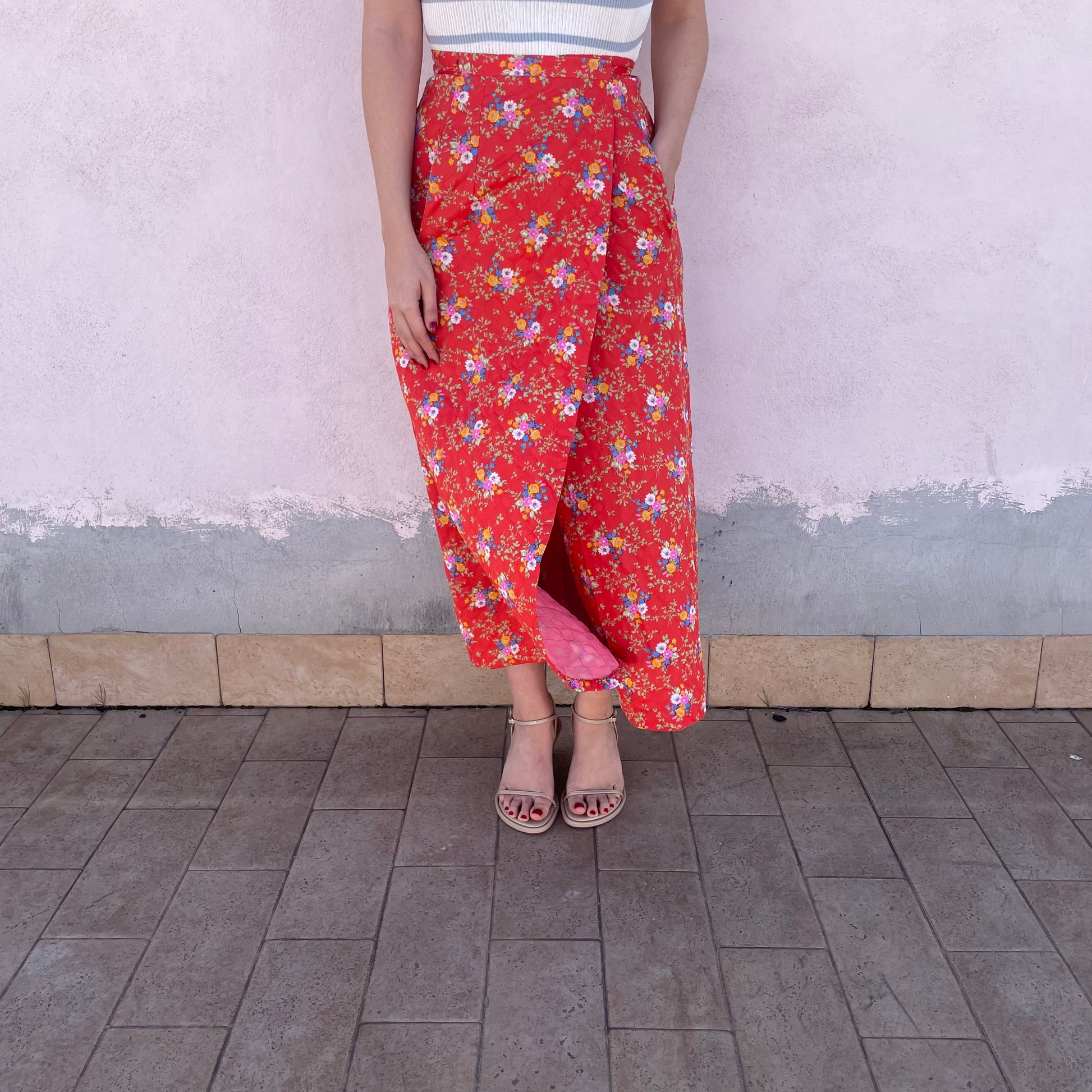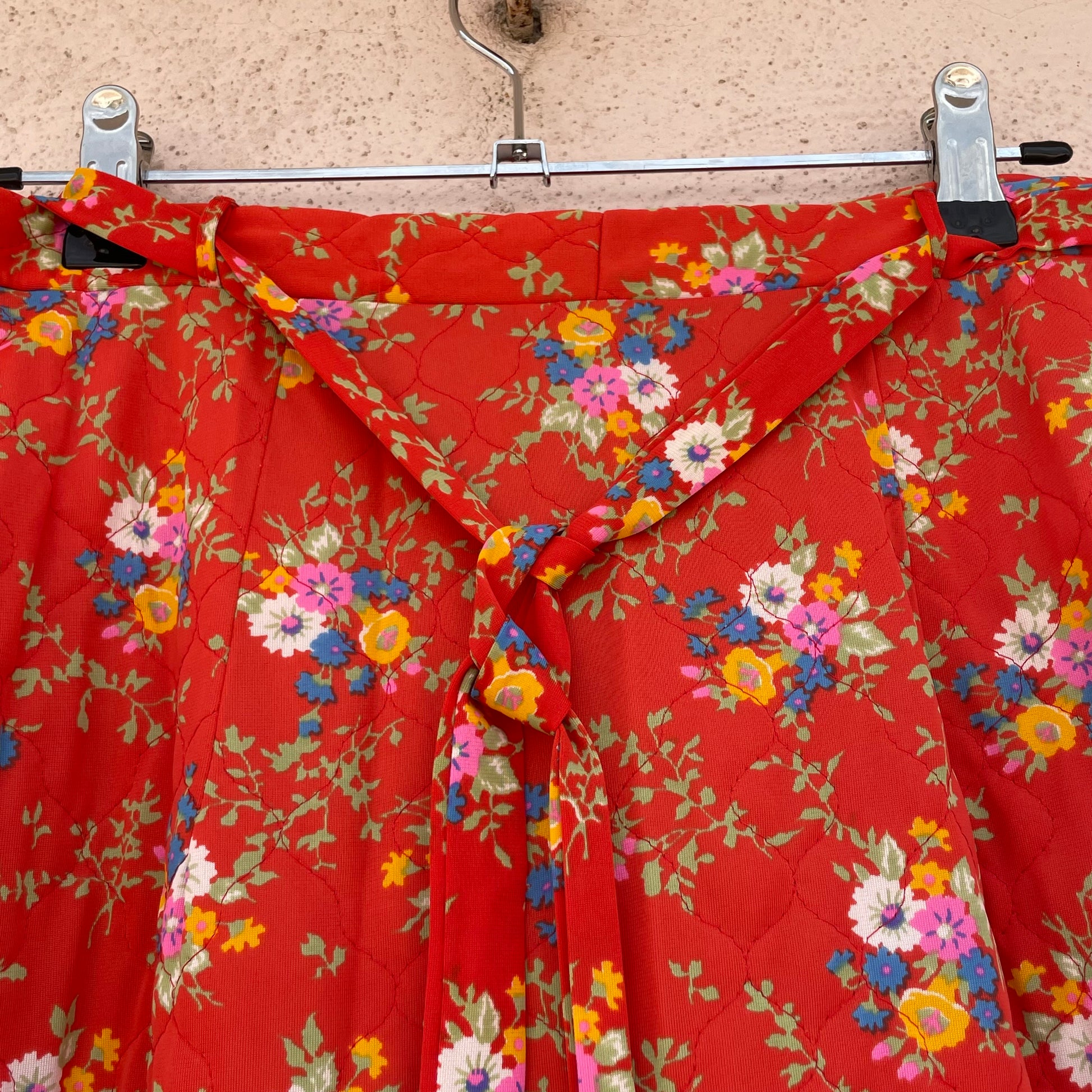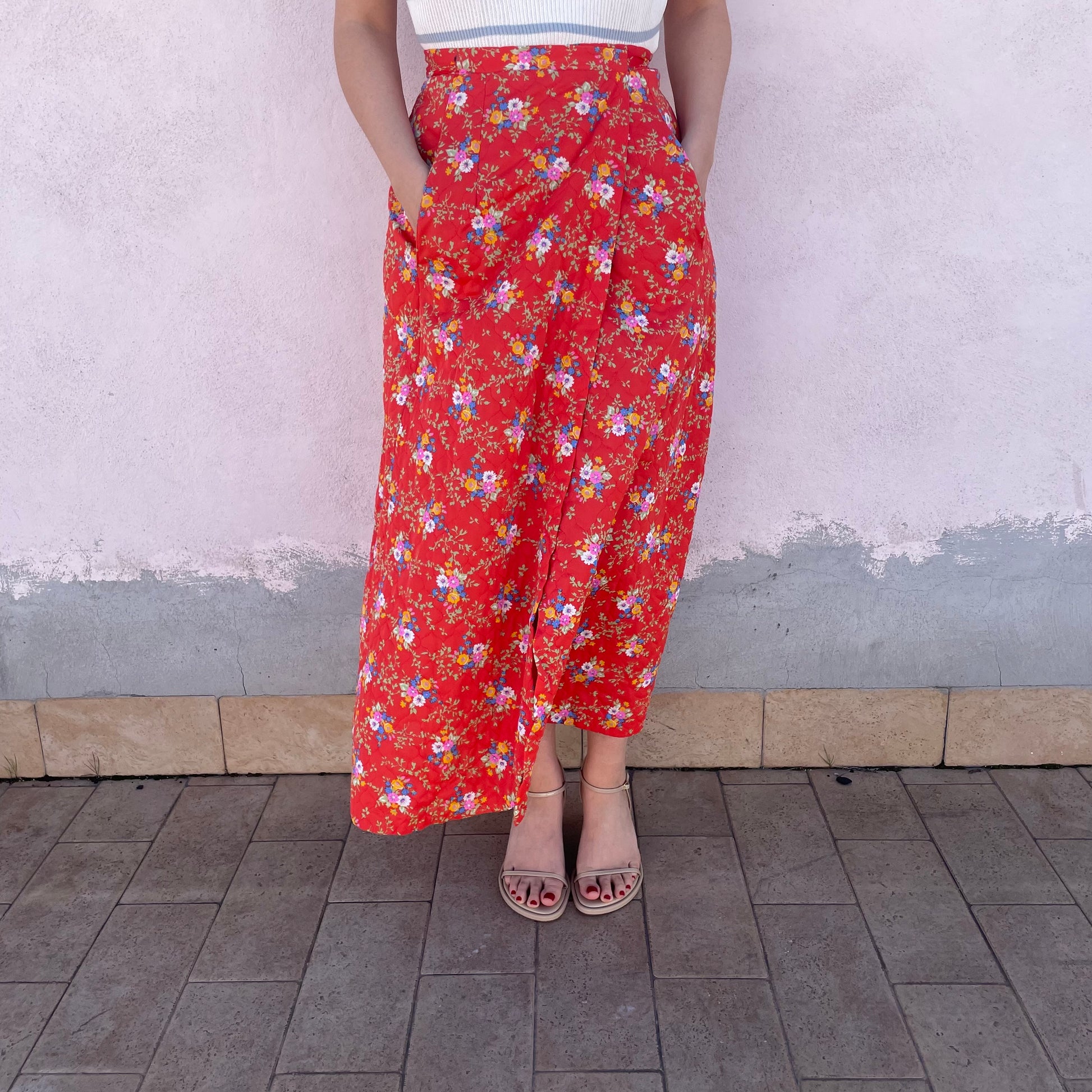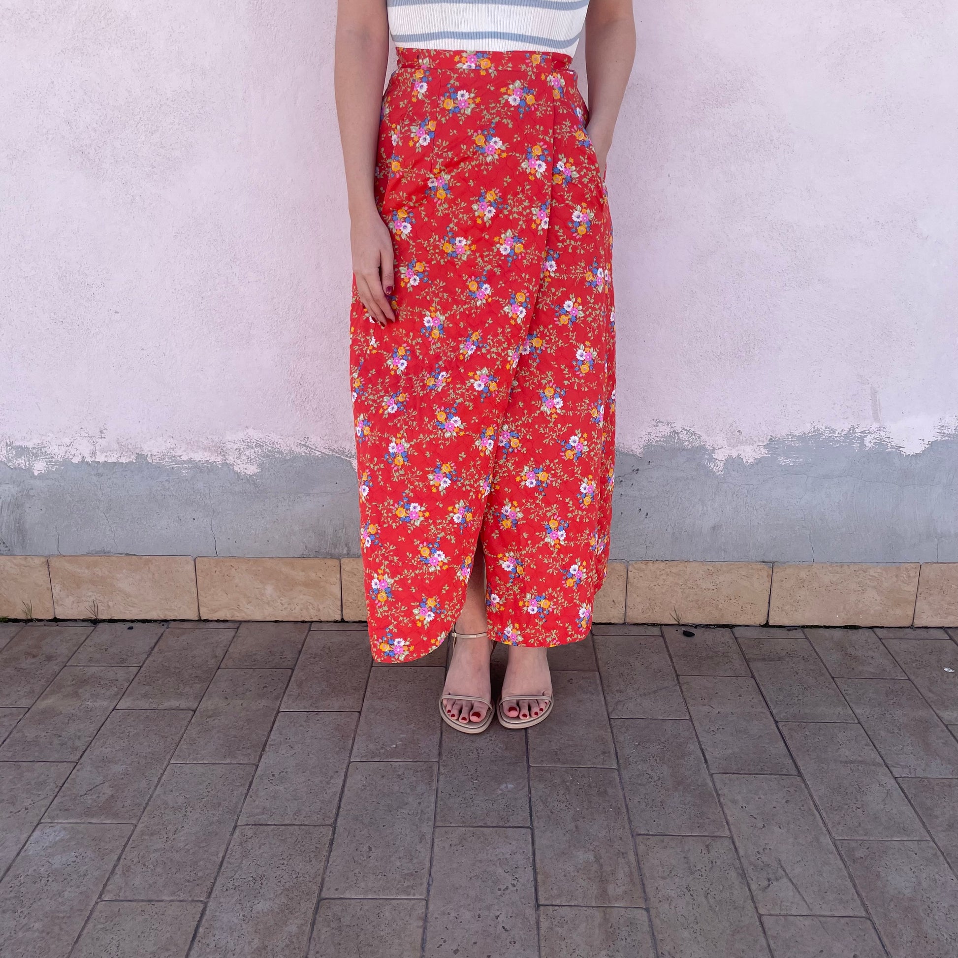 Gonna modello a portafoglio rossa con stampa di bouquet di fiori. Tessuto leggermente trapuntato (non immaginatevi un piumino, è leggera).