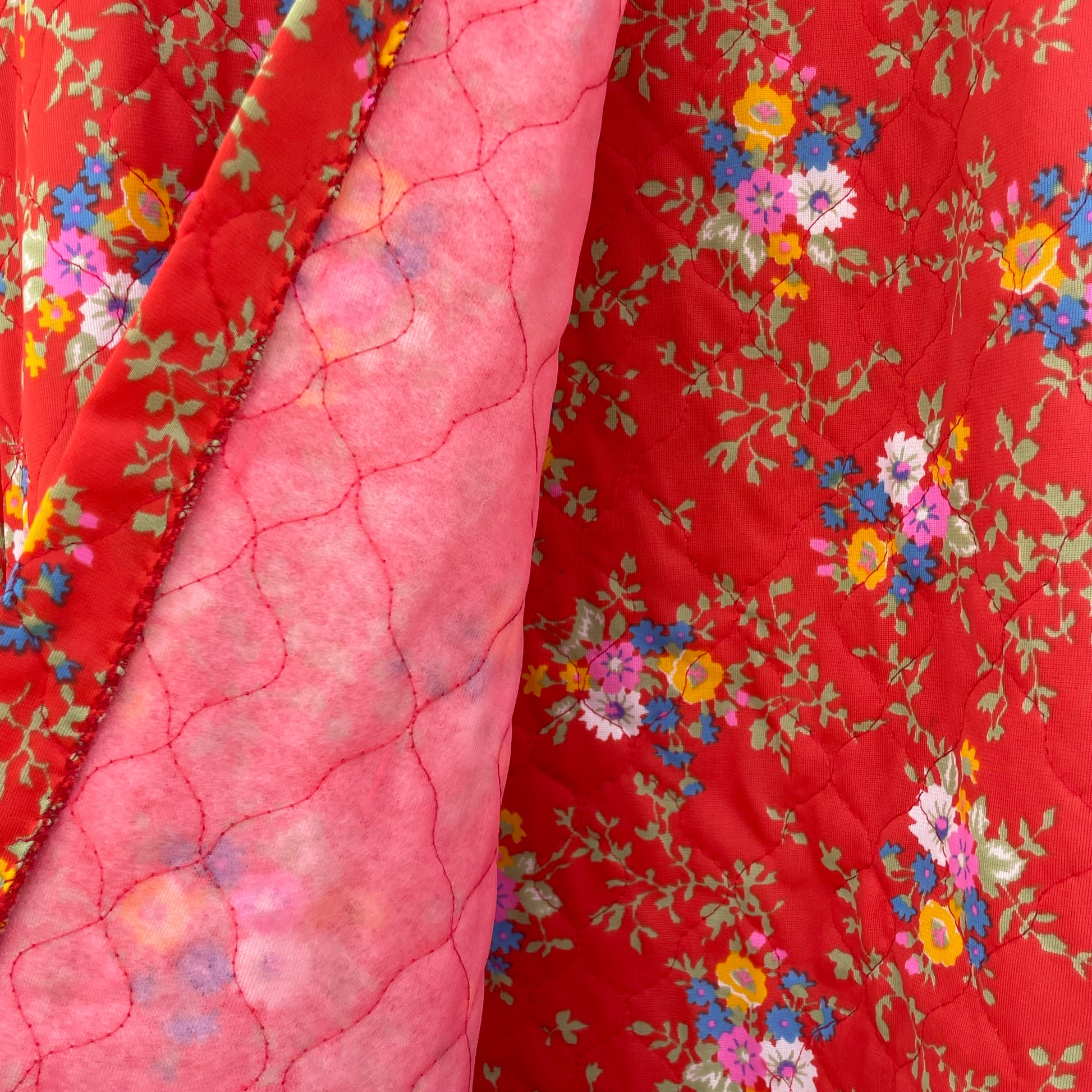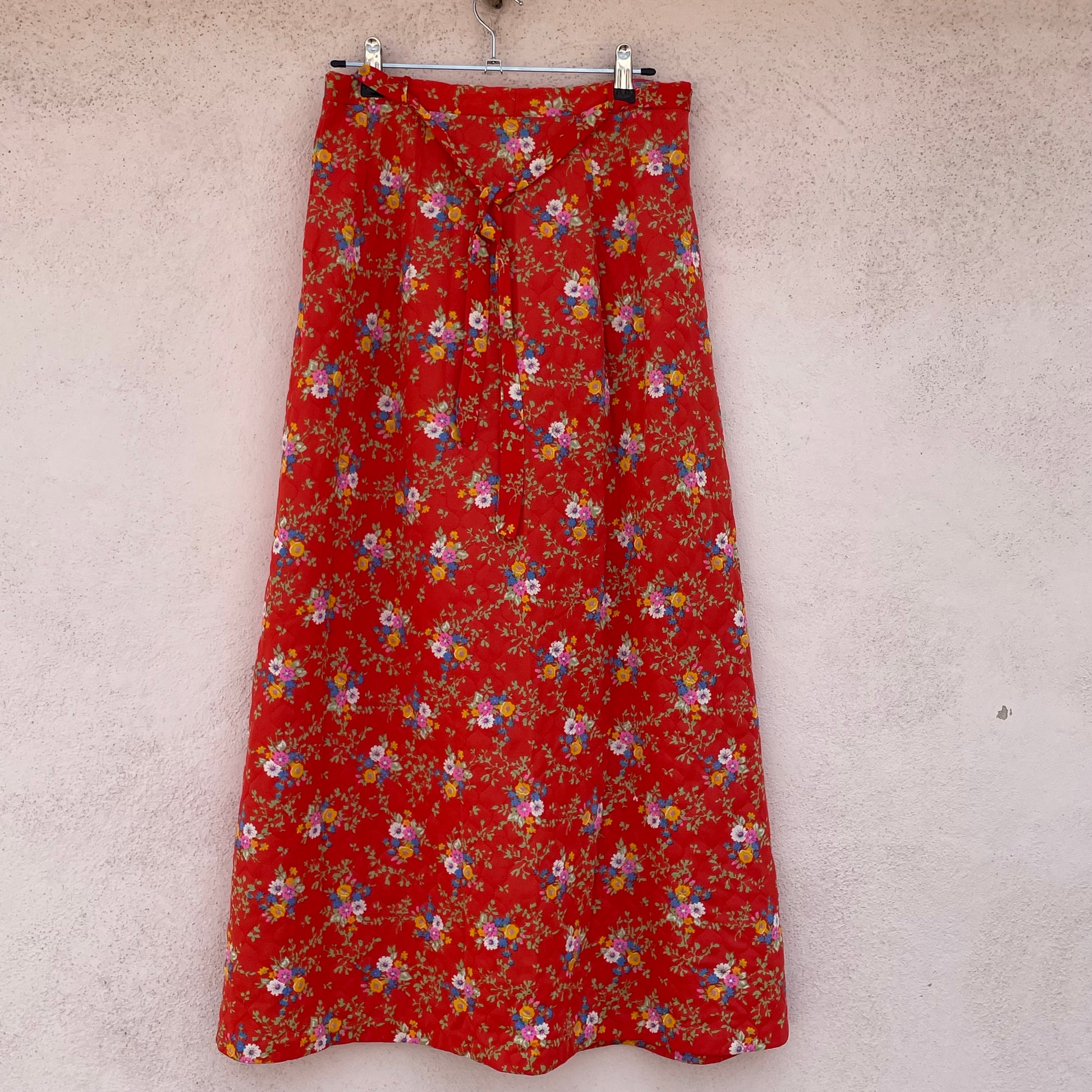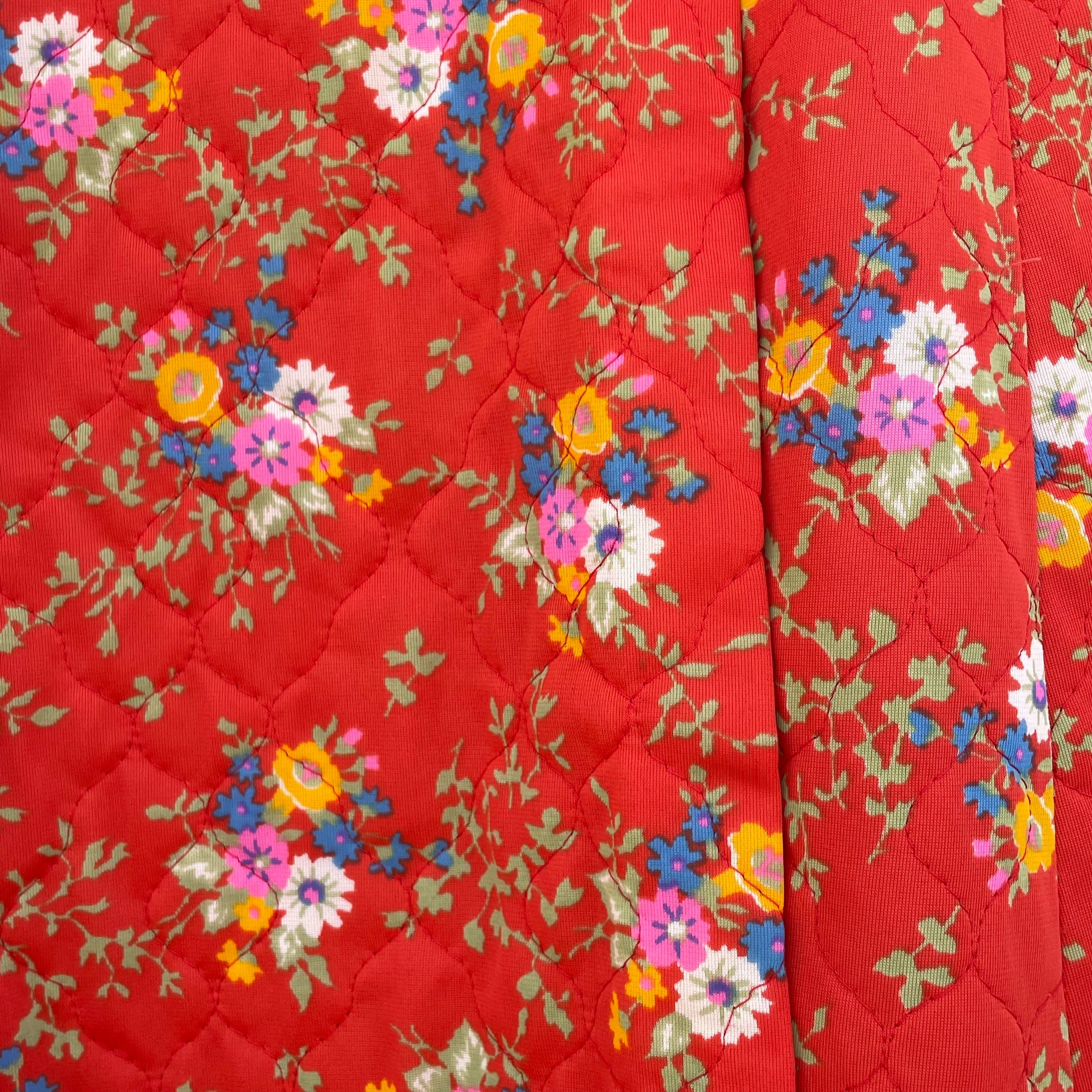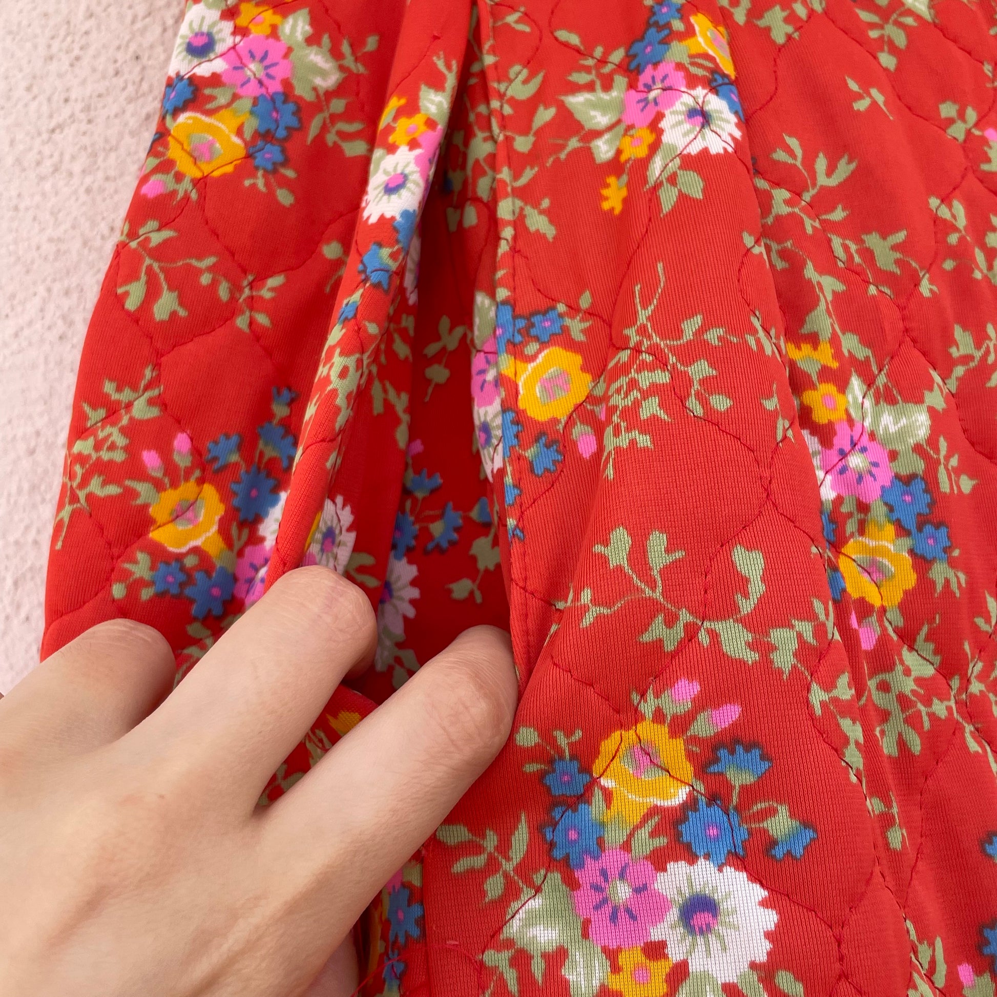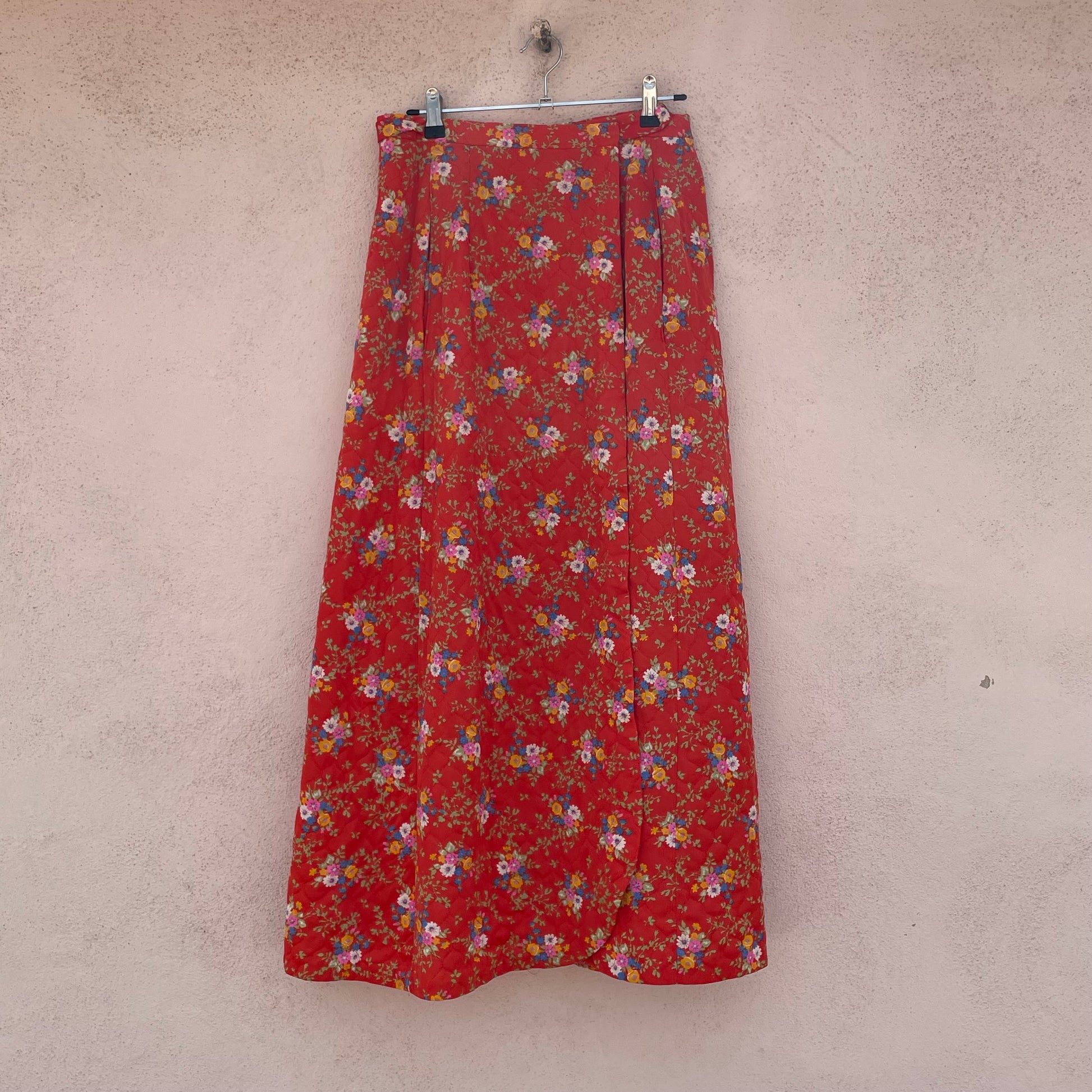 Gonna modello a portafoglio rossa con stampa di bouquet di fiori. Tessuto leggermente trapuntato (non immaginatevi un piumino, è leggera).