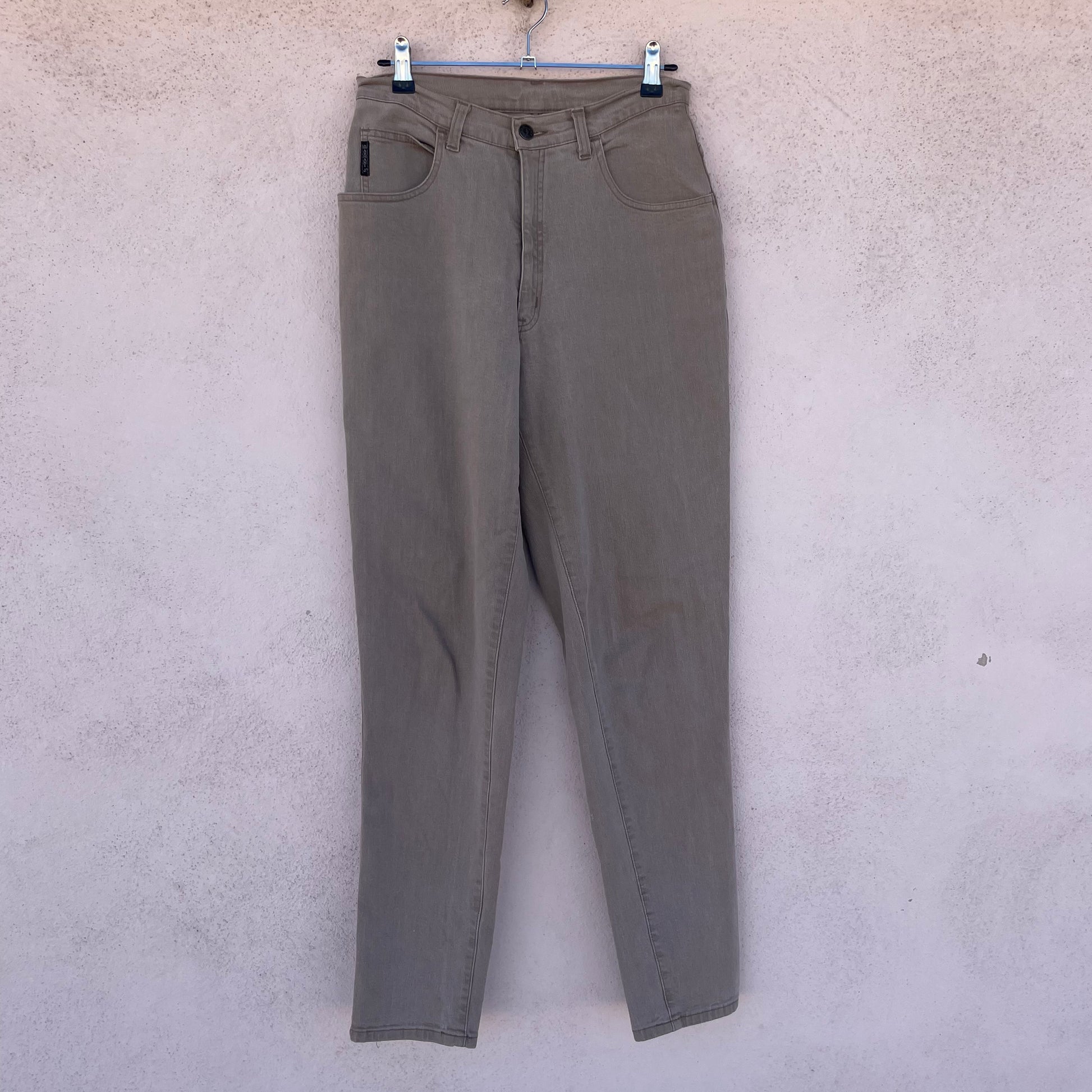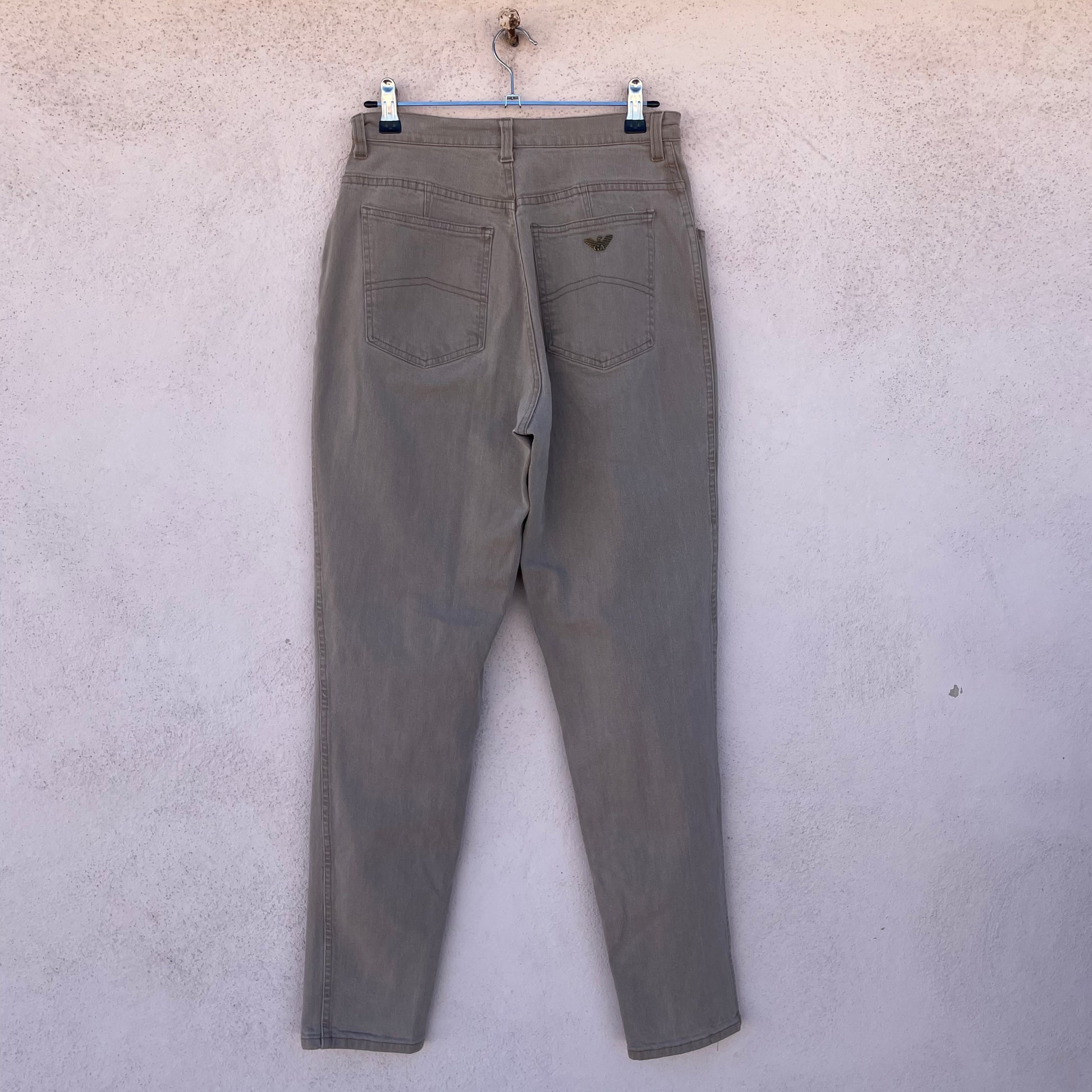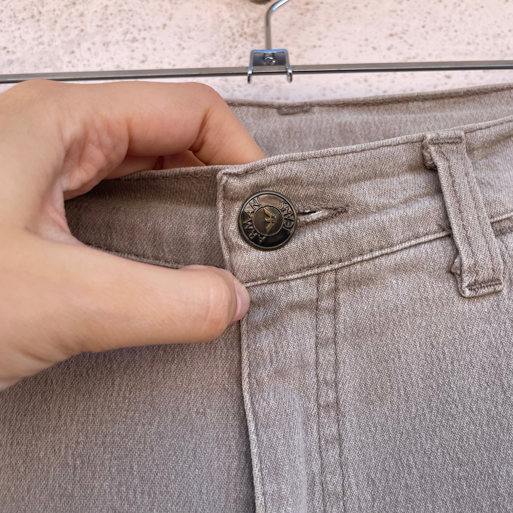 Jeans greige Armani. Vita alta. Il merceologico è illeggibile ma immagino ci sia una piccola percentuale di elastan (generalmente 1-2%).