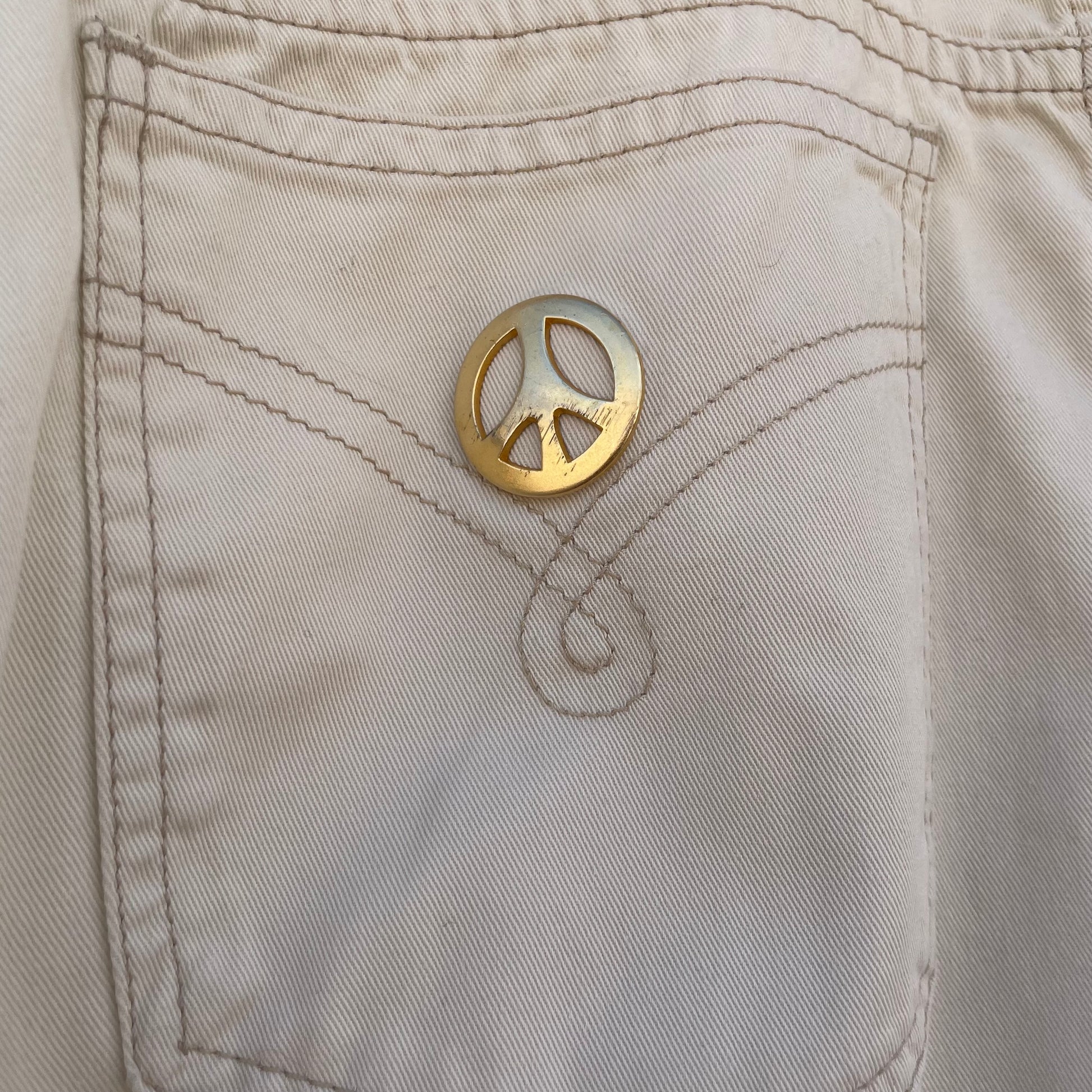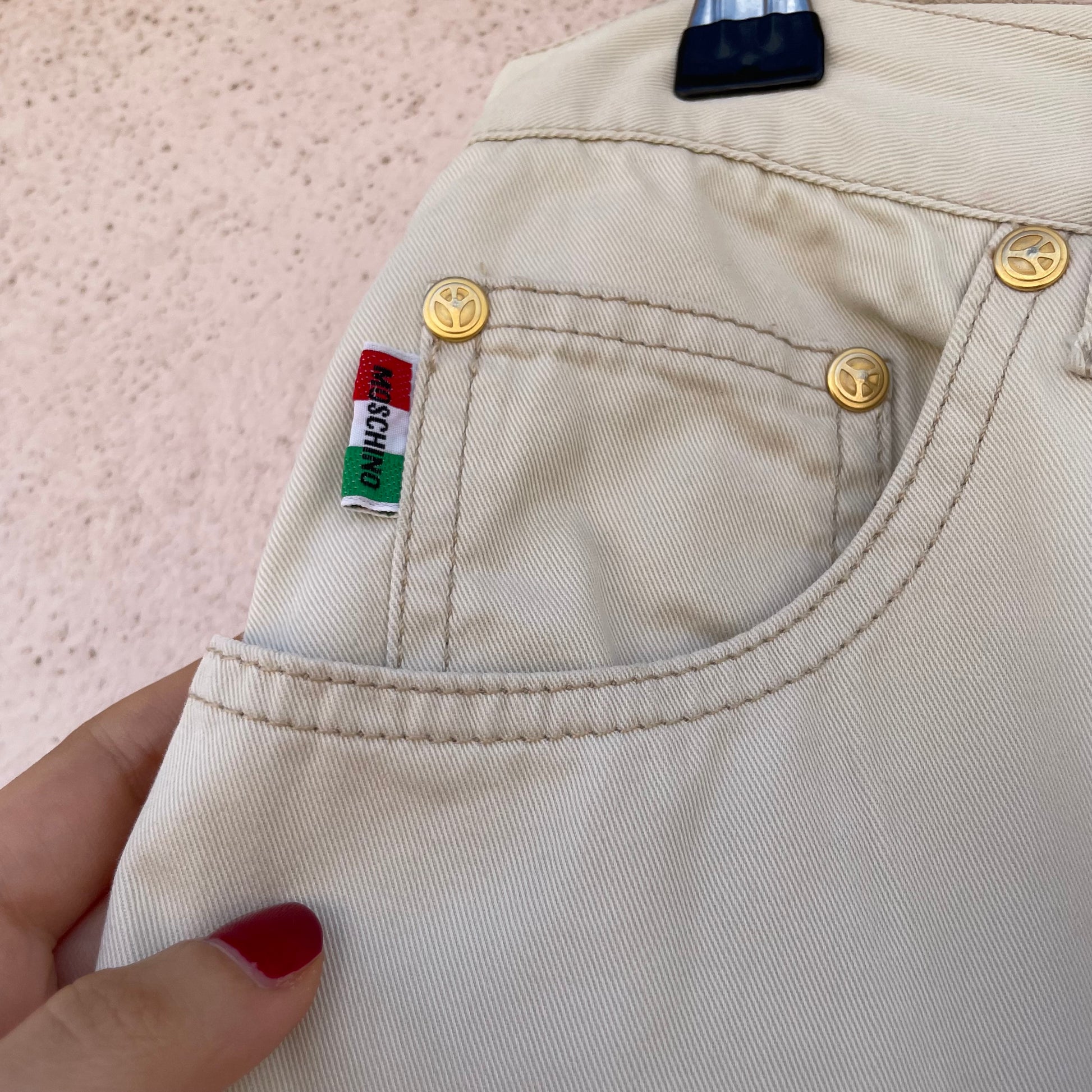 Pantaloni Moschino modello jeans cinque tasche. 100% cotone (tela più leggera del denim). Simbolo della pace dorato sulla tasca (leggermente graffiato).
