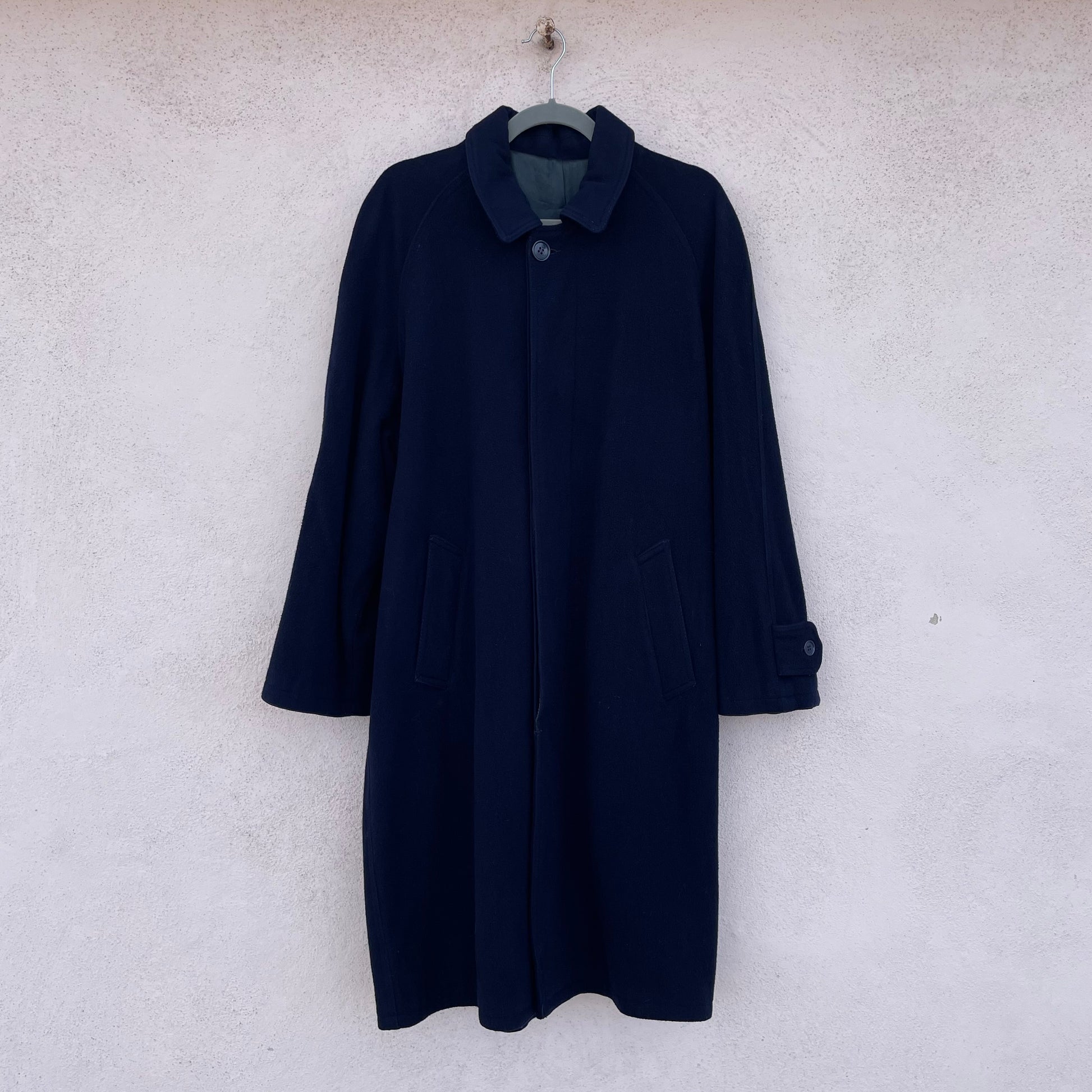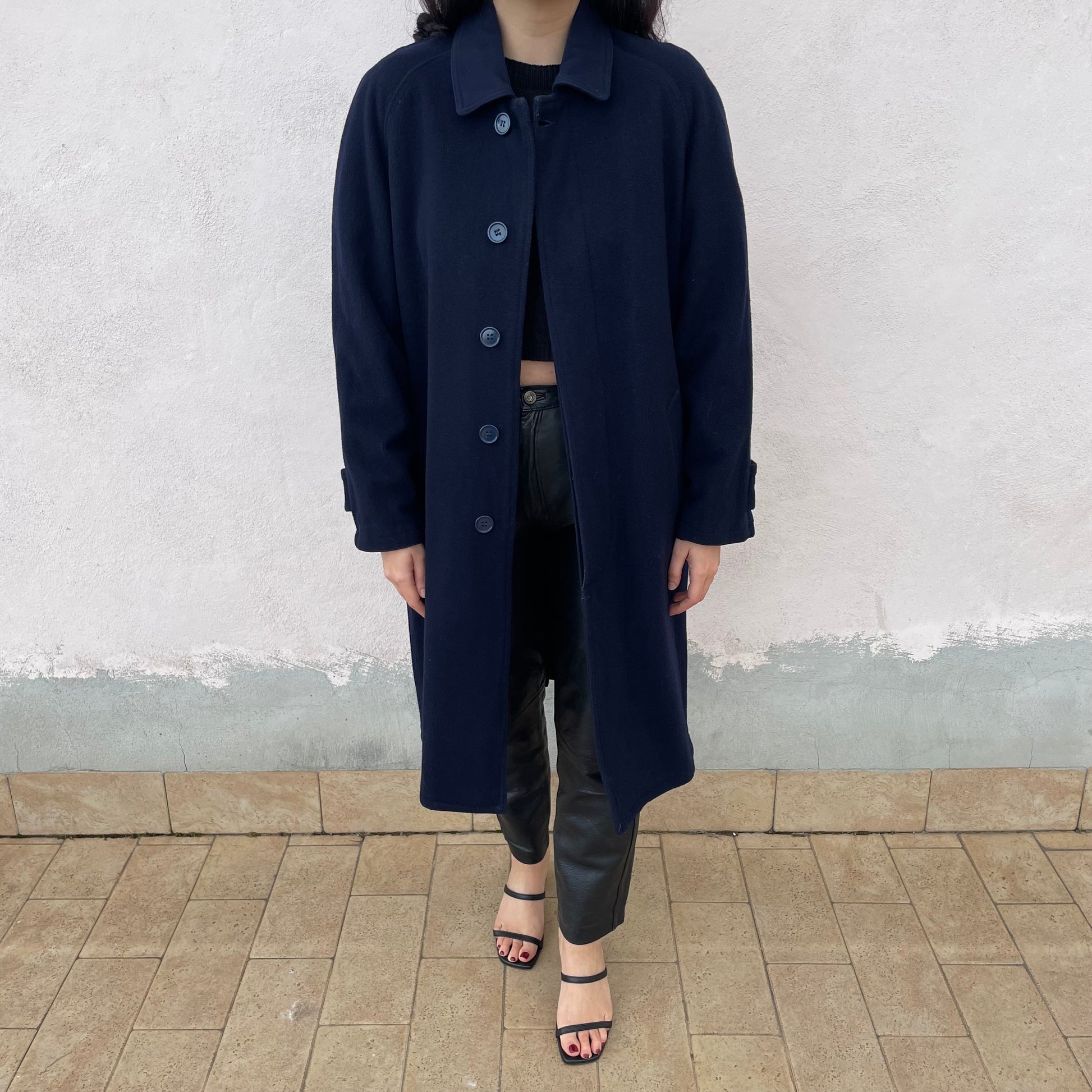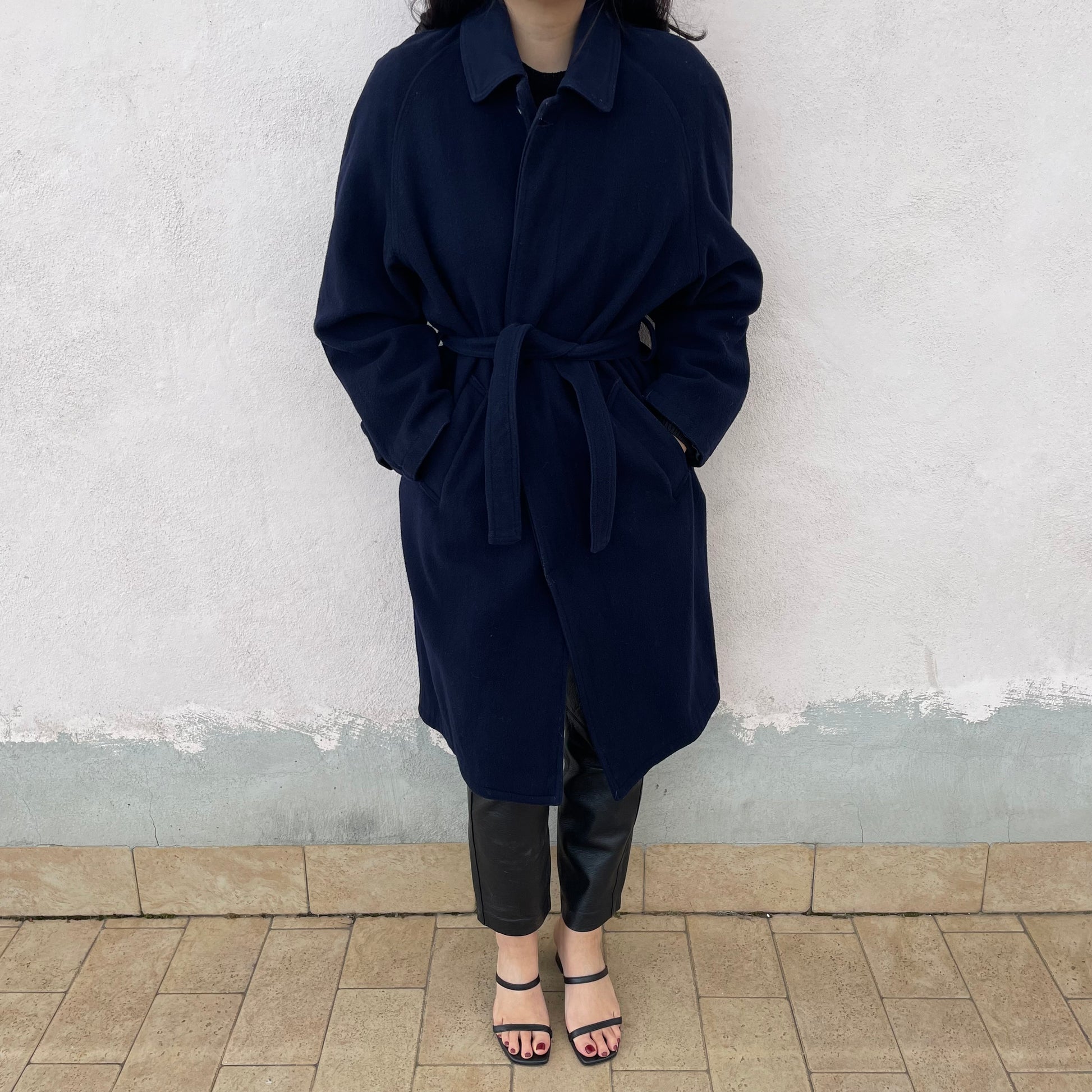 Cappotto blu monopetto con cintura. 80% lana 20% poli.