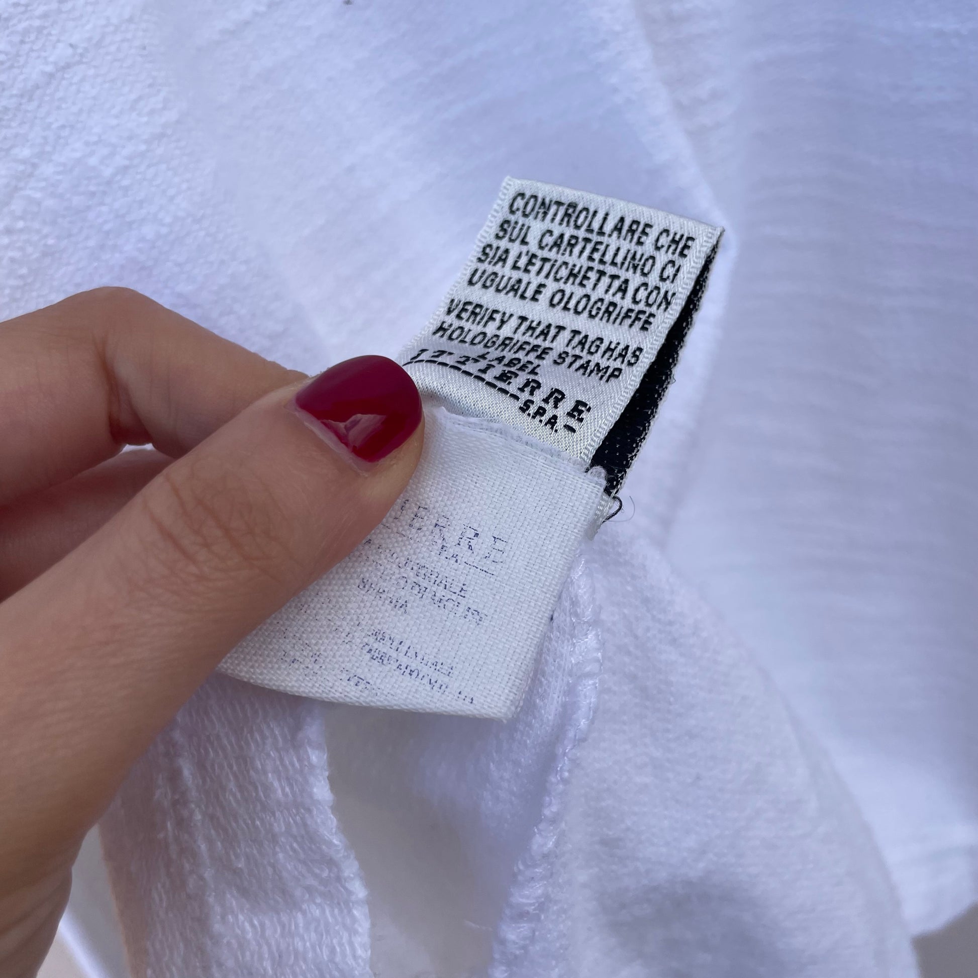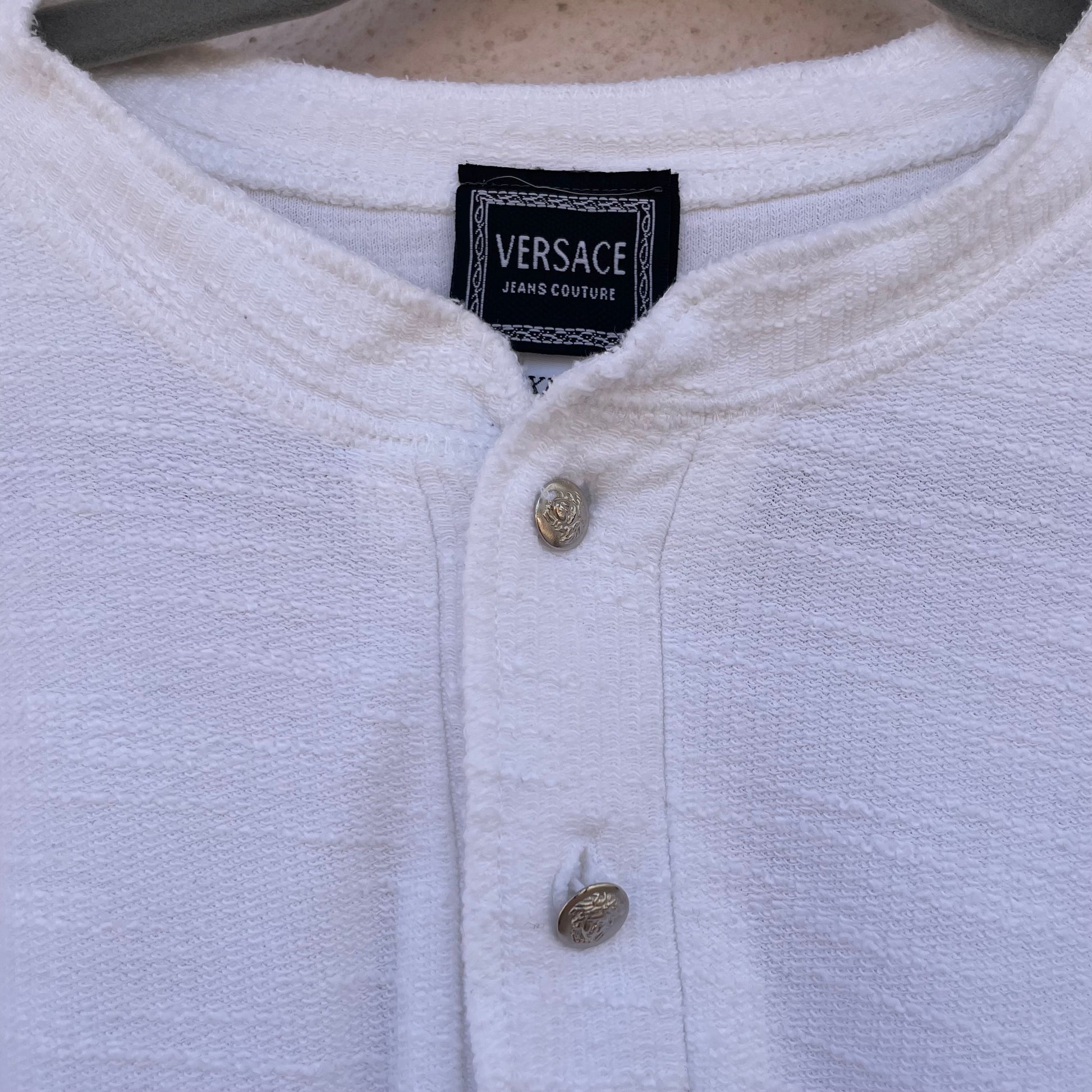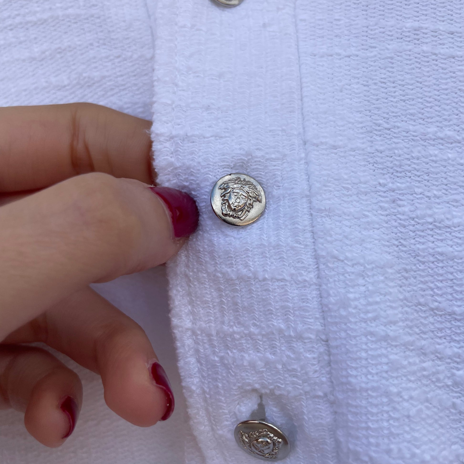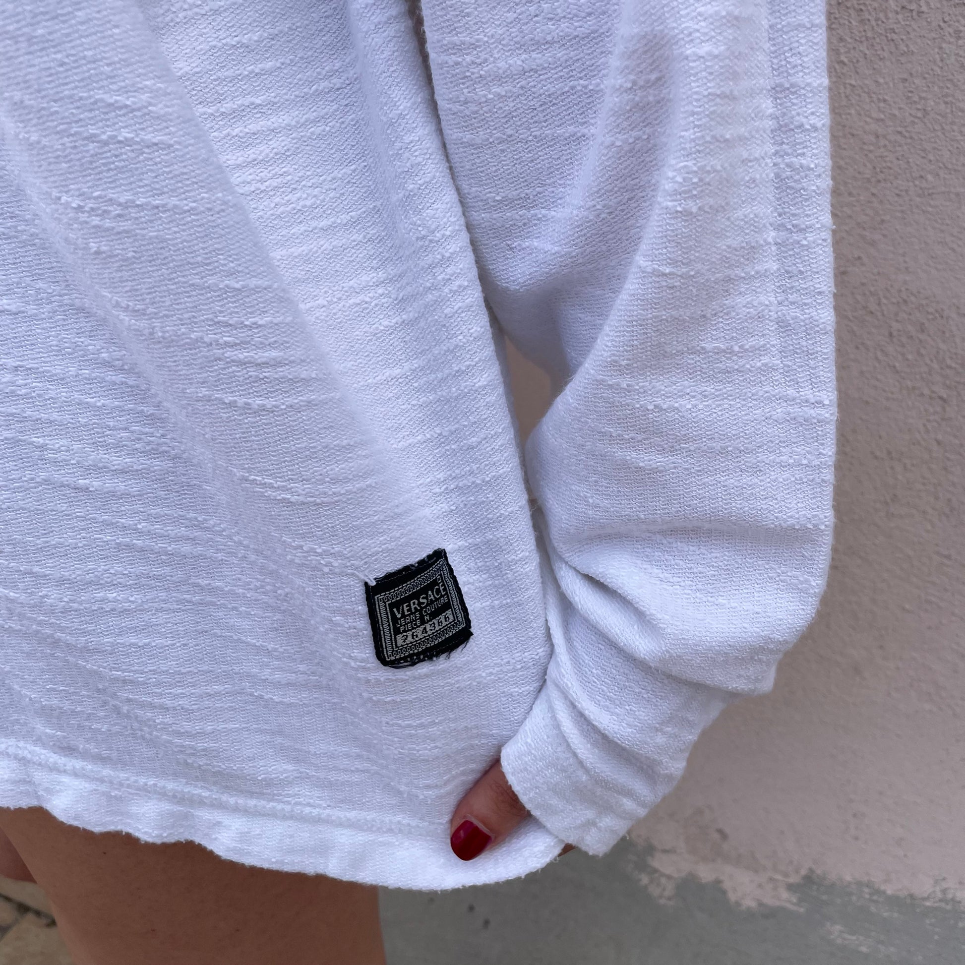 Maxi pull indossabile come mini abito Versace. Non si legge l’etichetta della composizione, suppongo sia un misto cotone (tipo felpa garzata). Bottoni argentati con meduse. Etichetta con logo sul fondo. Si è staccato l’ollgramma (vedi foto).