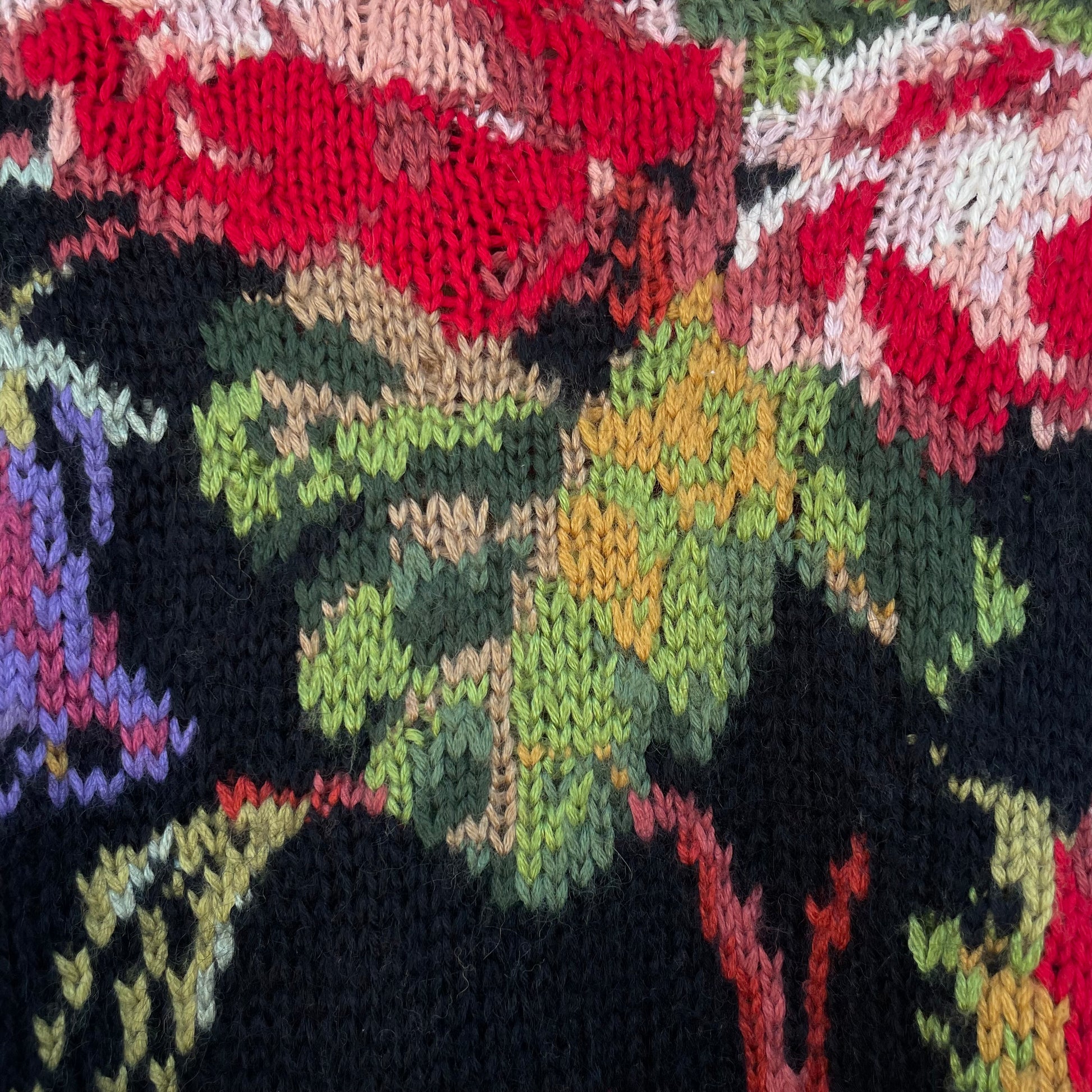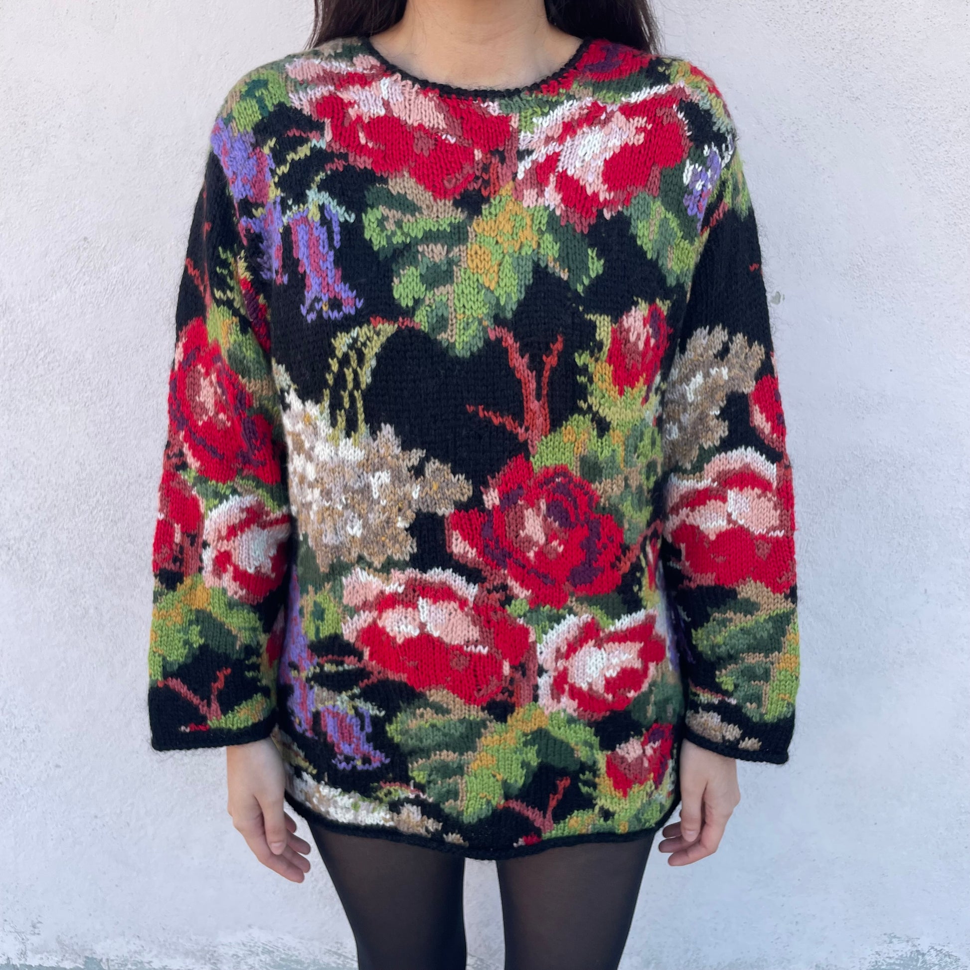 Maxi pull base nera fantasia floreale. 25% mohair 25% lana 50% acrilico.