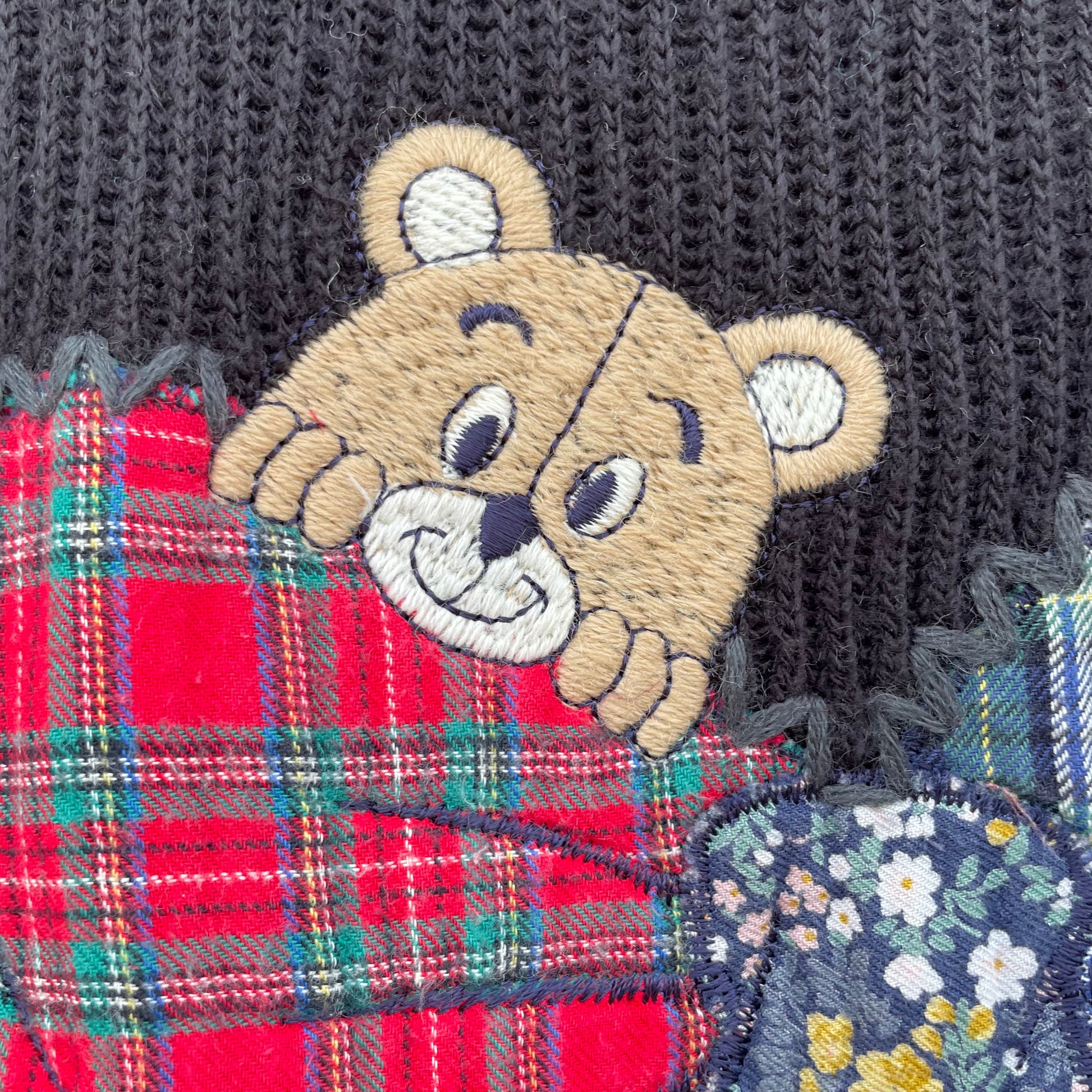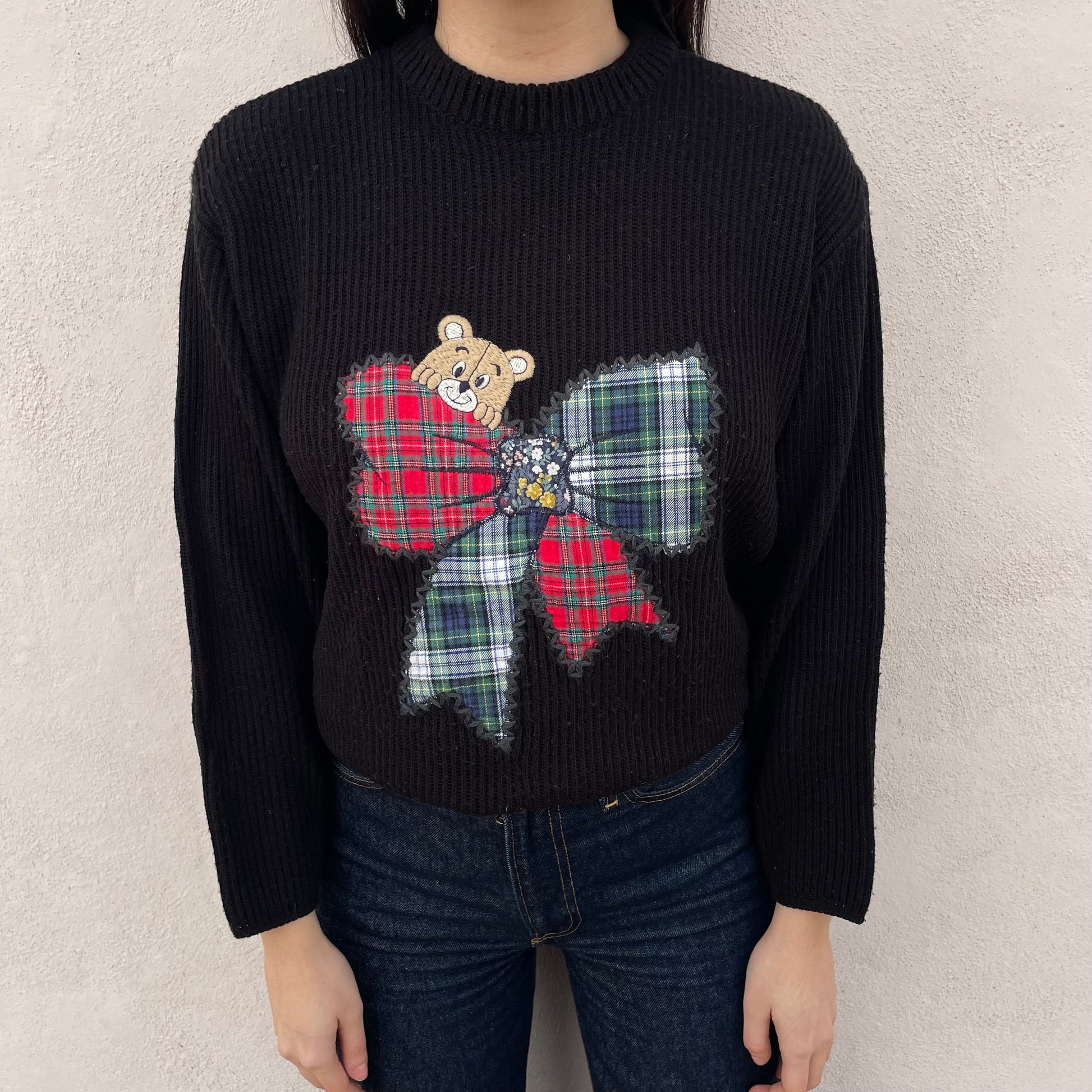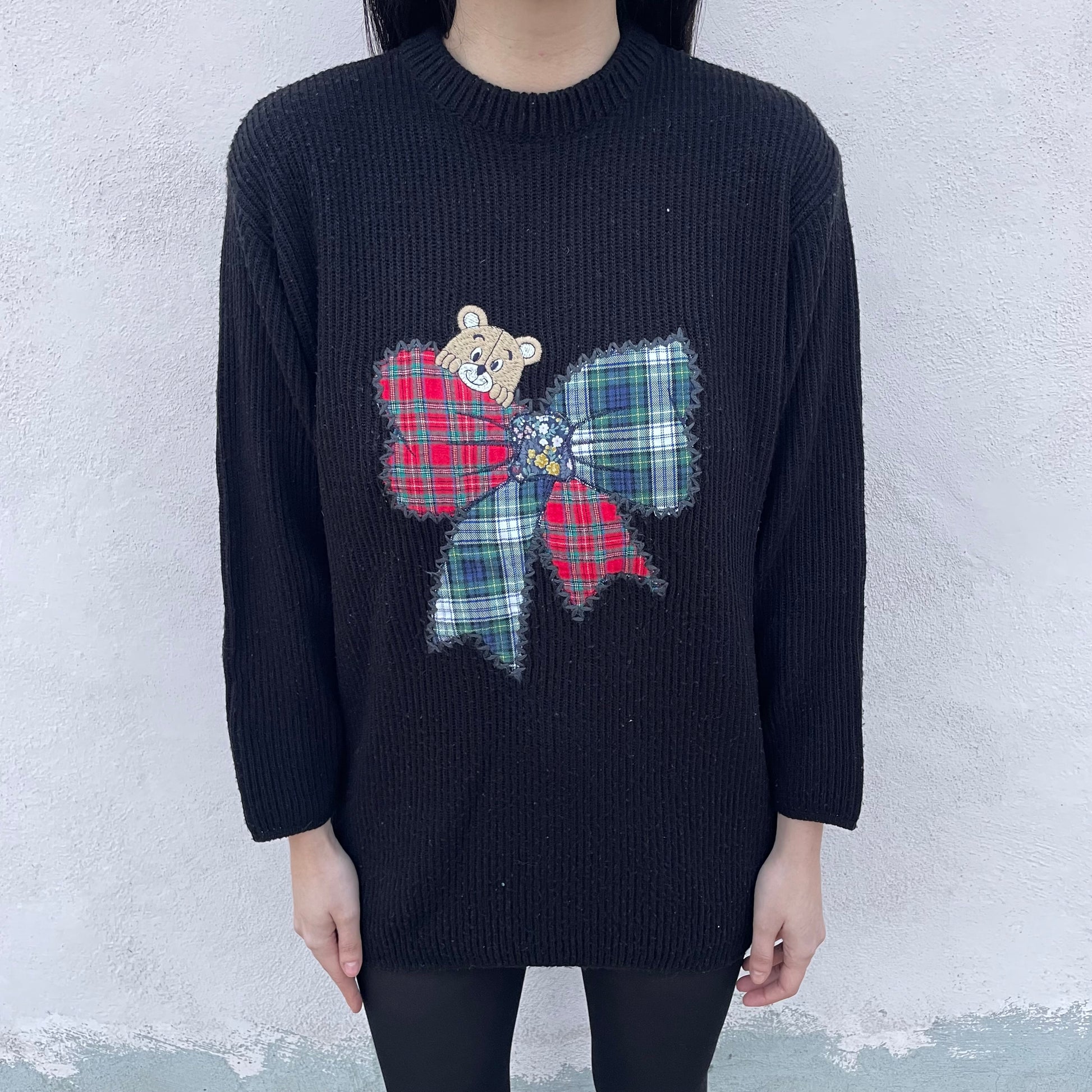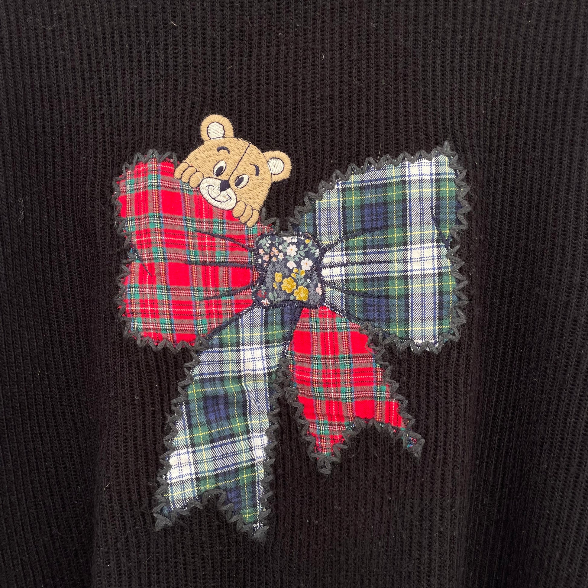 Maxipull nero a coste con orsacchiotto e fiocco tartan. 50% lana 50% acrilico.